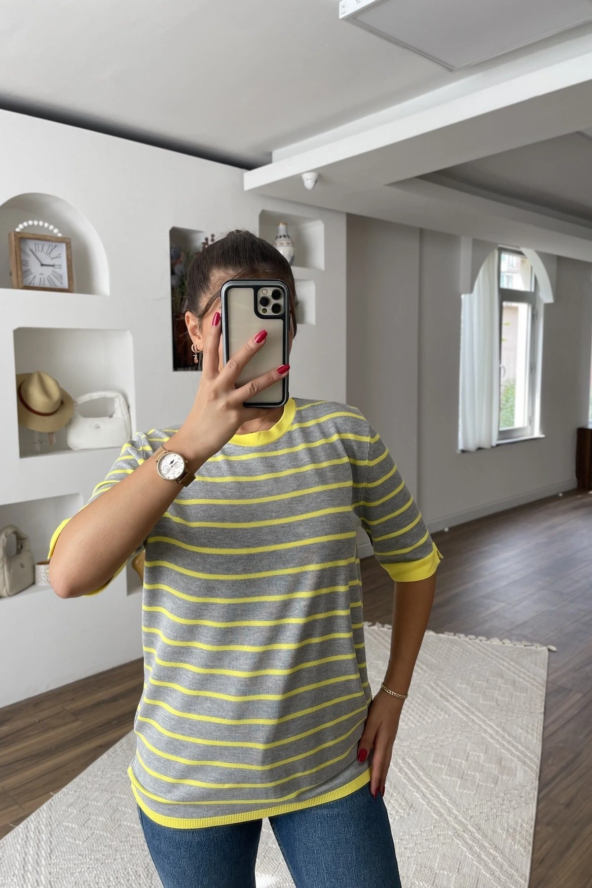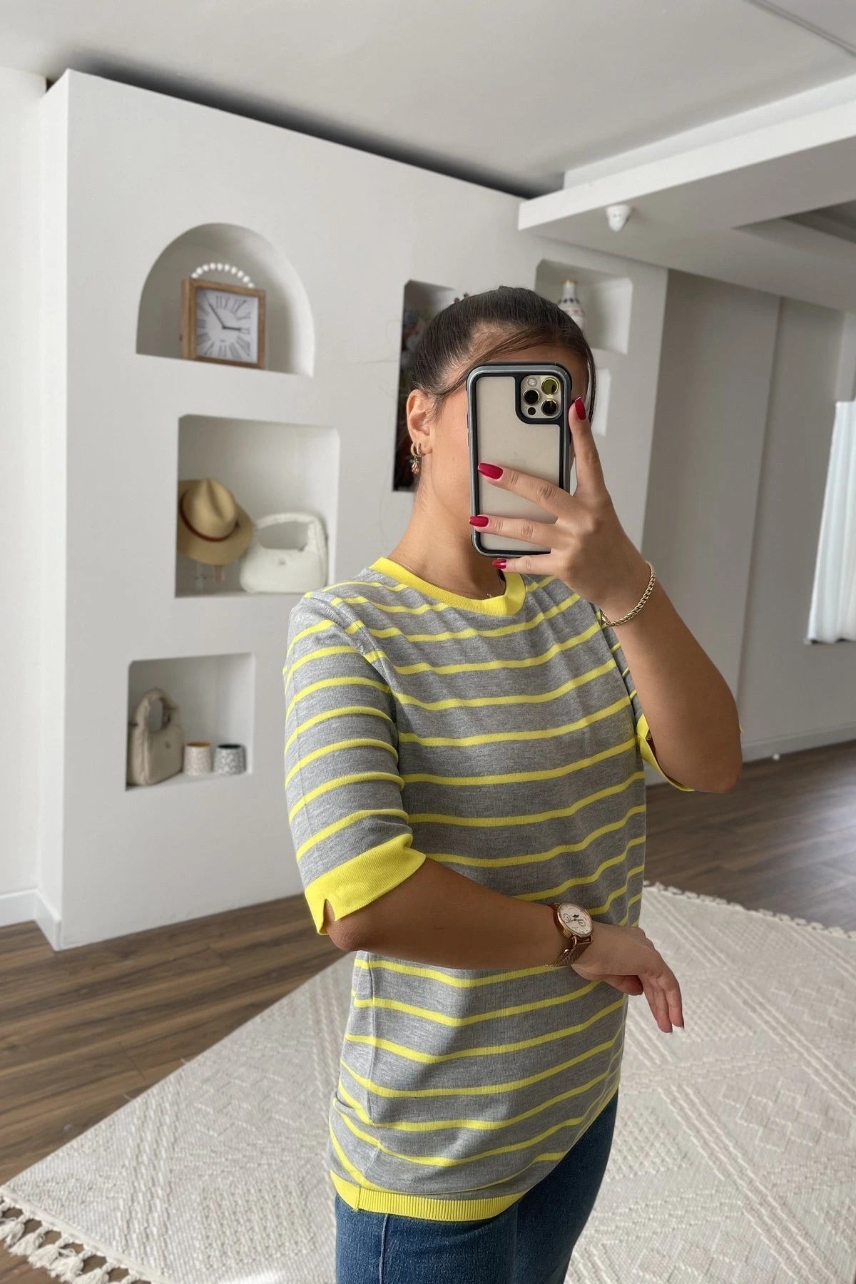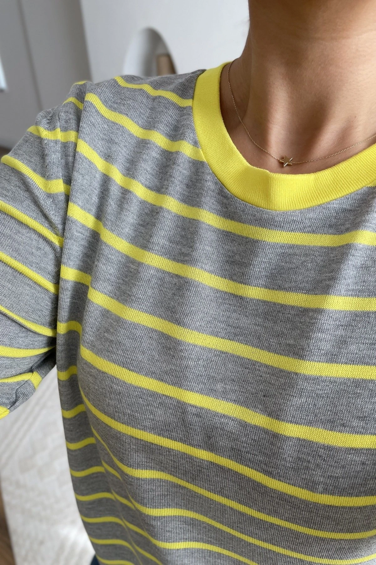 KISA KOL ÇİZGİLİ BASİC VİSKON TRİKO – SARI / A.GRİ