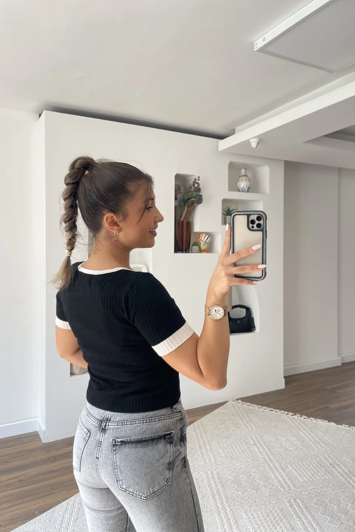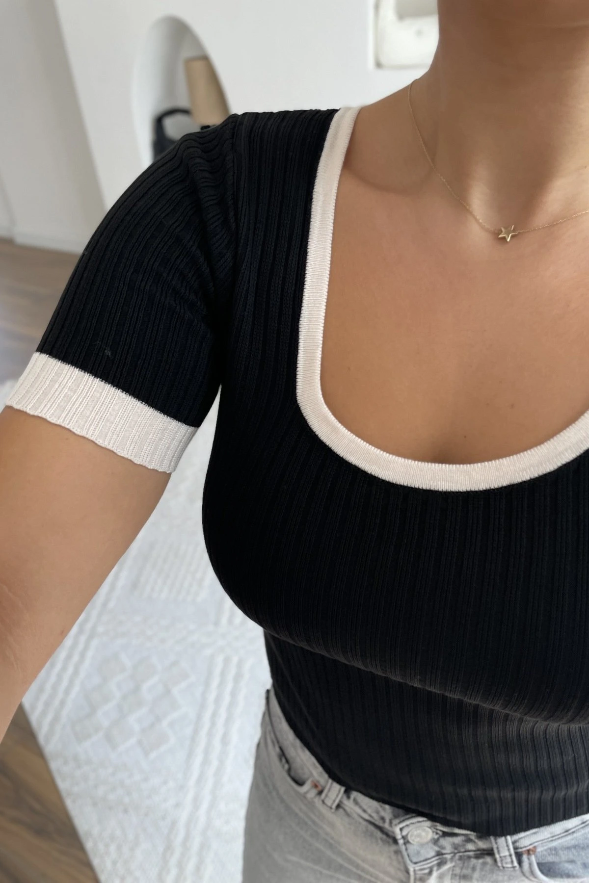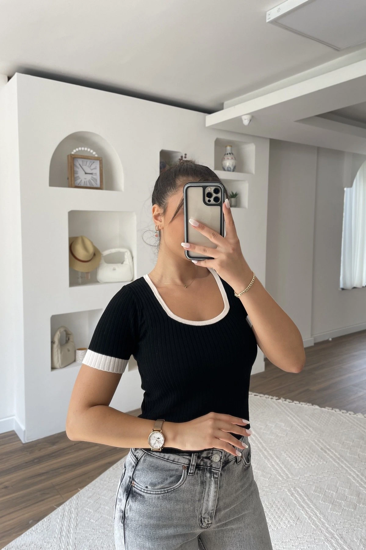 KOL VE YAKA ŞERİT U YAKA FİTİLLİ VİSKON TRİKO – SİYAH-KREM