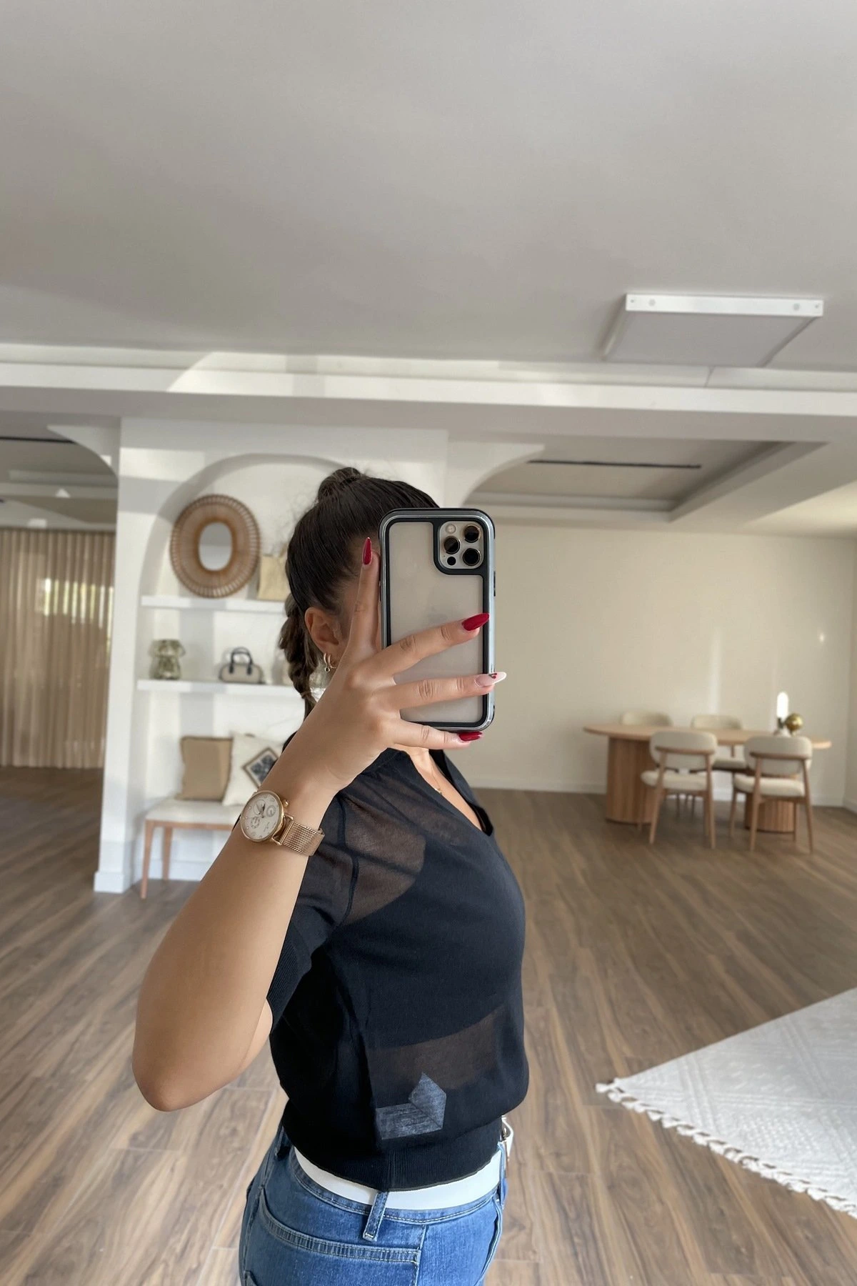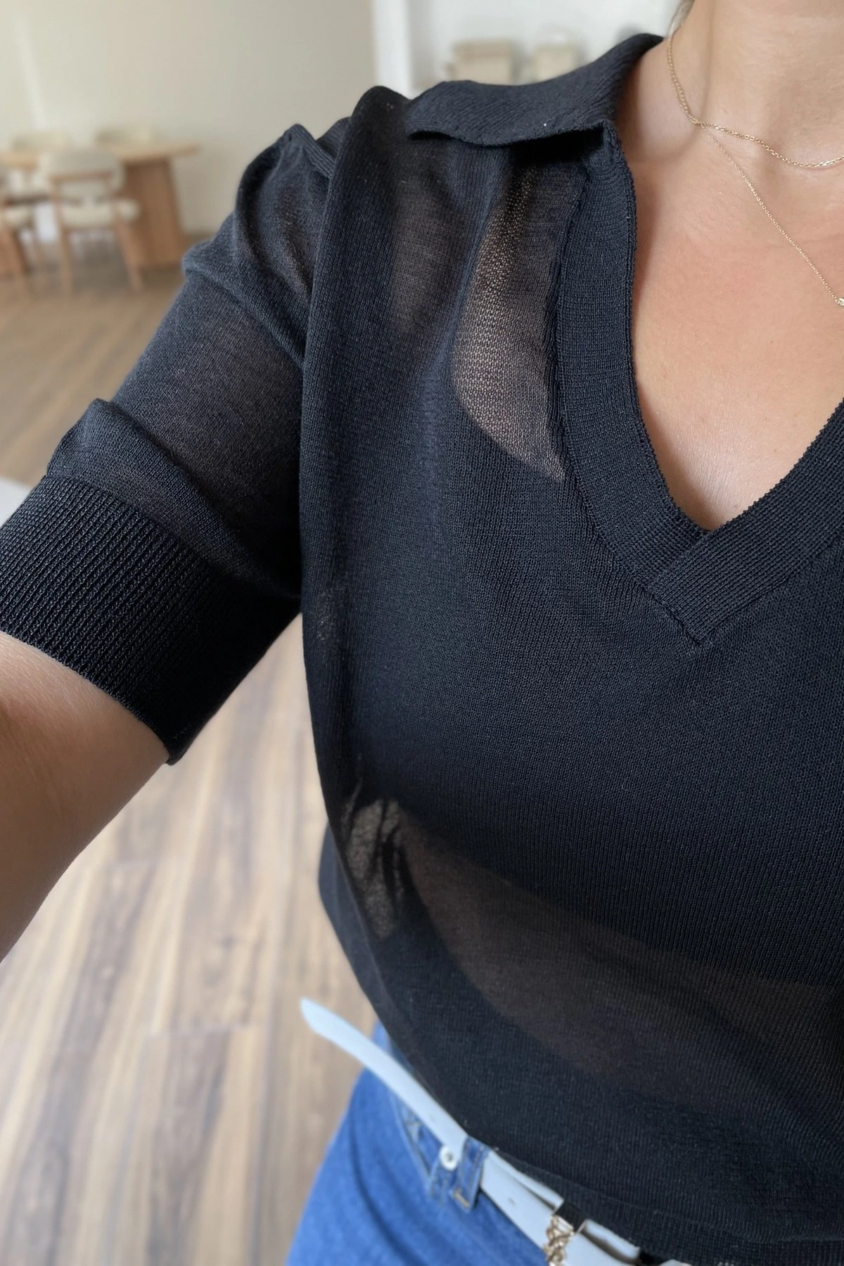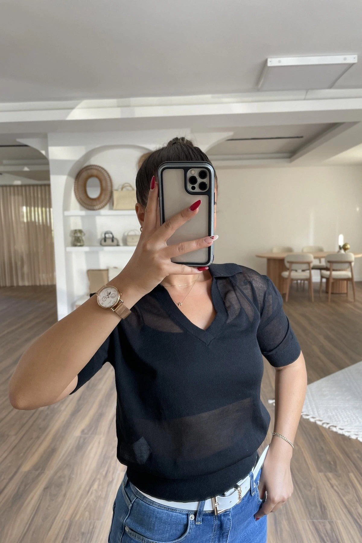 POLO V YAKA İNCE TRİKO BLUZ – SİYAH