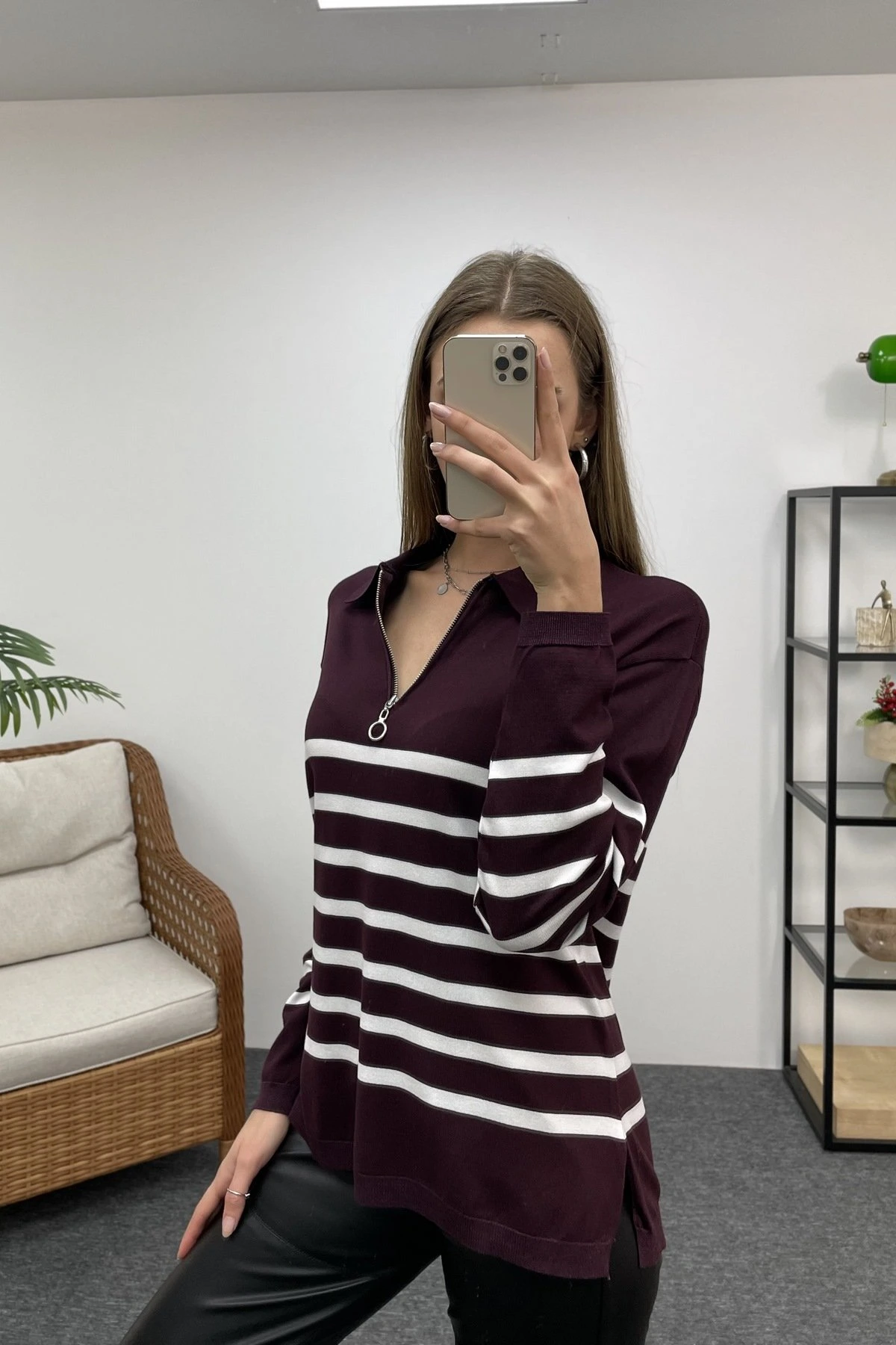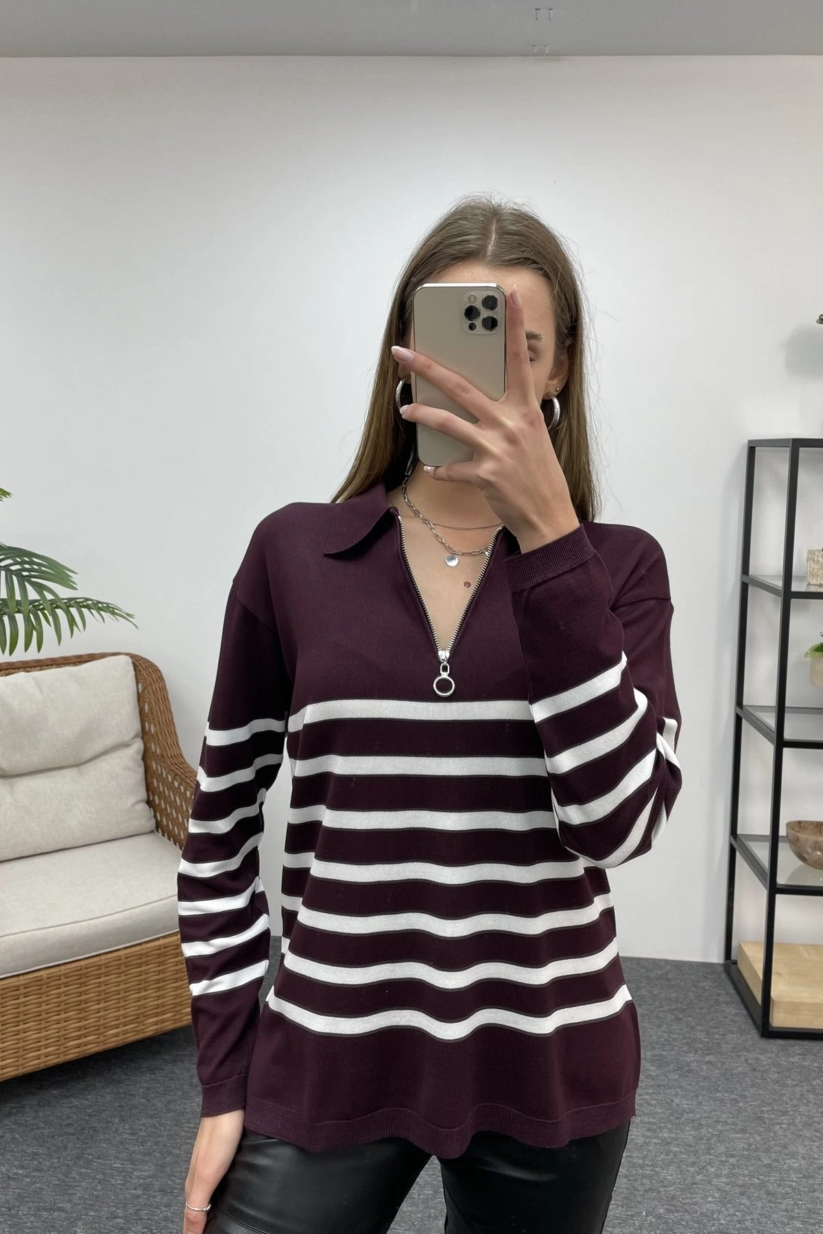 POLO YAKA ÇİZGİLİ FERMUARLI TRİKO – MÜRDÜM