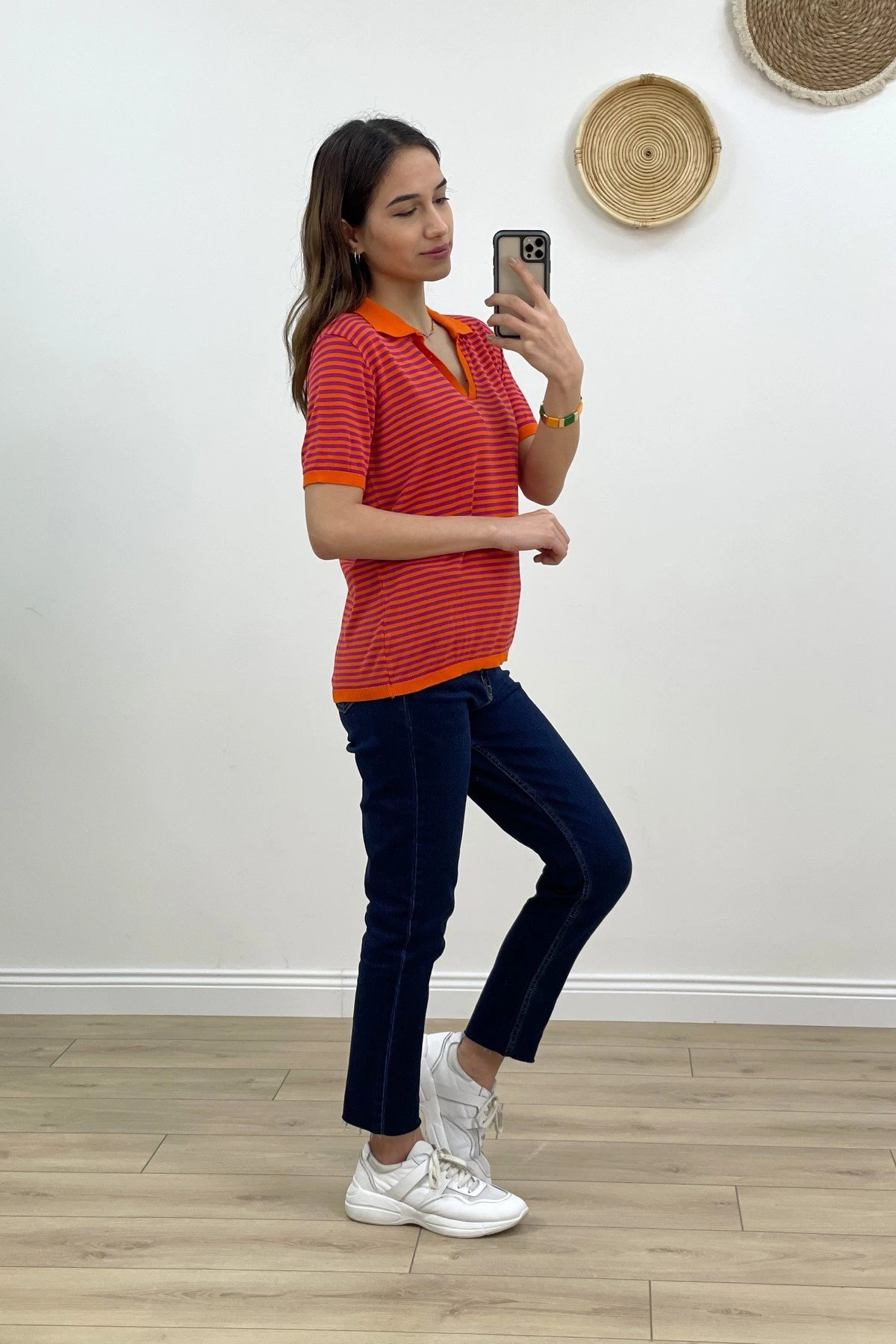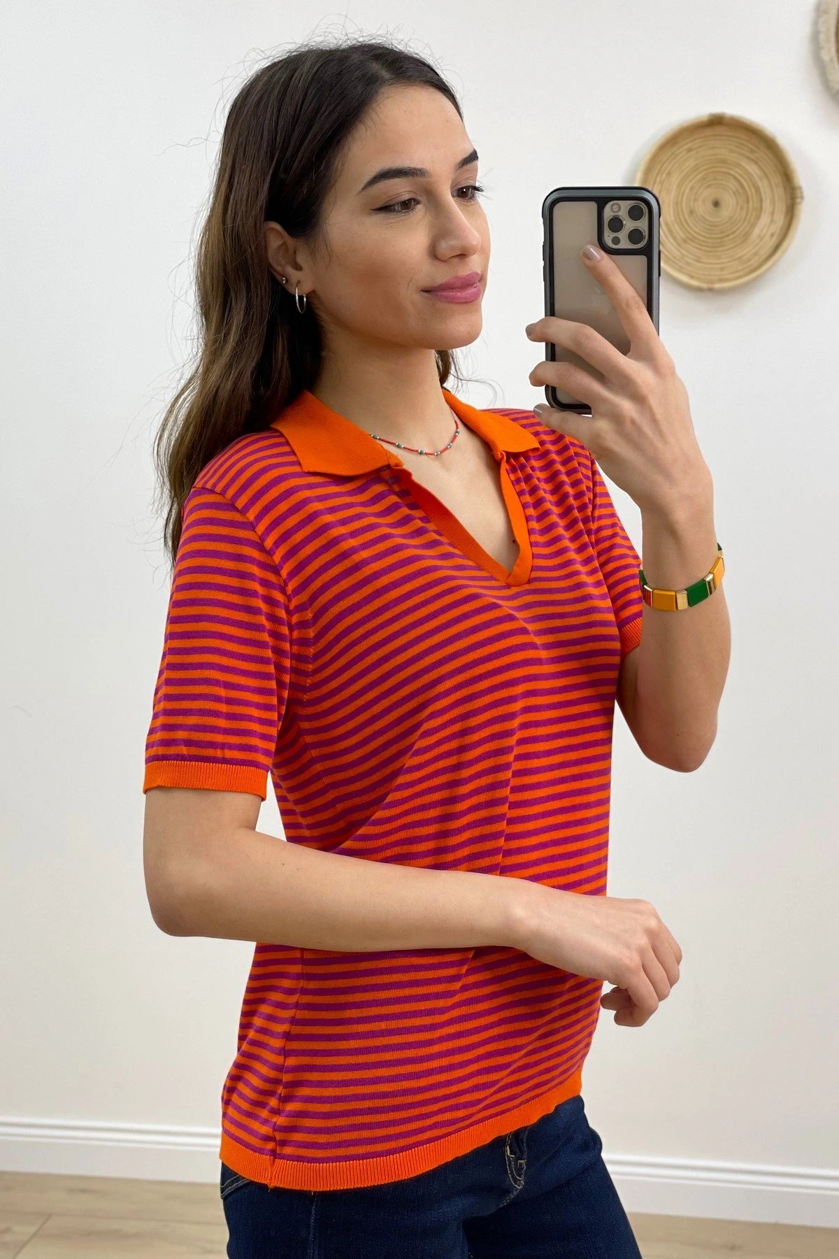 POLO YAKA ÇİZGİLİ KISA KOL İNCE TRİKO – ORANGE FUŞYA