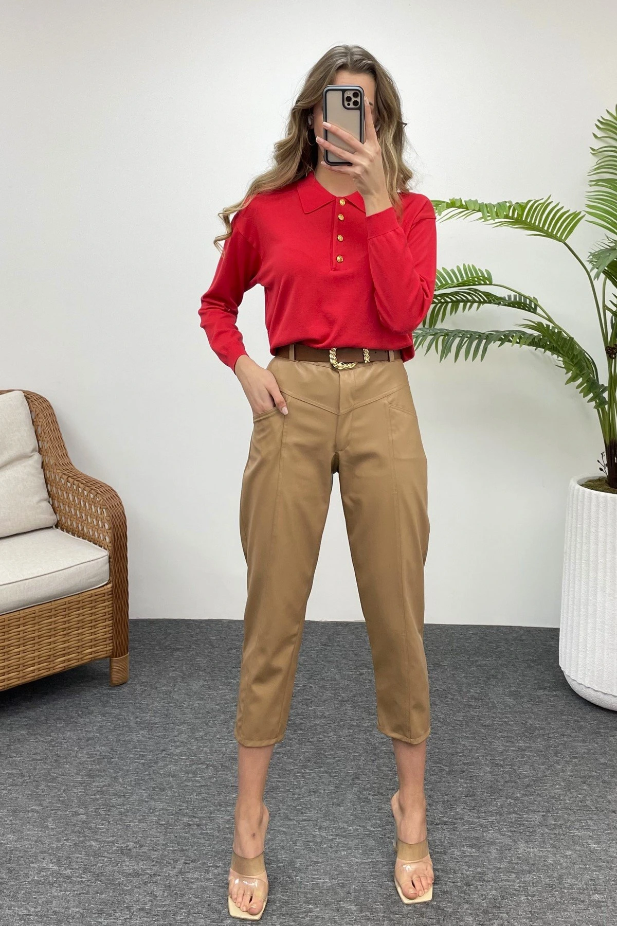 DİZ DİKİŞİ DETAY DERİ PANTOLON - SÜTLÜ KAHVE