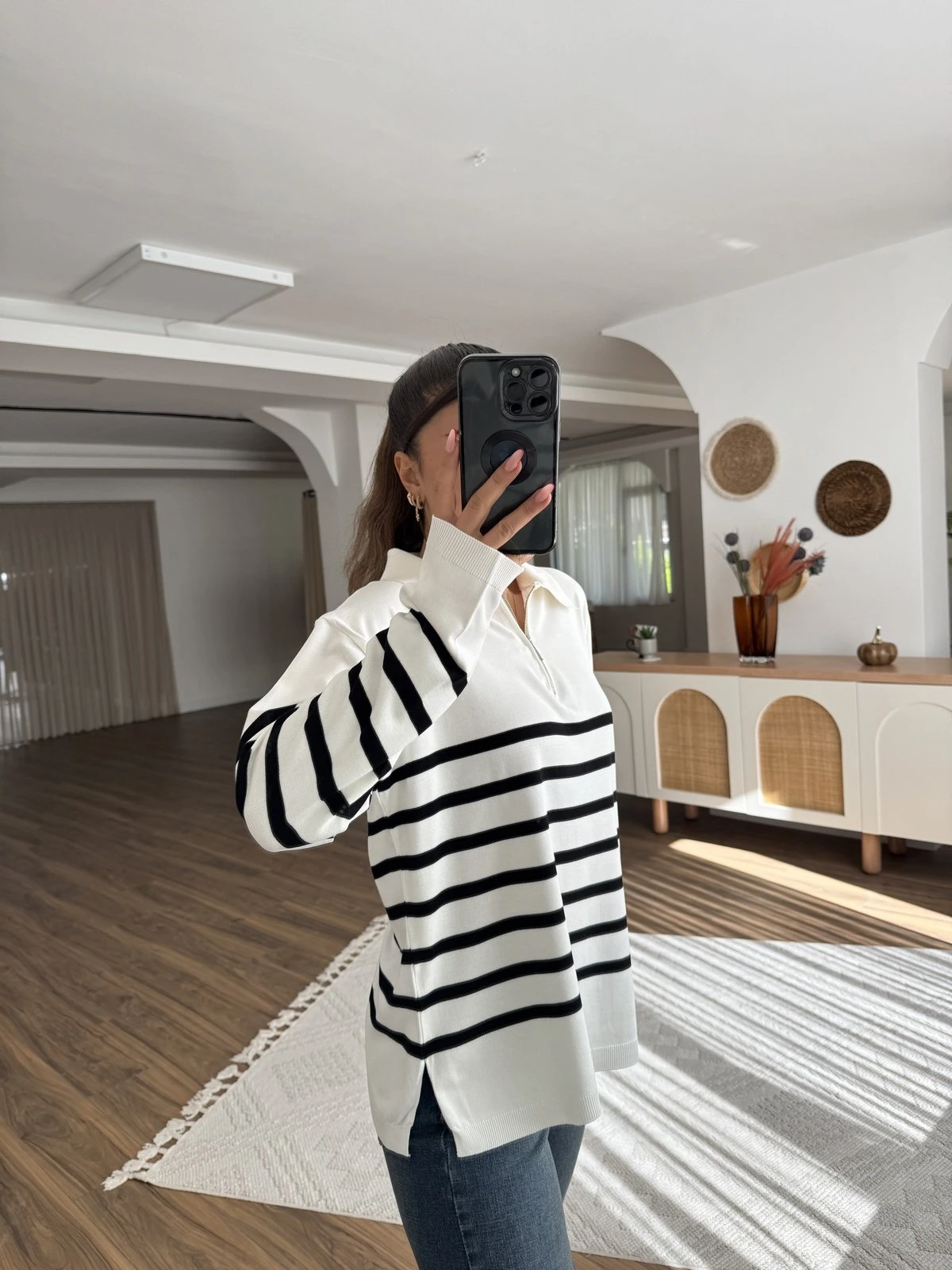 POLO YAKA FERMUARLI ÇİZGİLİ VİSKON TRİKO – EKRU SİYAH