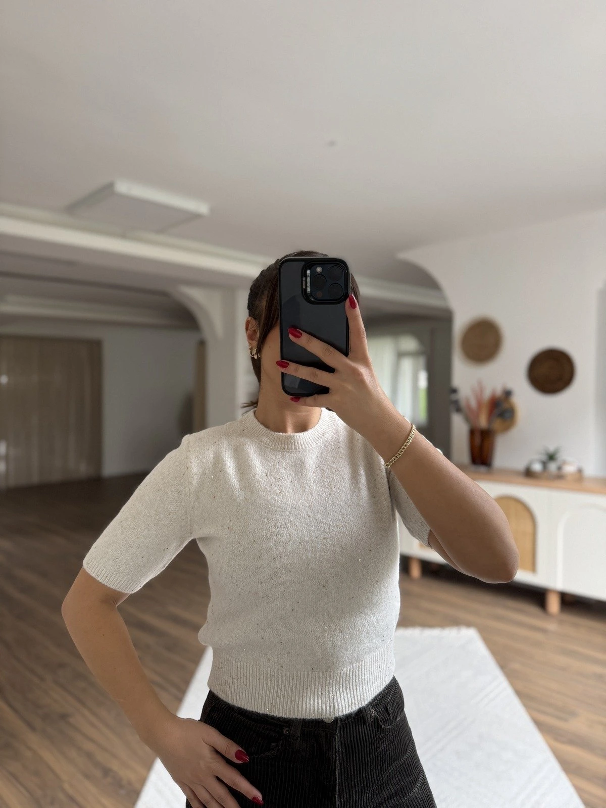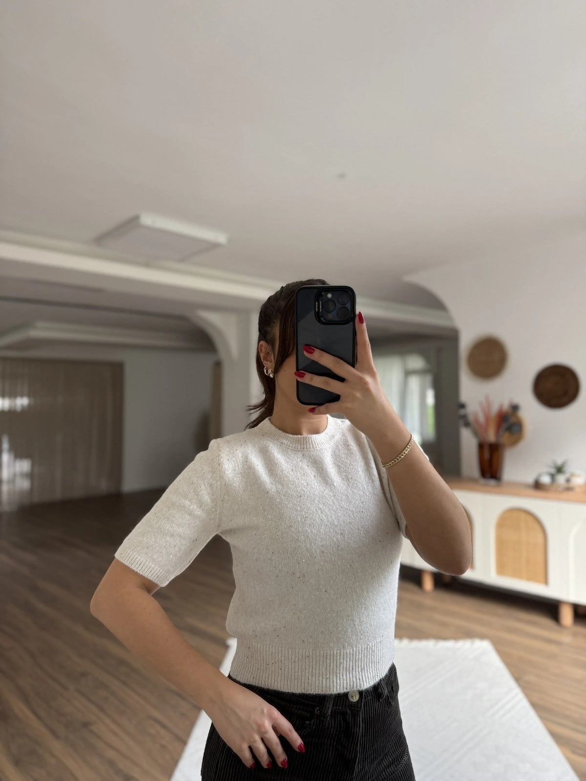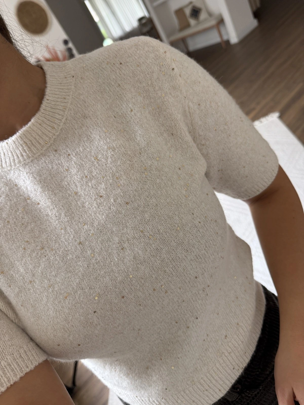 PULLU SİMLİ YÜN KARIŞIM KISA KOL TRİKO – KREM