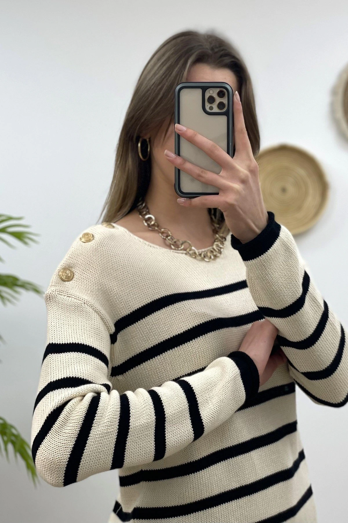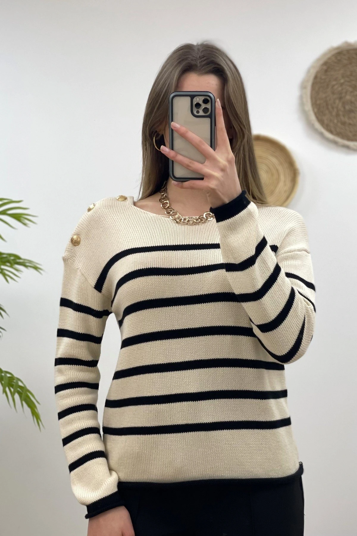 TEK OMUZ DÜĞME ÇİZGİLİ MERSERİZE TRİKO – SİYAH-KREM
