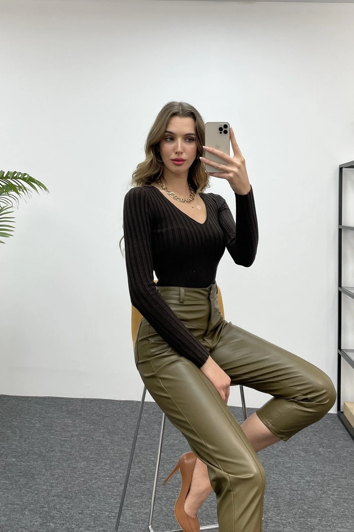V YAKA FİTİLLİ LİKRALI TRİKO – KAHVE