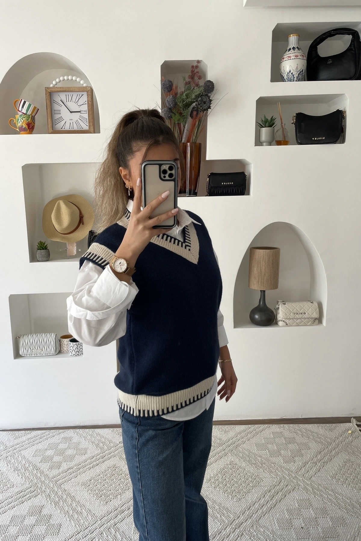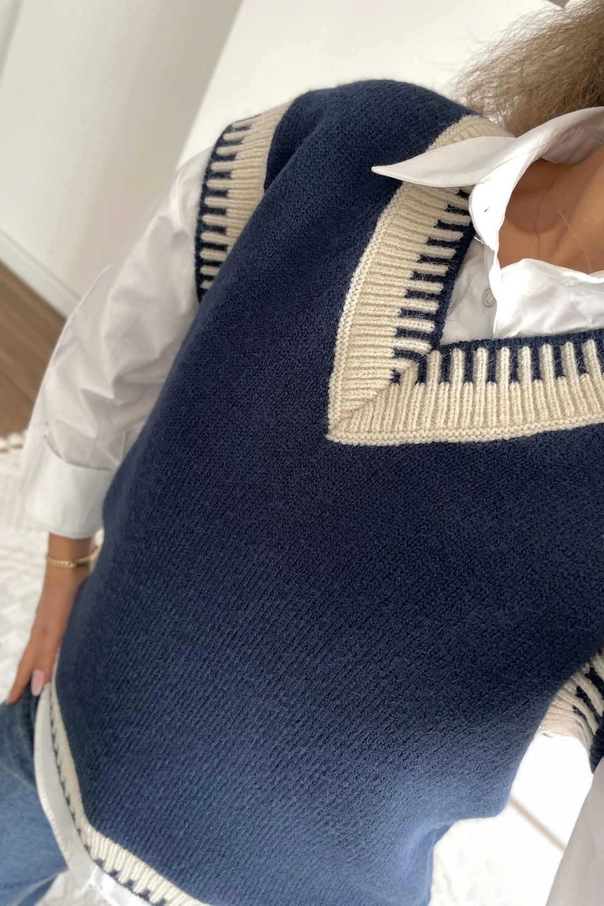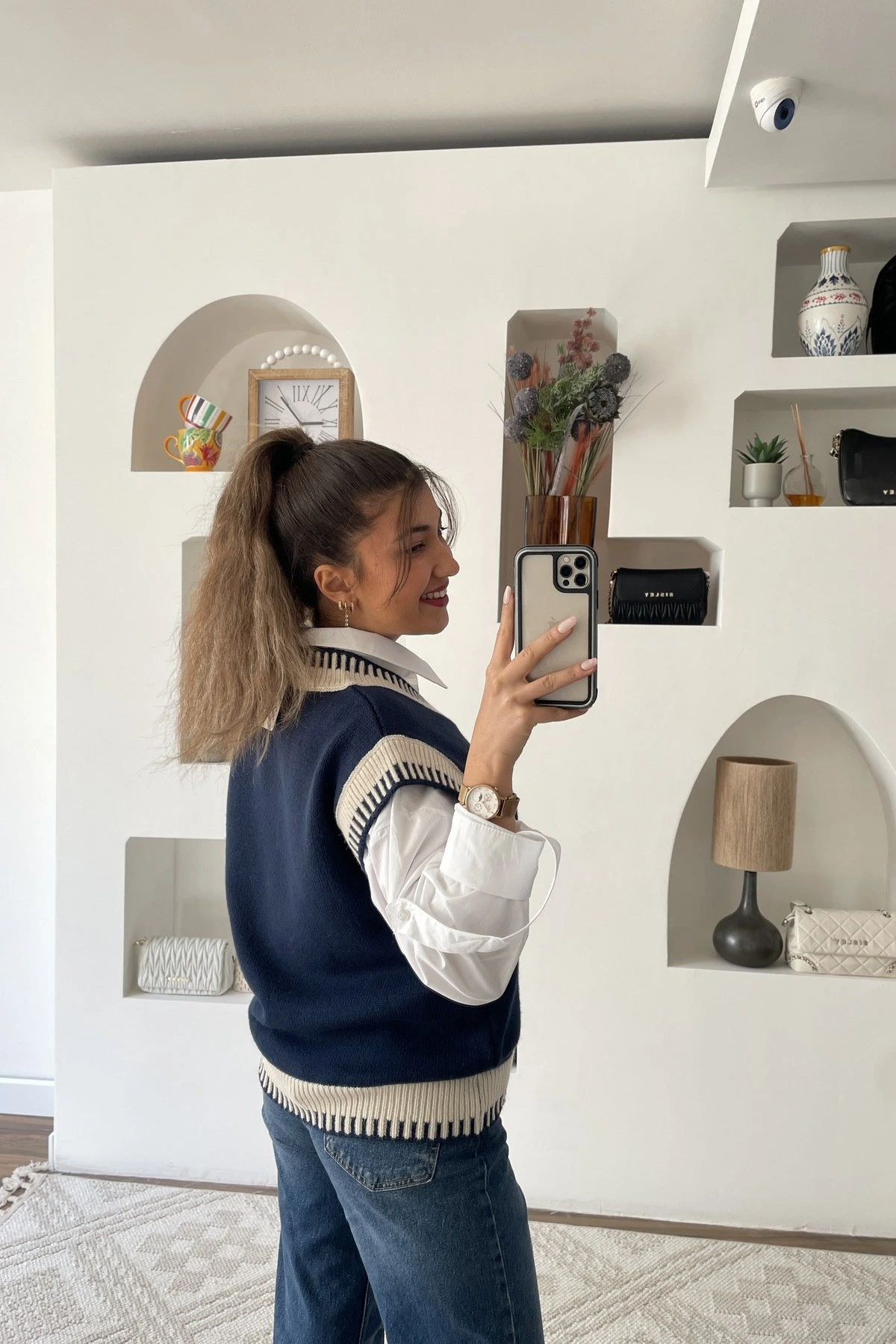 V YAKA KENAR LASTİK ÖRME SALAŞ SÜETER – LACİVERT