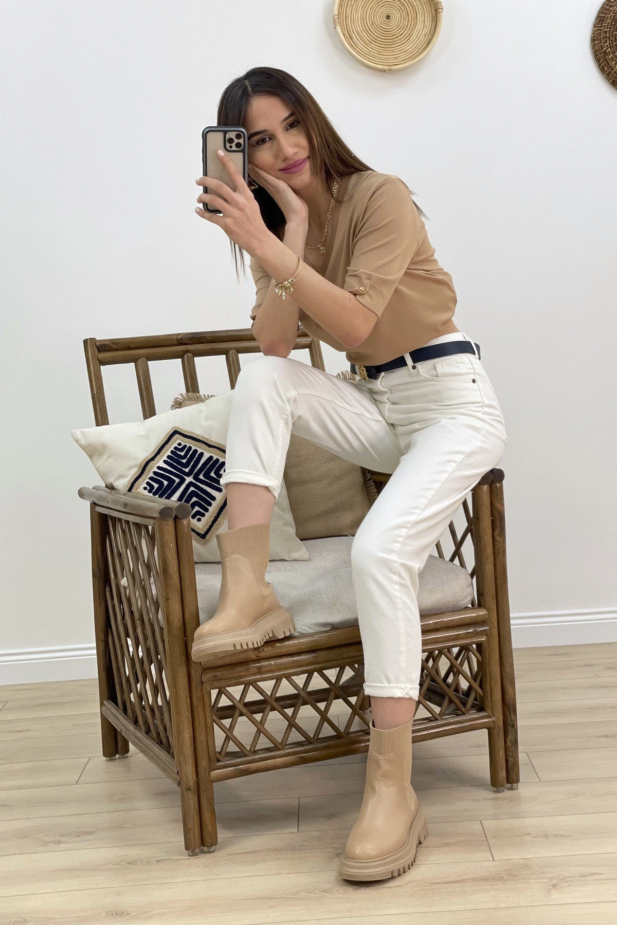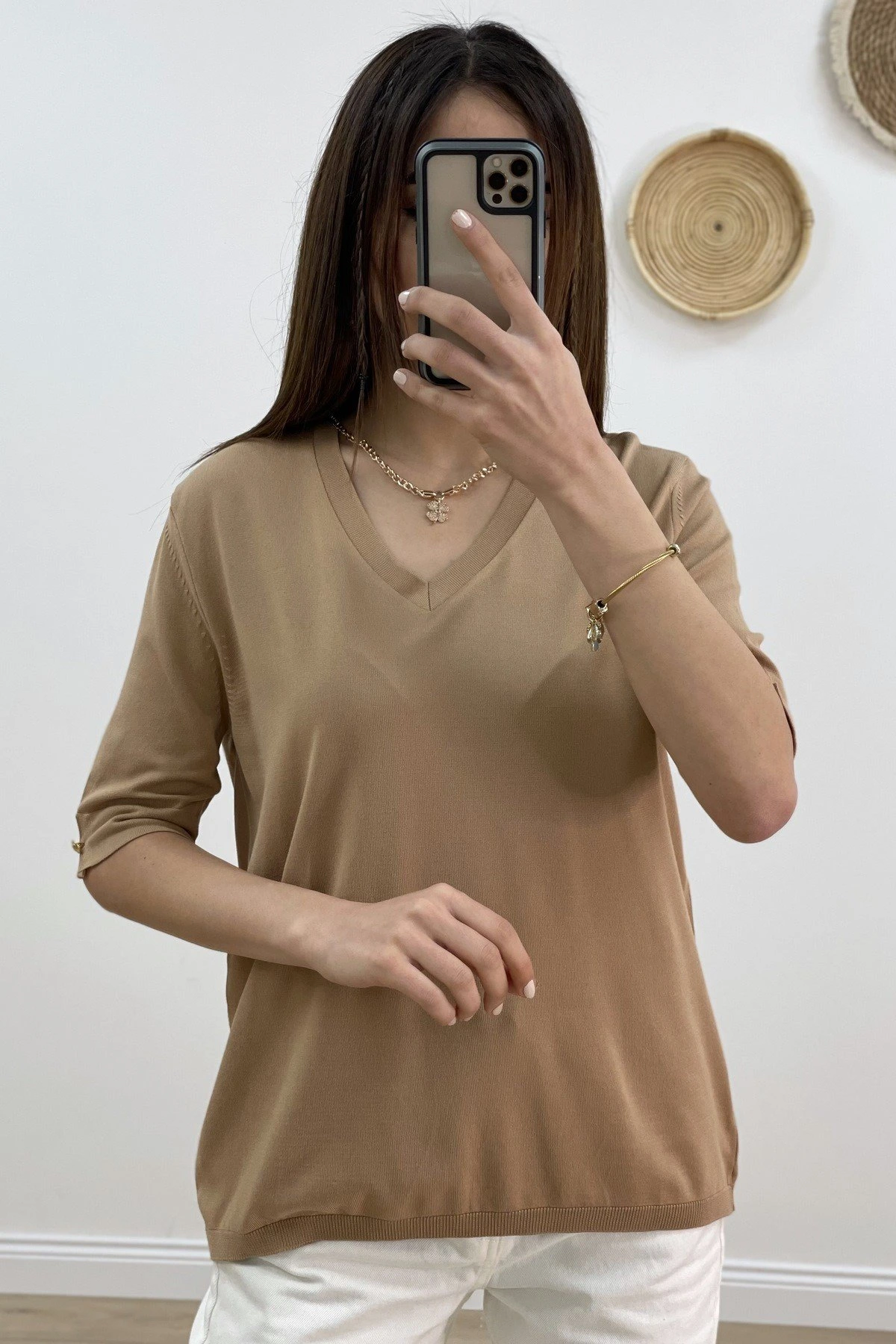 V YAKA KOL UCU DÜĞMELİ VİSKON TRİKO – CAMEL