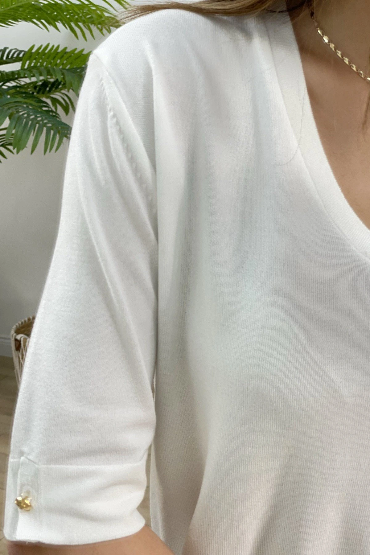 V YAKA KOL UCU DÜĞMELİ VİSKON TRİKO – EKRU