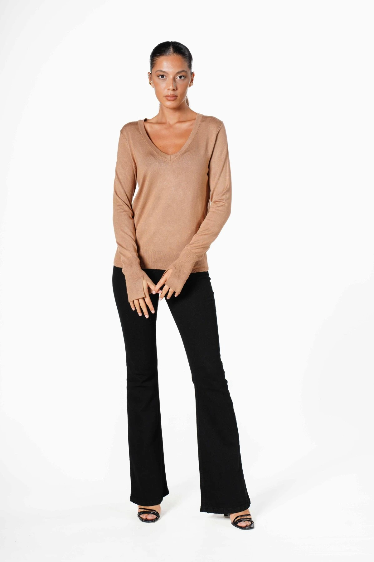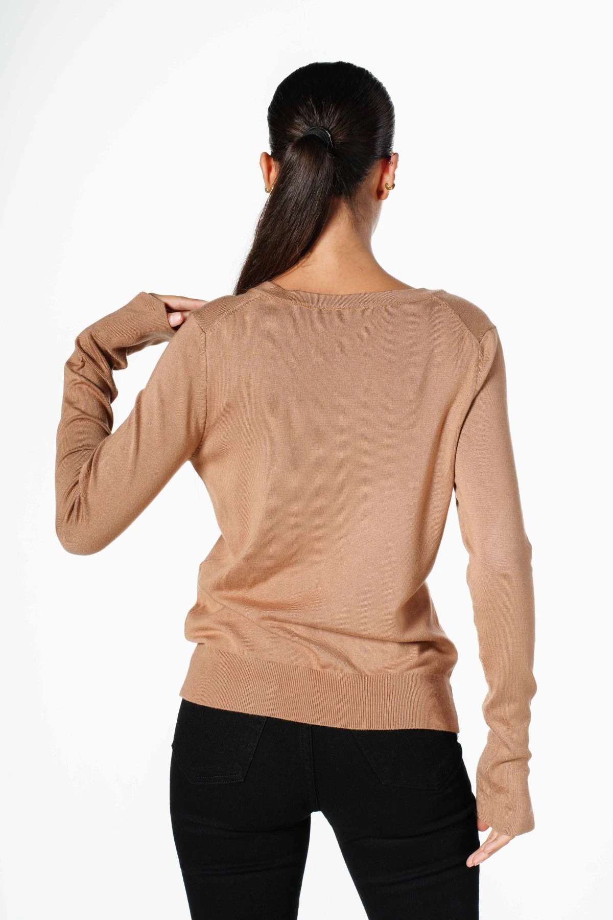 V YAKA KOL YIRTMAÇ TRİKO – CAMEL