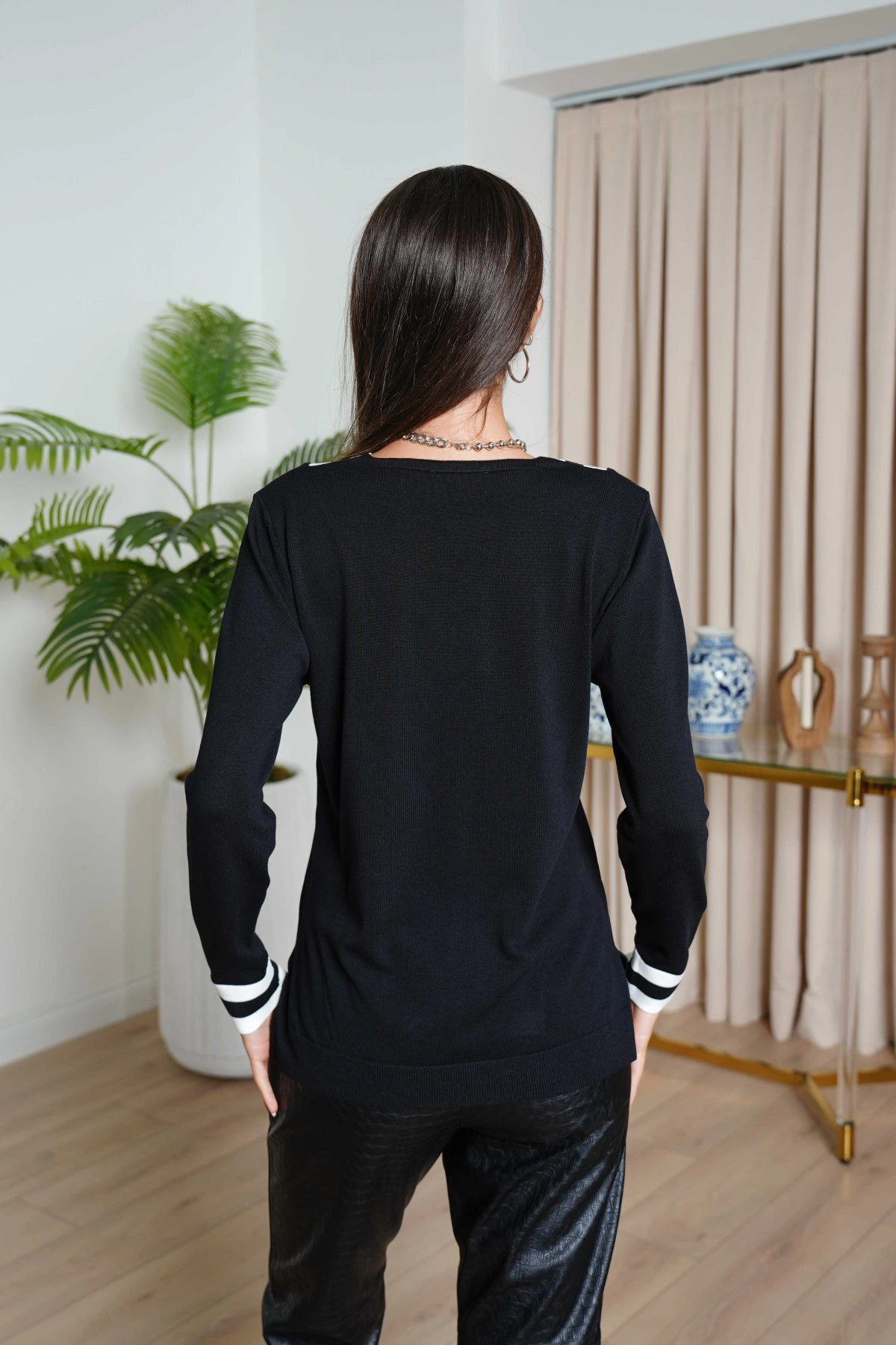 V YAKA ŞERİT DETAY YAN YIRTMAÇLI VİSKON TRİKO – SİYAH