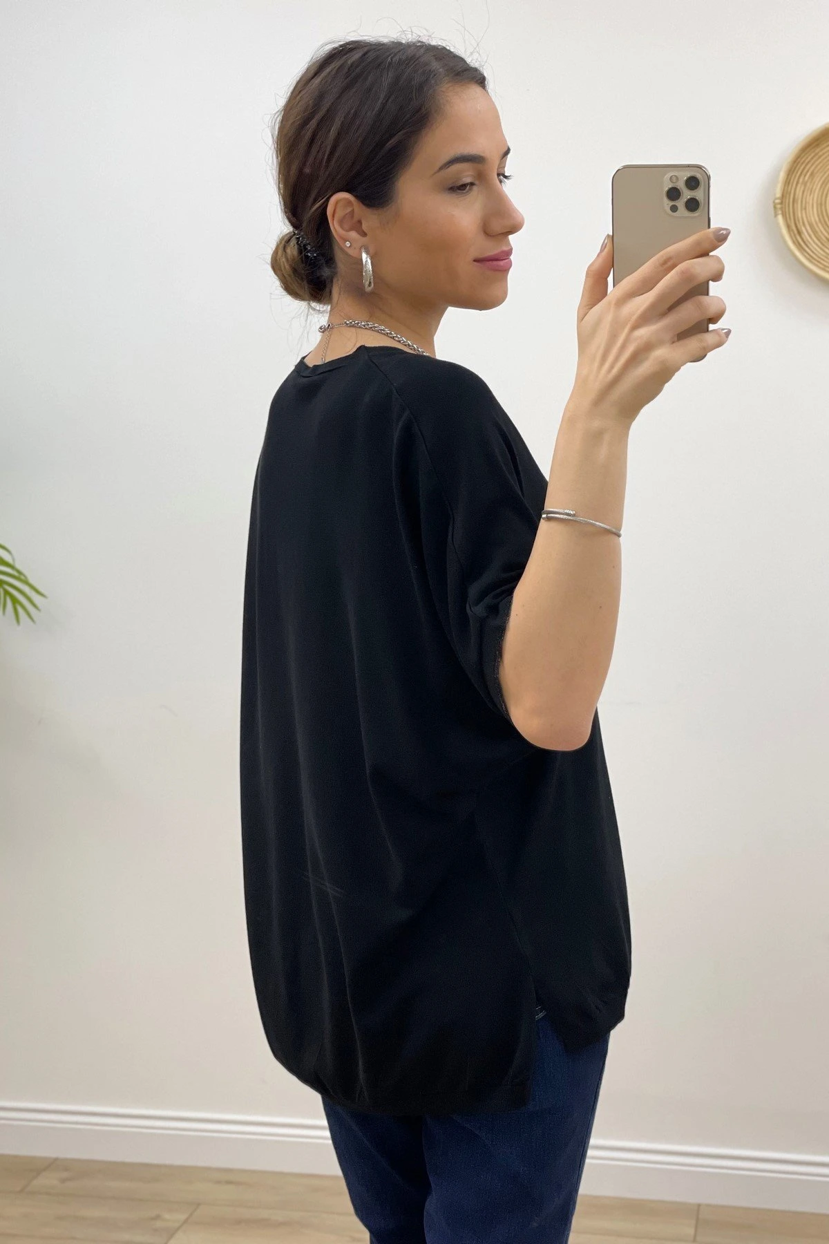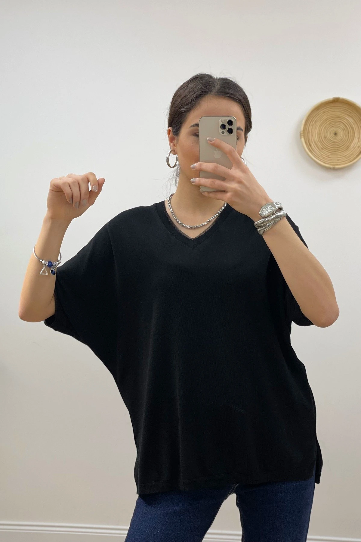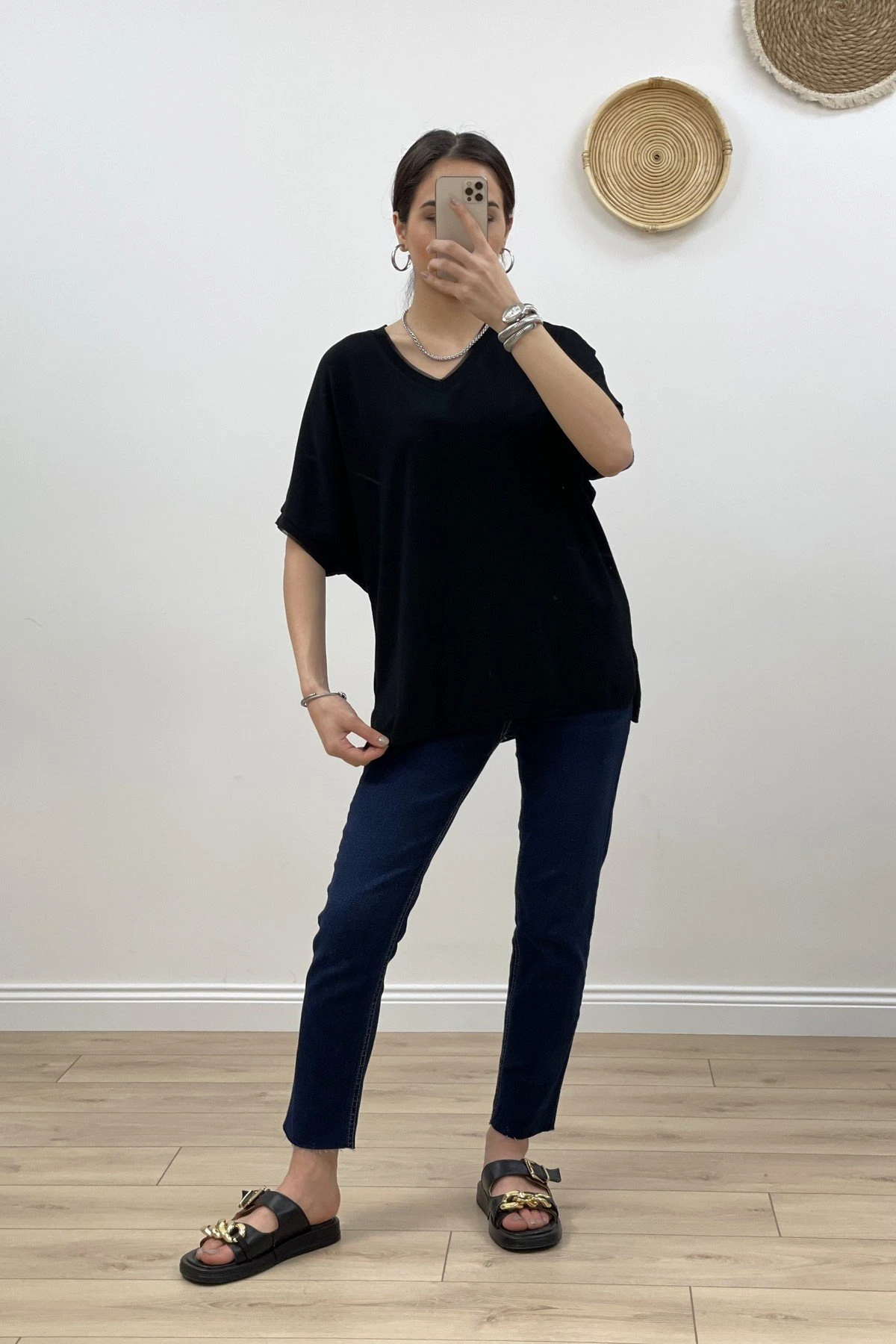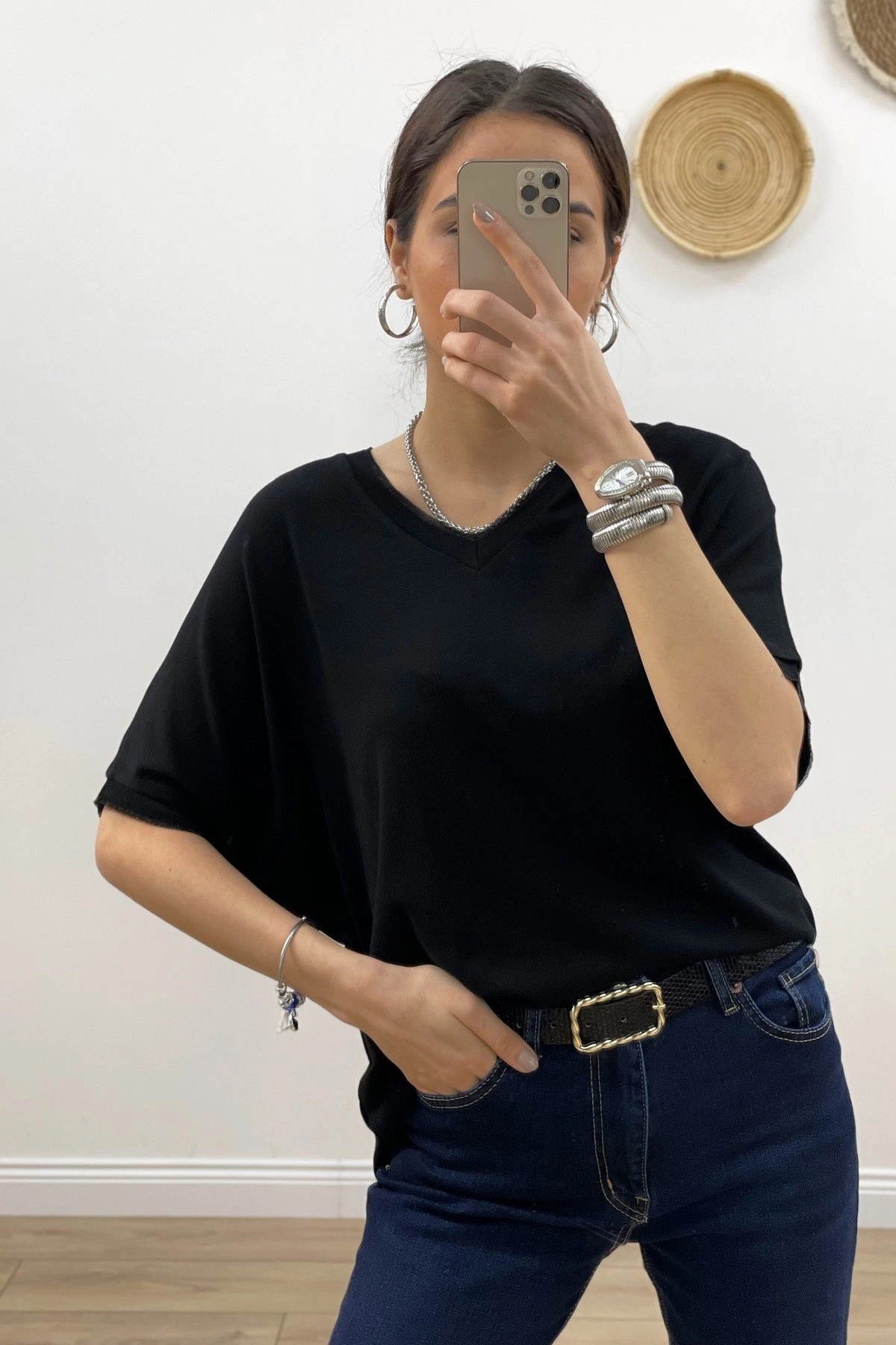 V YAKA VE KOL SİM ŞERİT YARASA KOL TRİKO – SİYAH