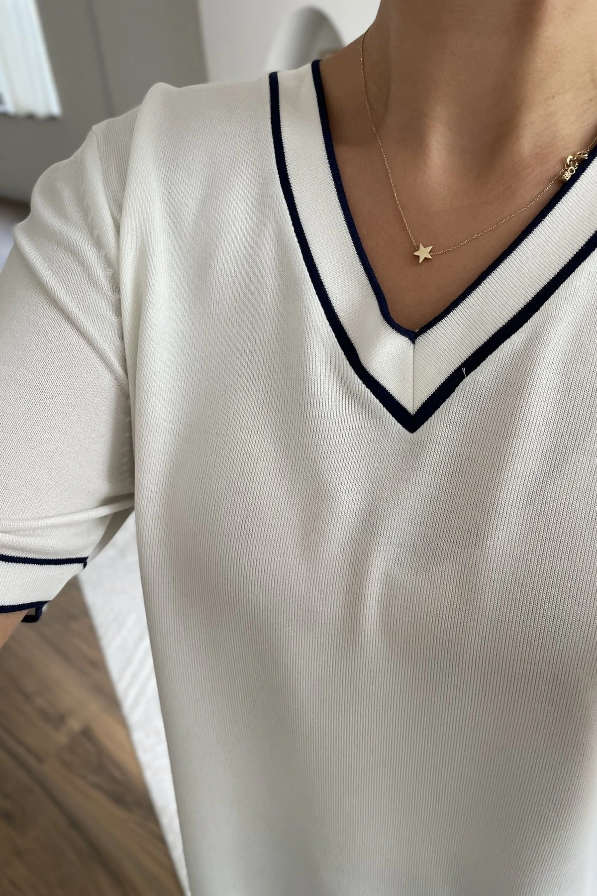 YAKA VE KOL ÇİFT ŞERİT ARKA UZUN V YAKA KISA KOL VİSKON TRİKO – EKRU-LACİ