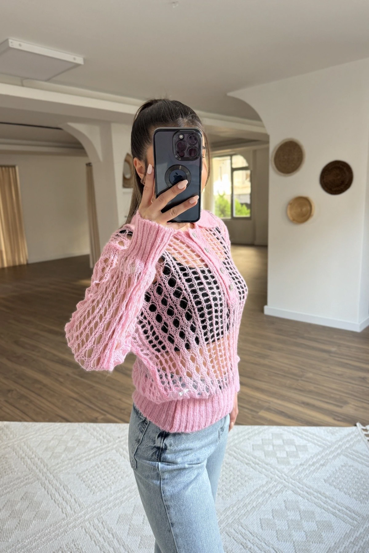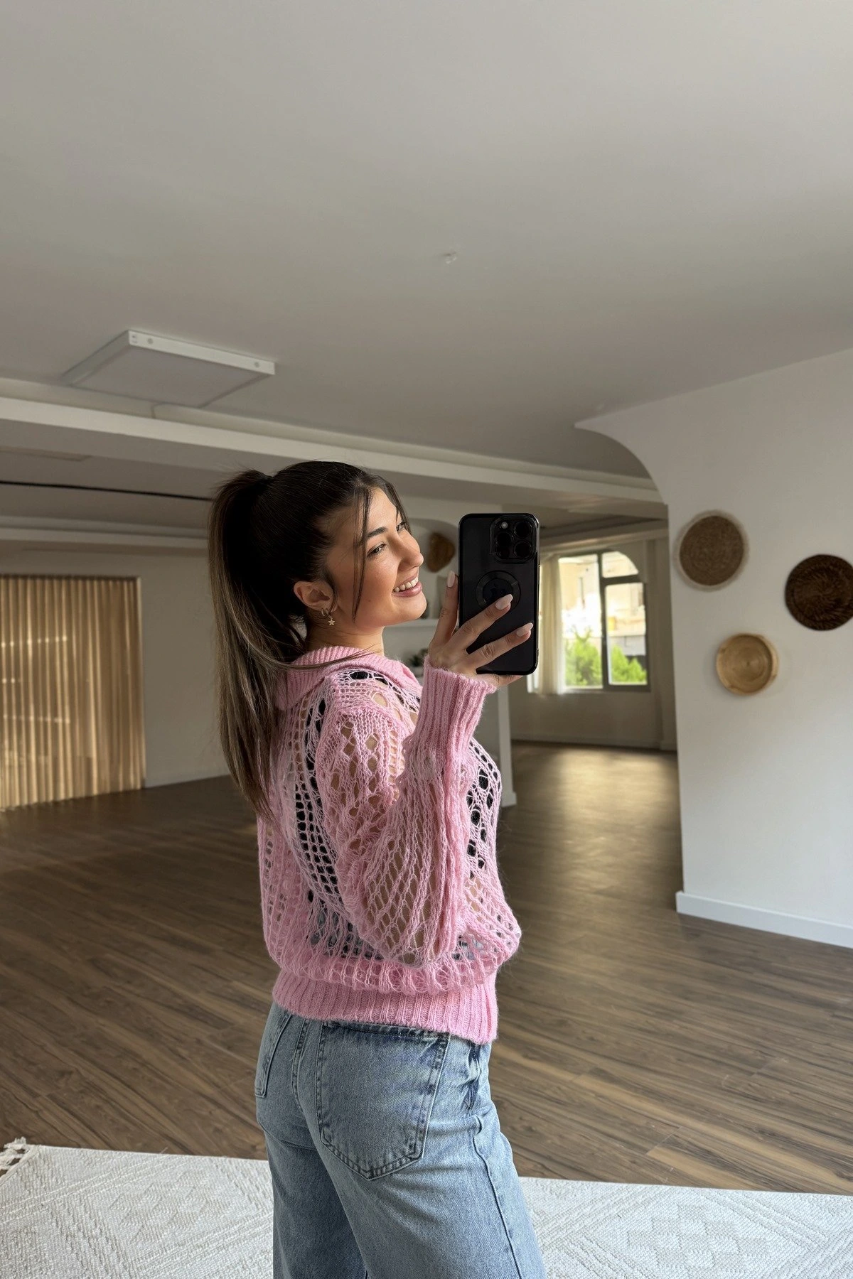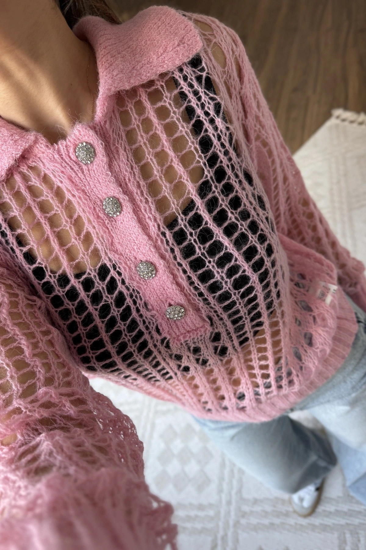 YAKALI TAŞ DÜĞME AJURLU YÜN KARIŞIM TRİKO – PEMBE