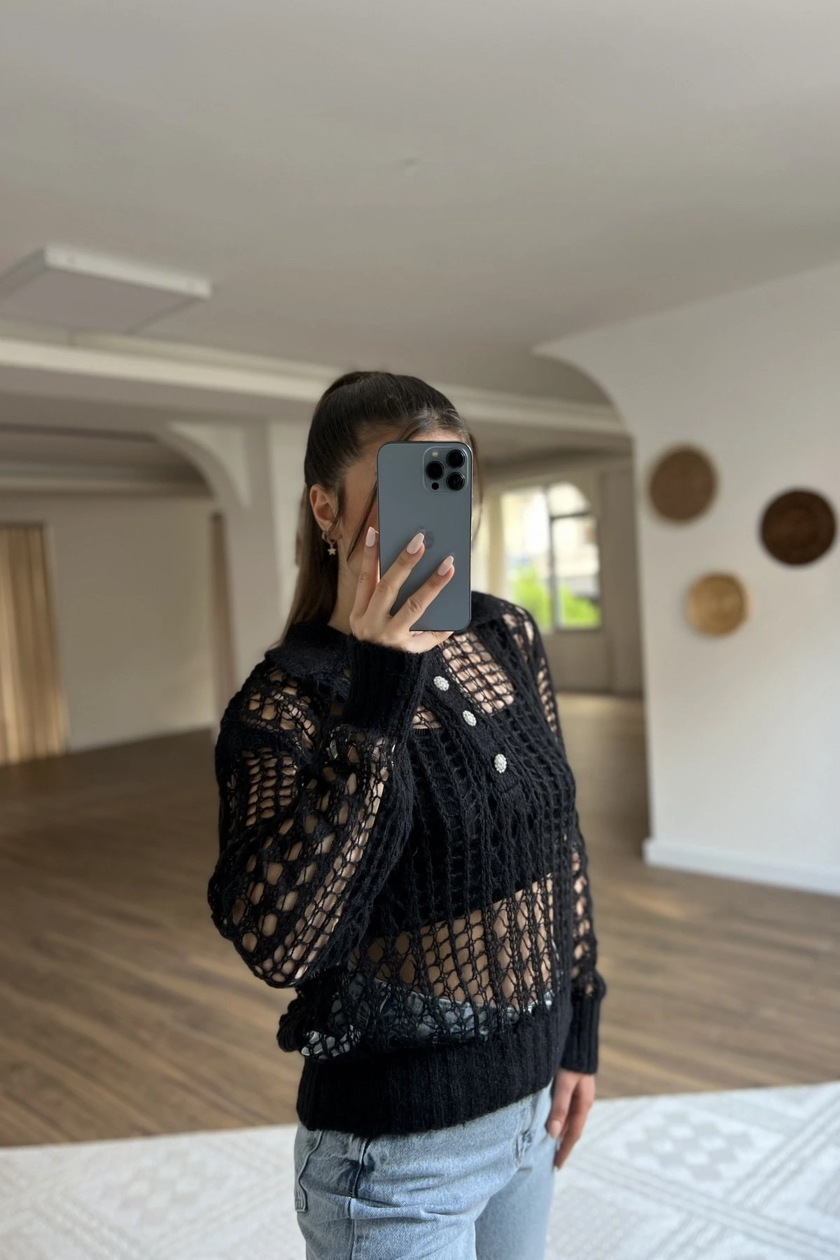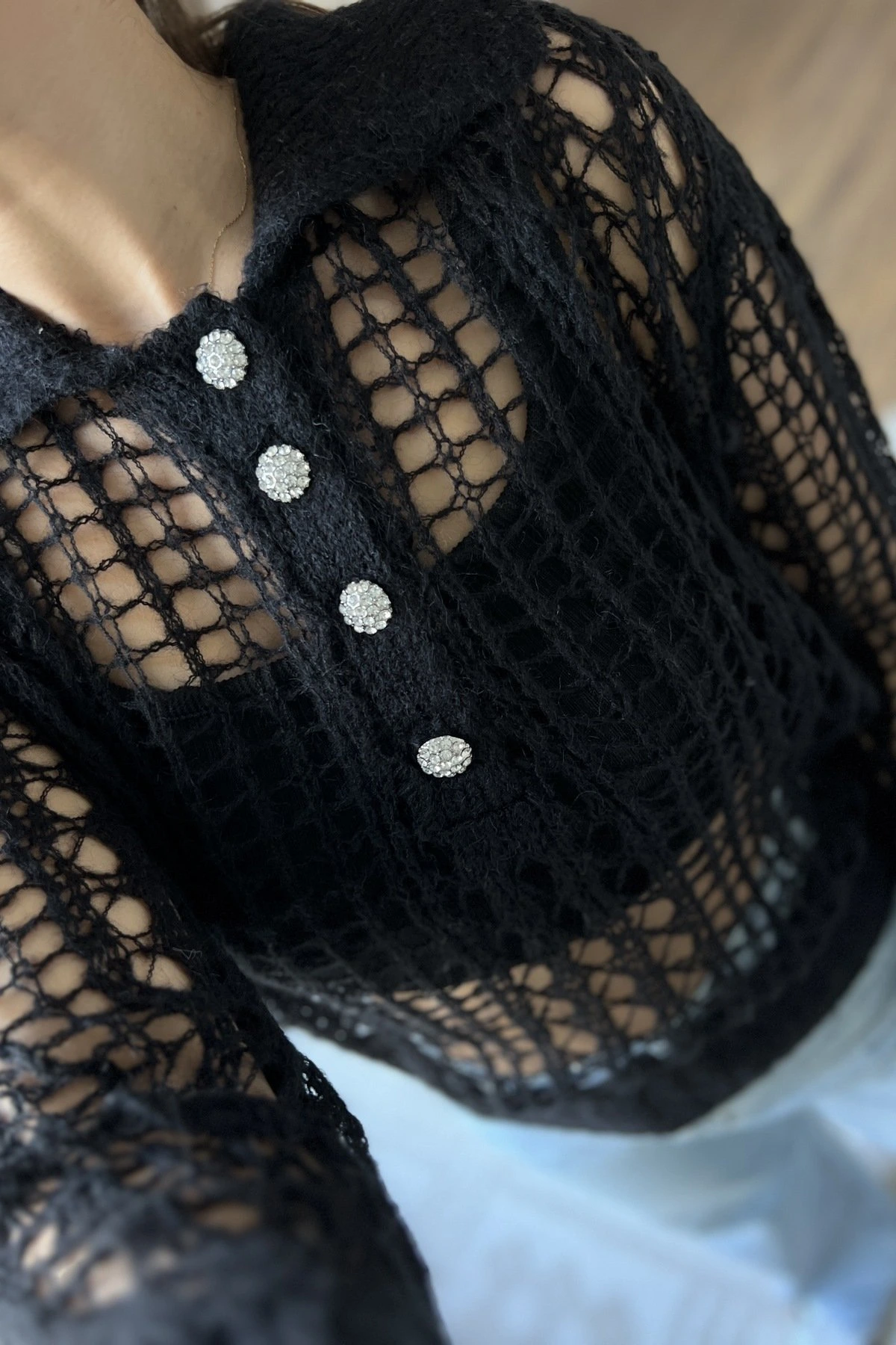 YAKALI TAŞ DÜĞME AJURLU YÜN KARIŞIM TRİKO – SİYAH