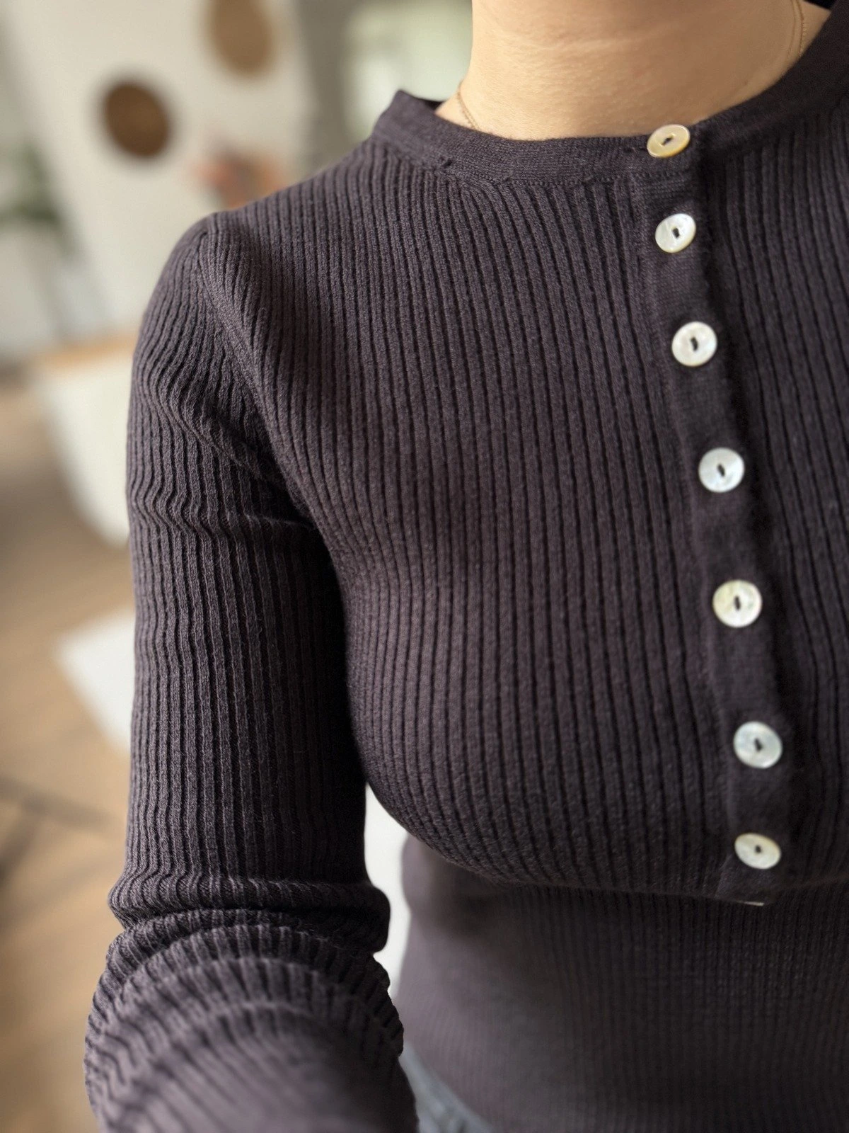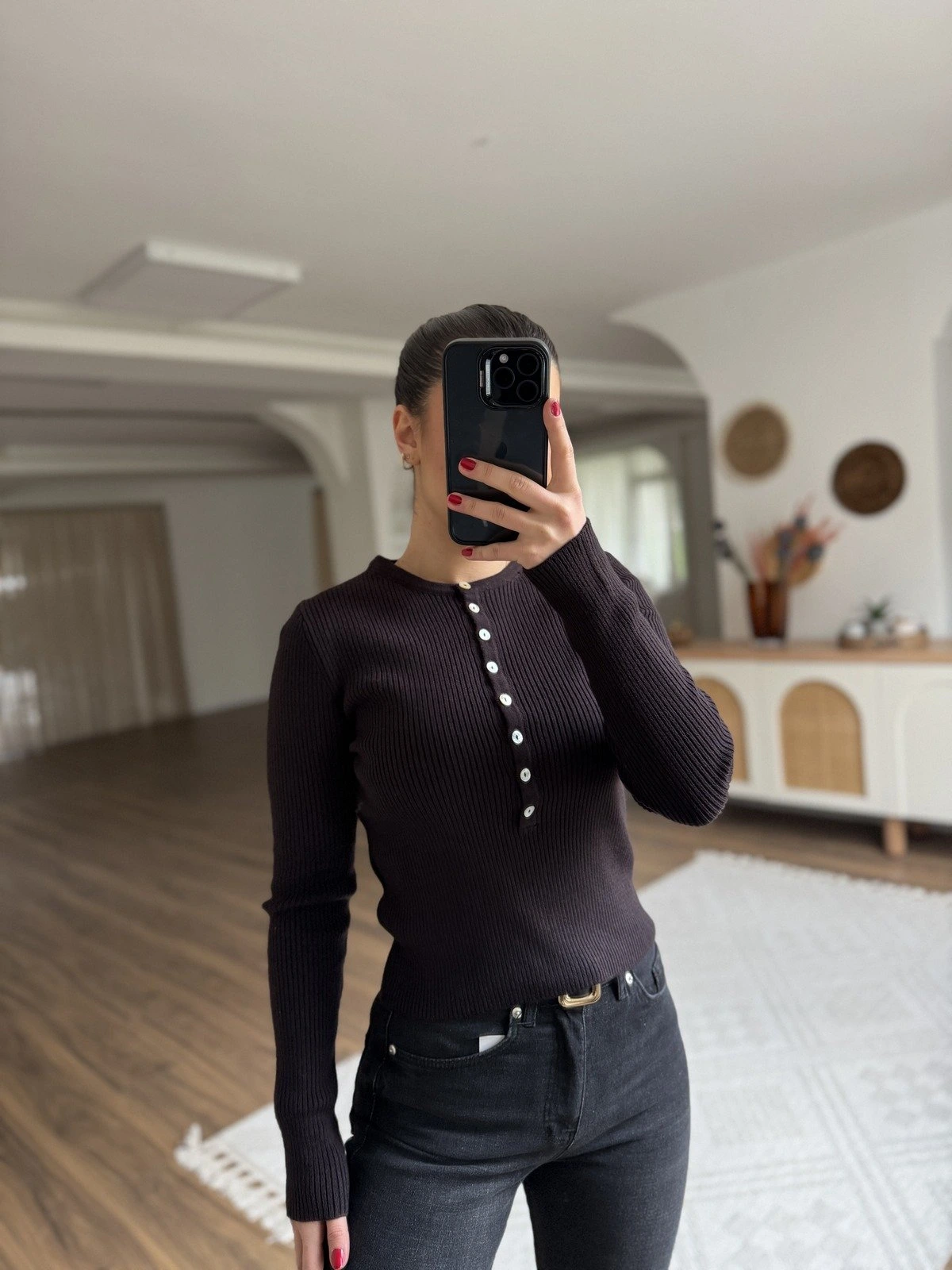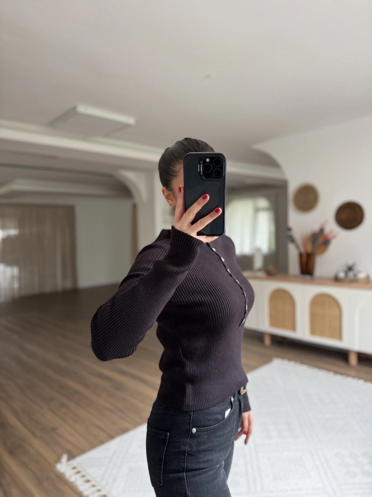 YÜN KARIŞIMLI DÜĞMELİ FİTİLLİ İNCE TRİKO – KOYU KAHVE