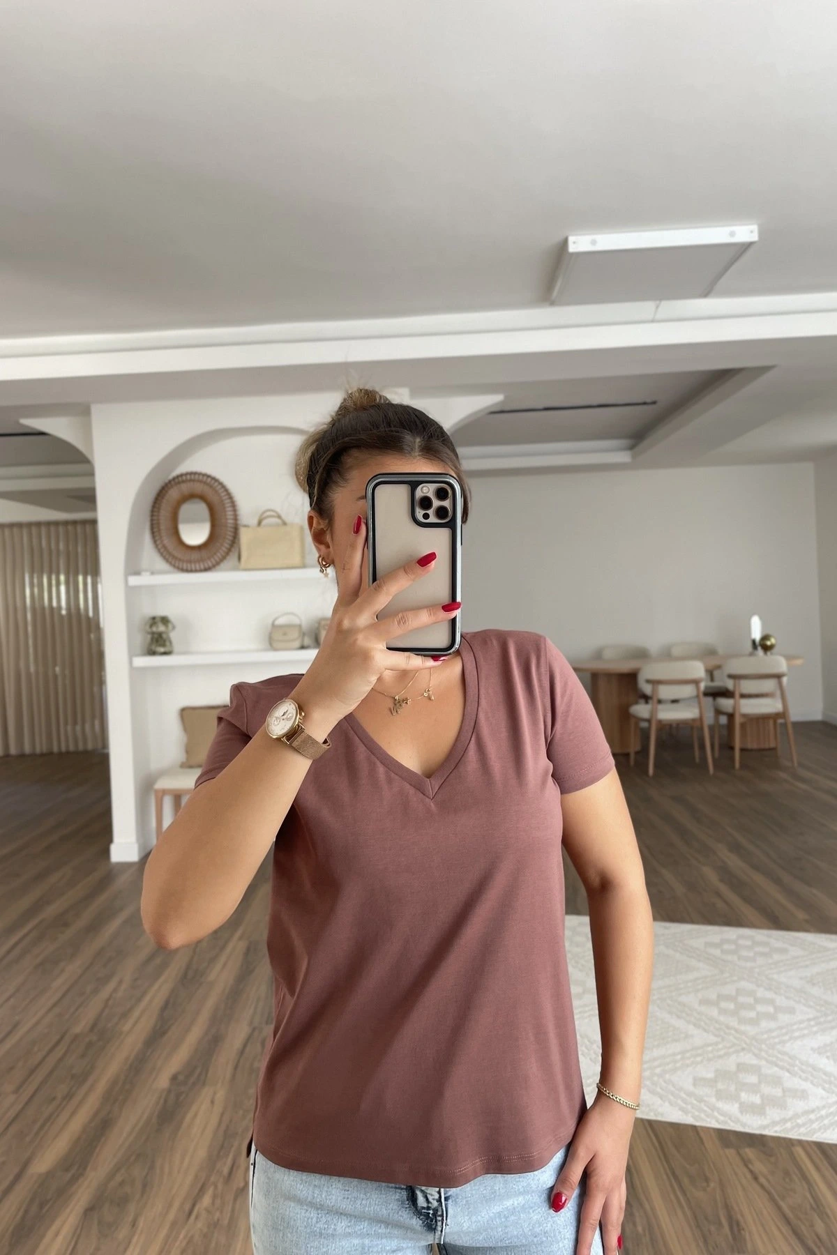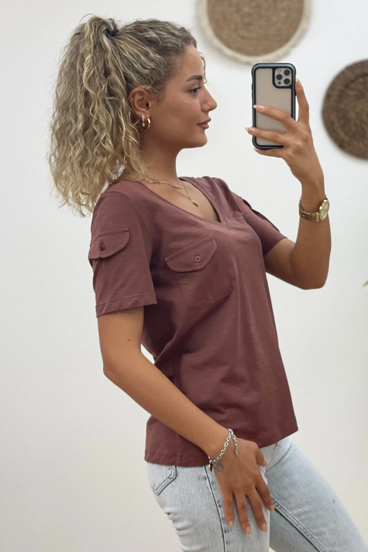 CEP DÜĞMELİ V YAKA TİŞÖRT – KAHVE