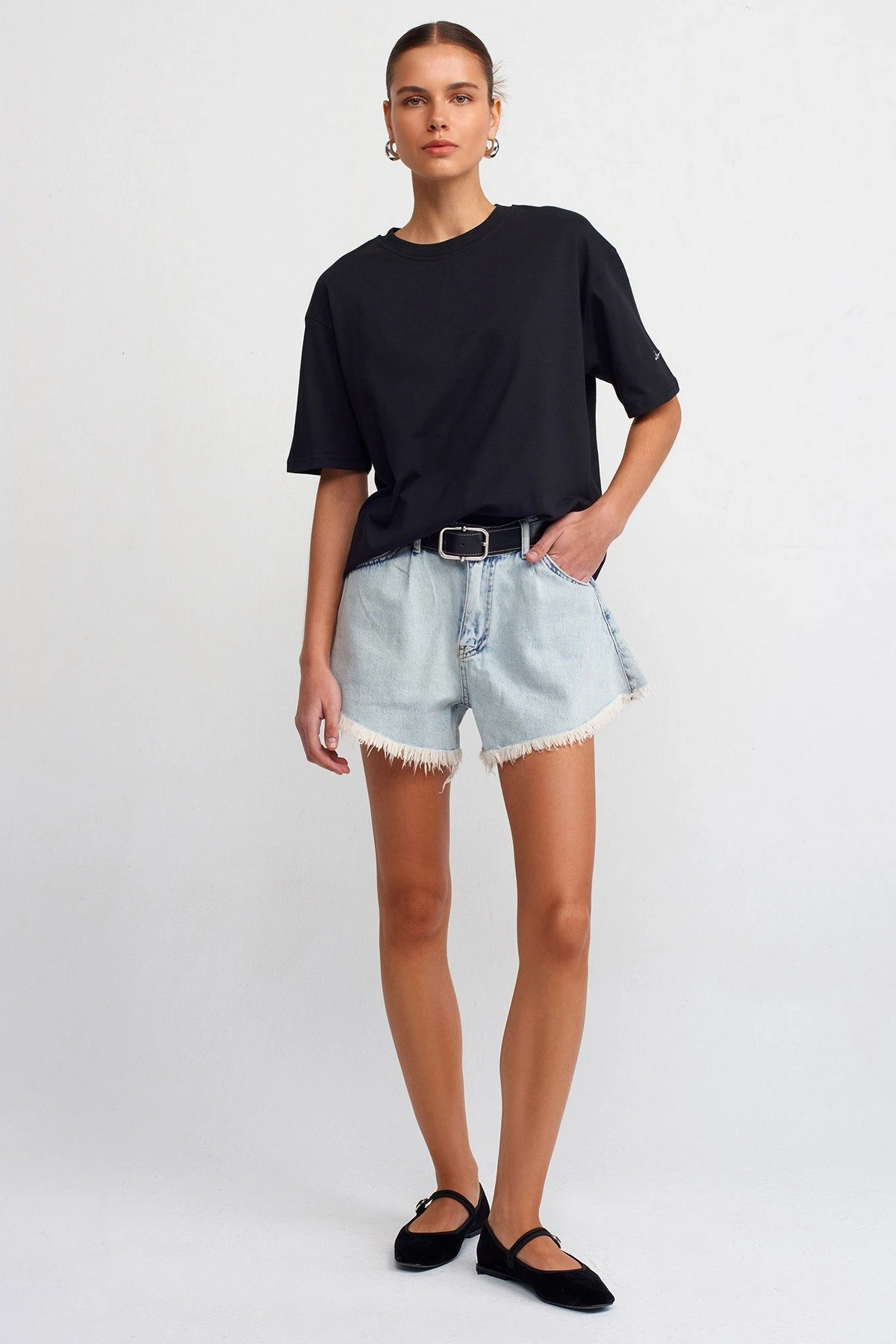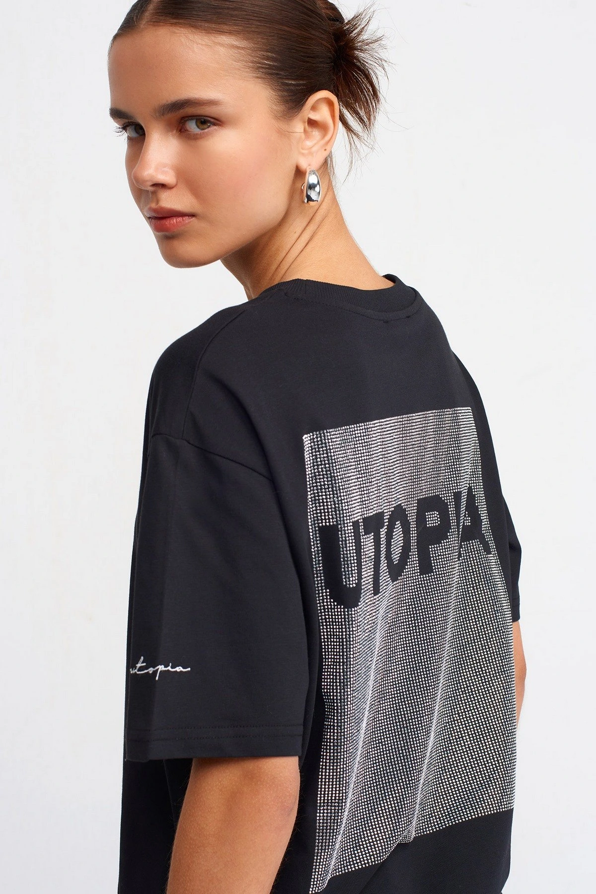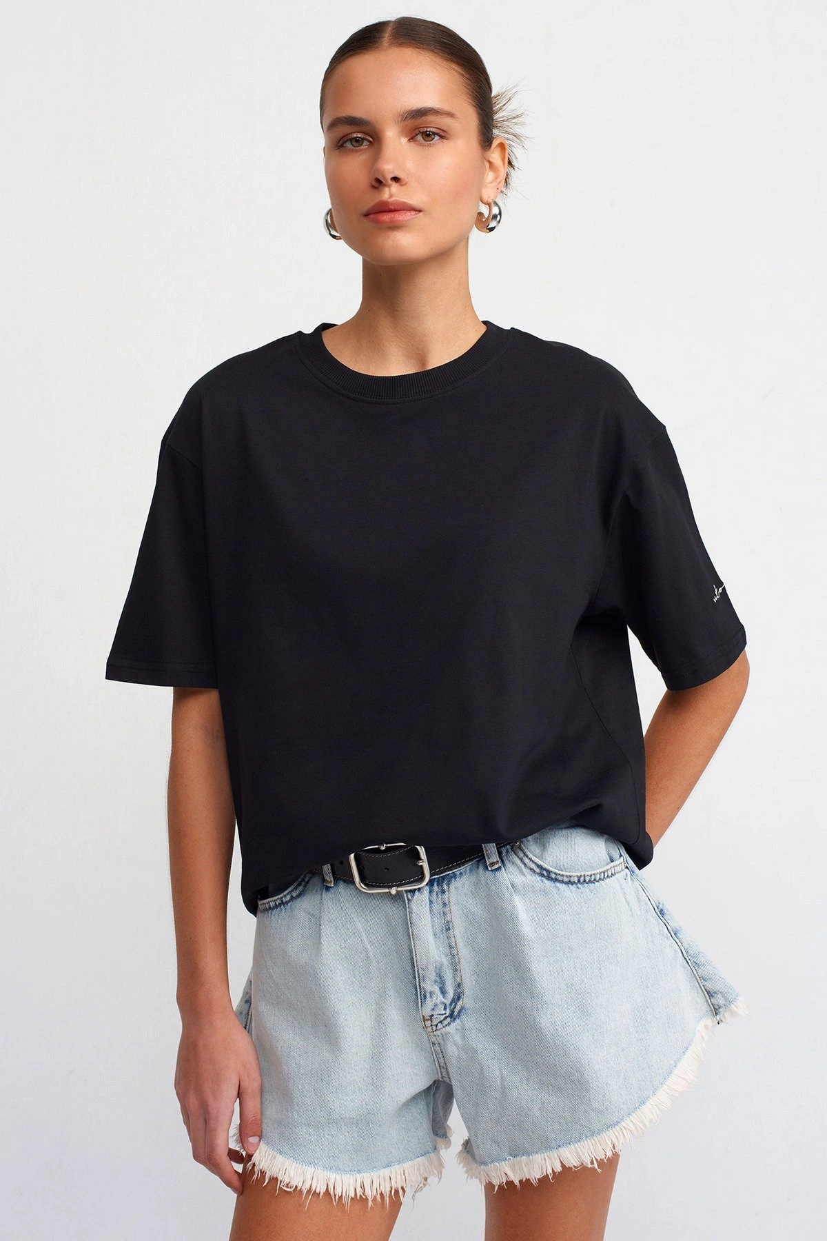 ARKA TAŞ BASKI YAZI DETAY SALAŞ PAMUK TİŞÖRT – SİYAH