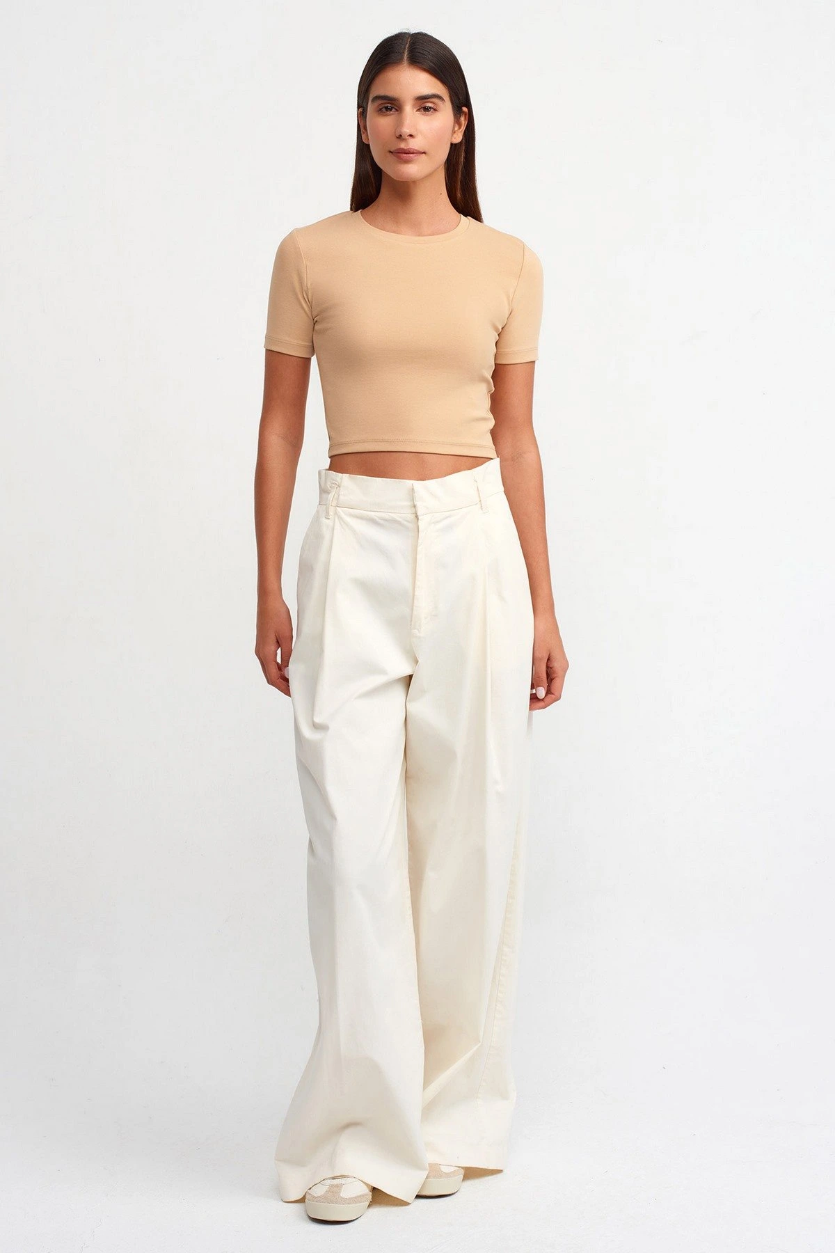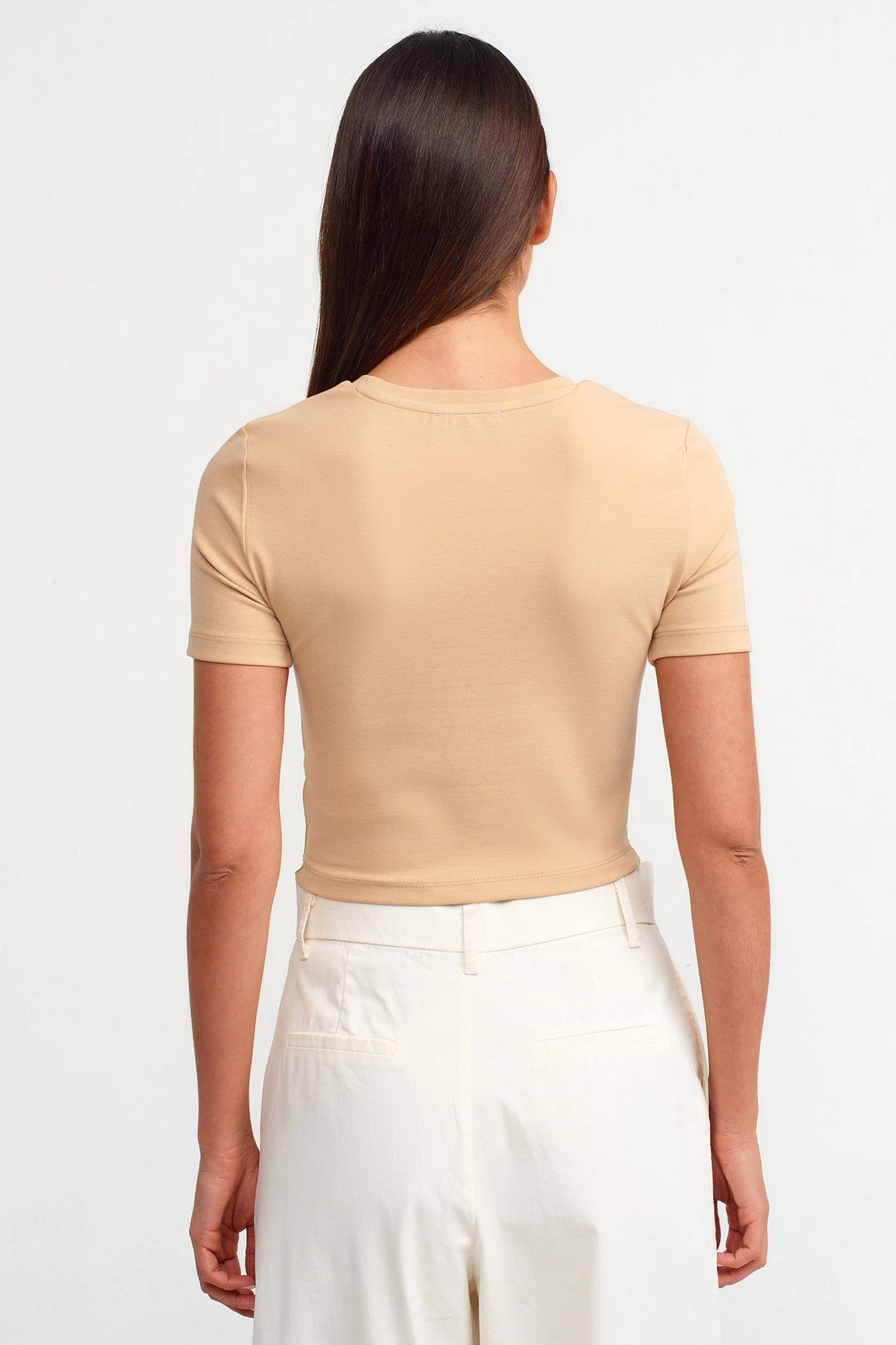 BİSİKLET YAKA CROP PAMUK LİKRALI TİŞÖRT – BEJ