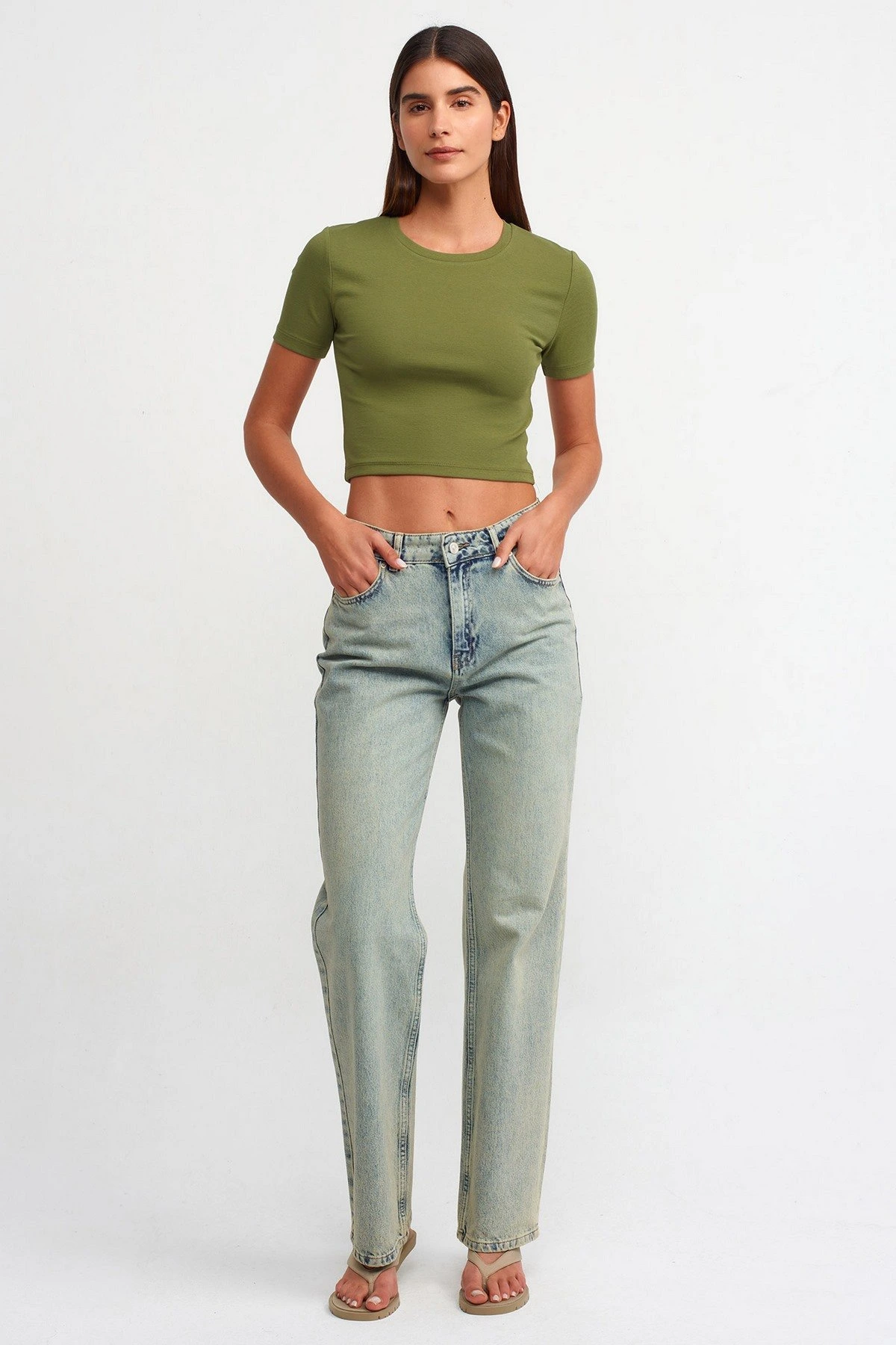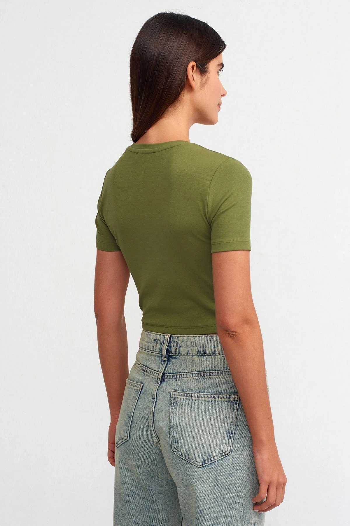 BİSİKLET YAKA CROP PAMUK LİKRALI TİŞÖRT – HAKİ