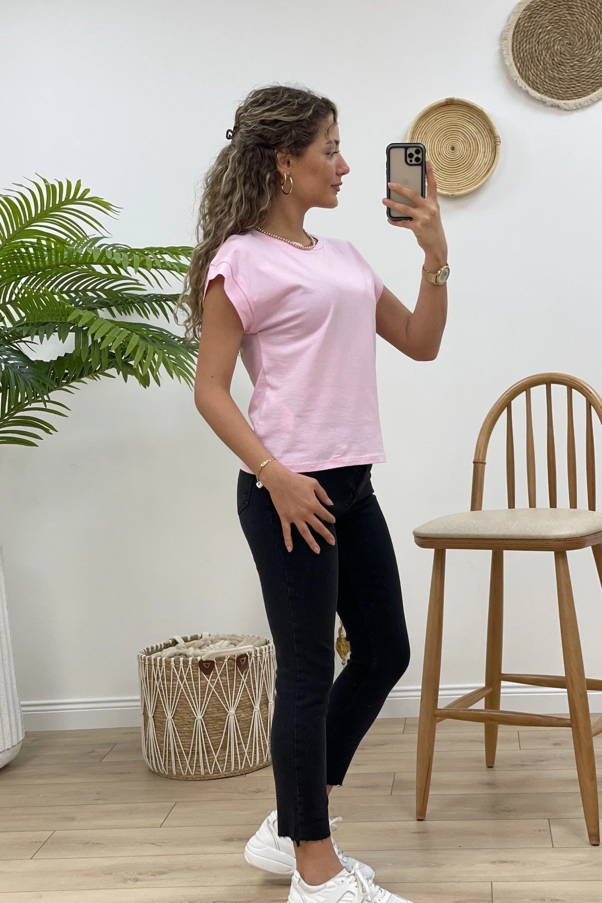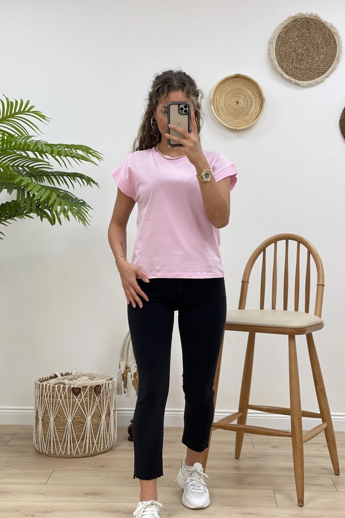 BİSİKLET YAKA DÜŞÜK KOL TİŞÖRT – AÇIK PEMBE