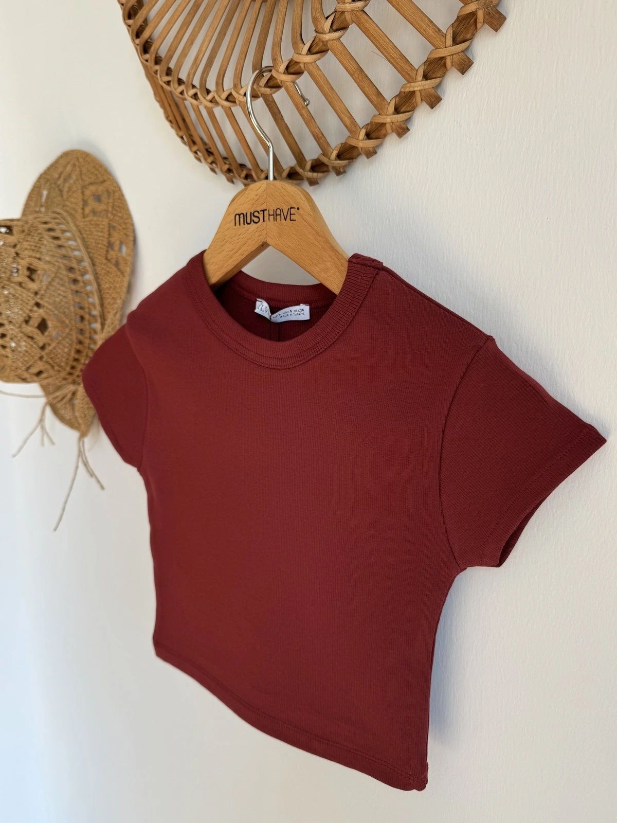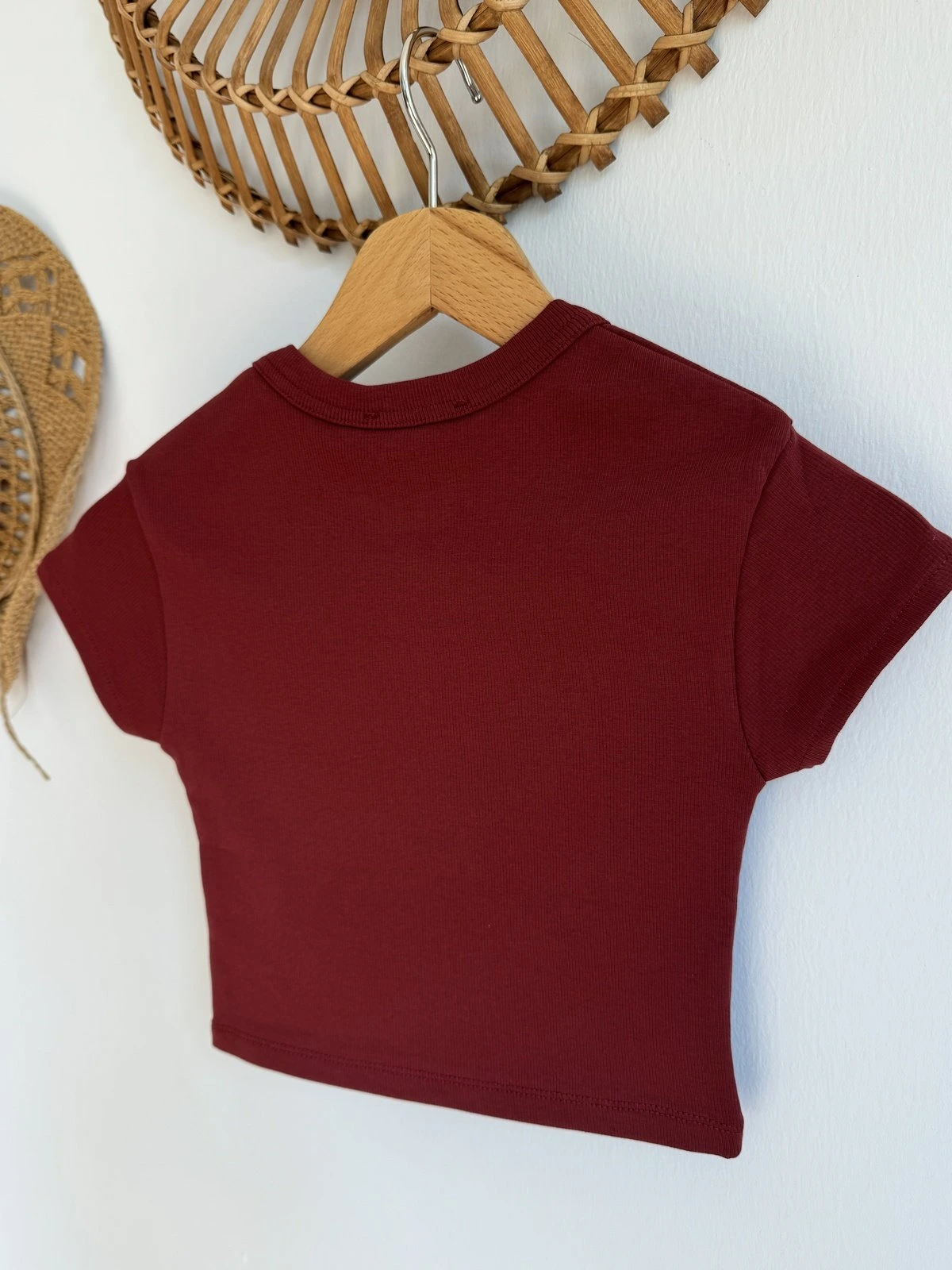 BİSİKLET YAKA FİTİLLİ LİKRALI CROP TİŞÖRT – AÇIK BORDO