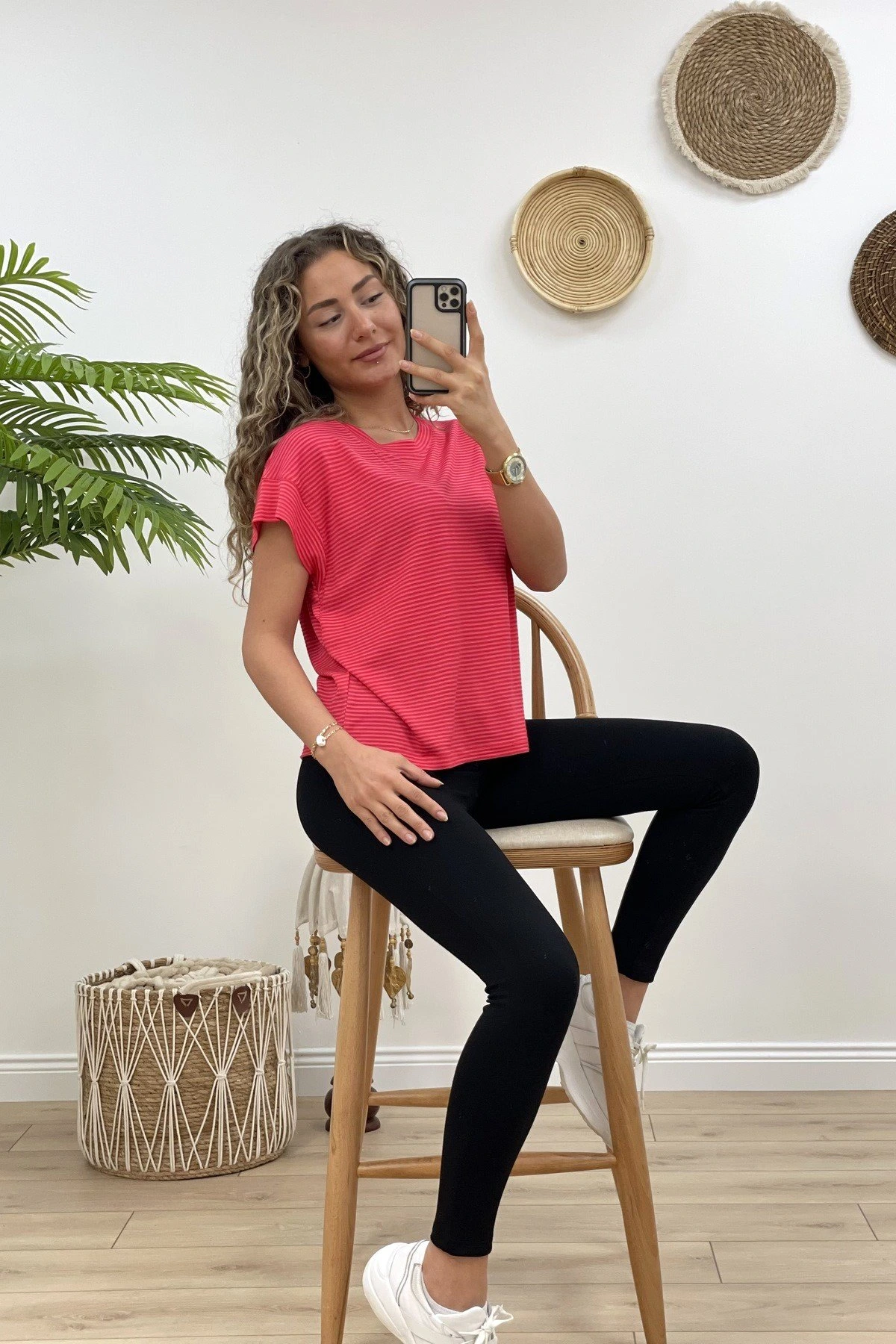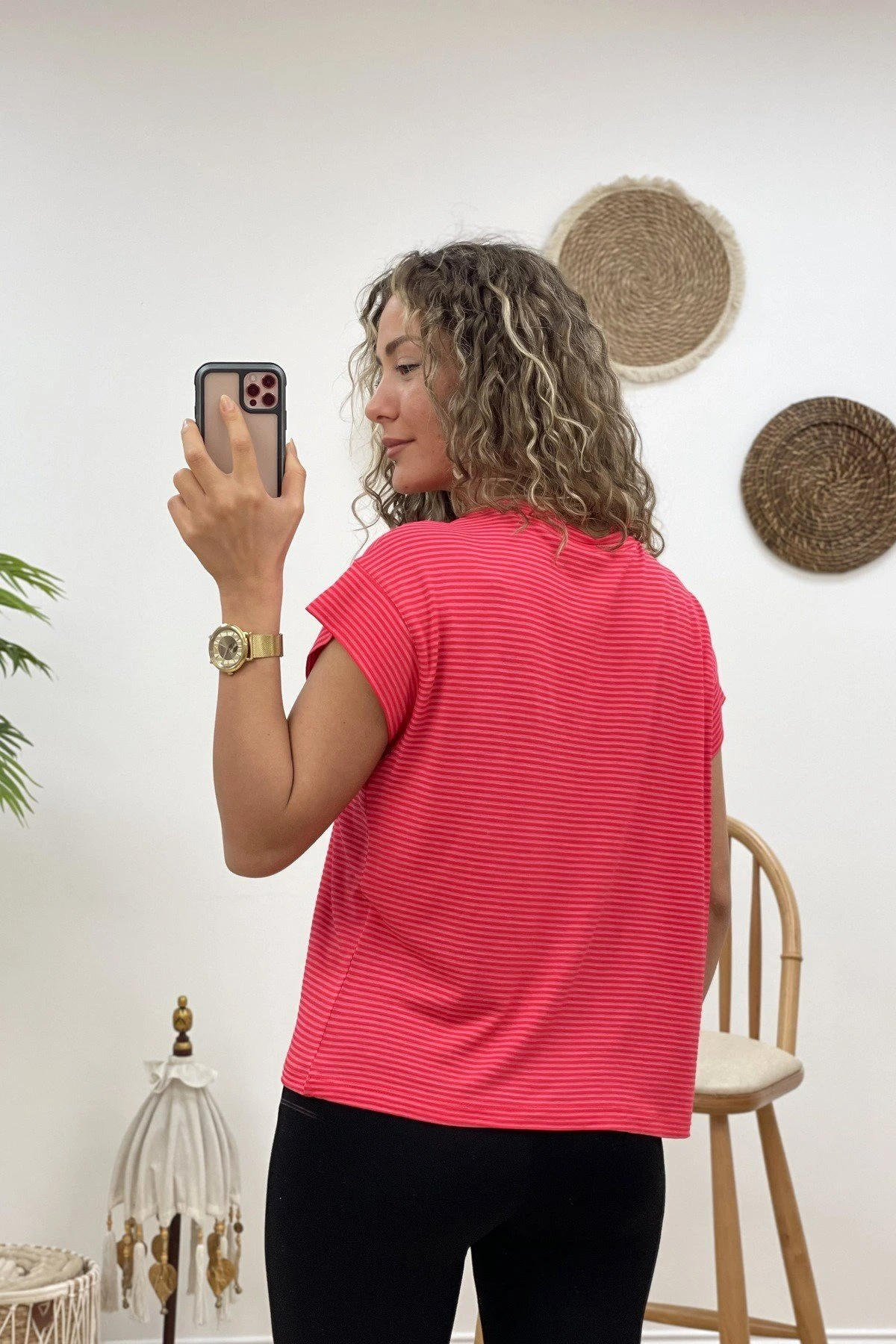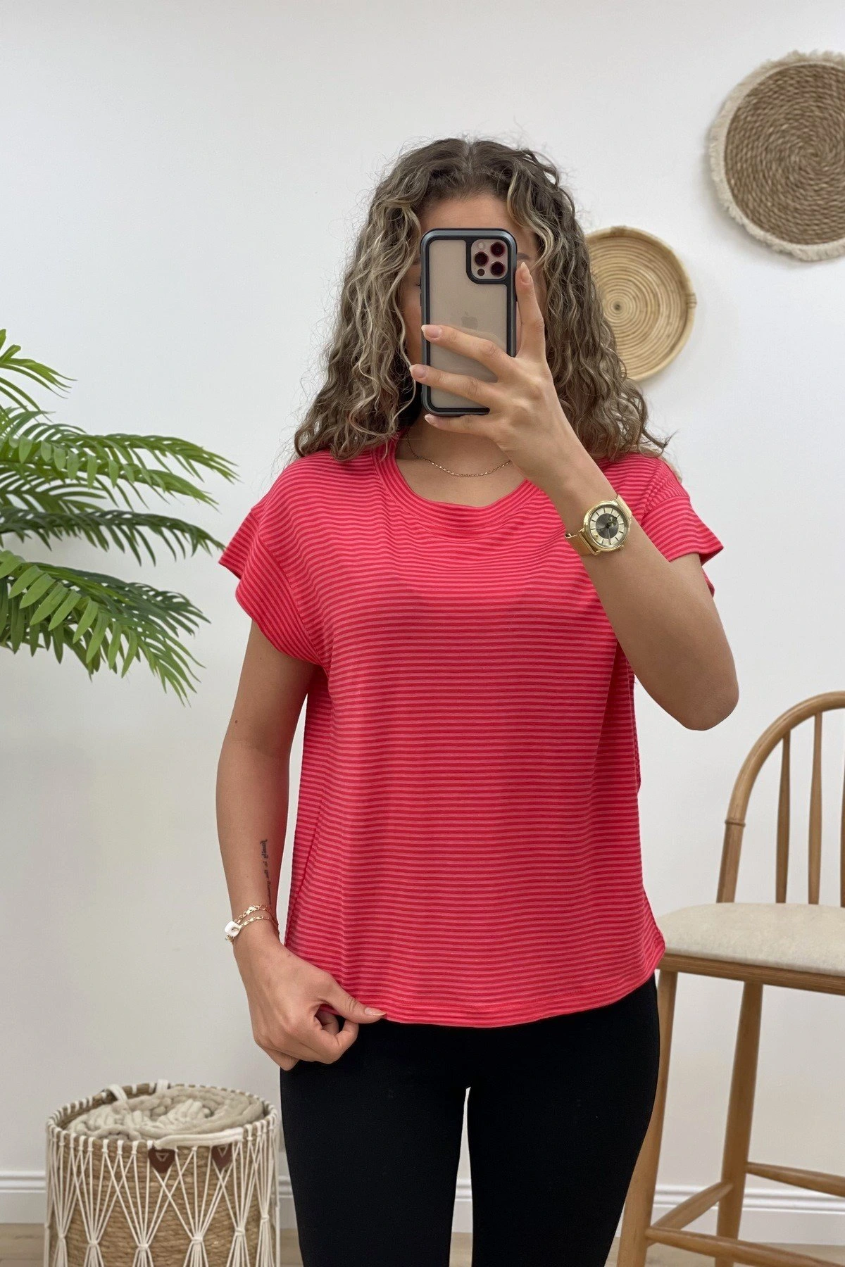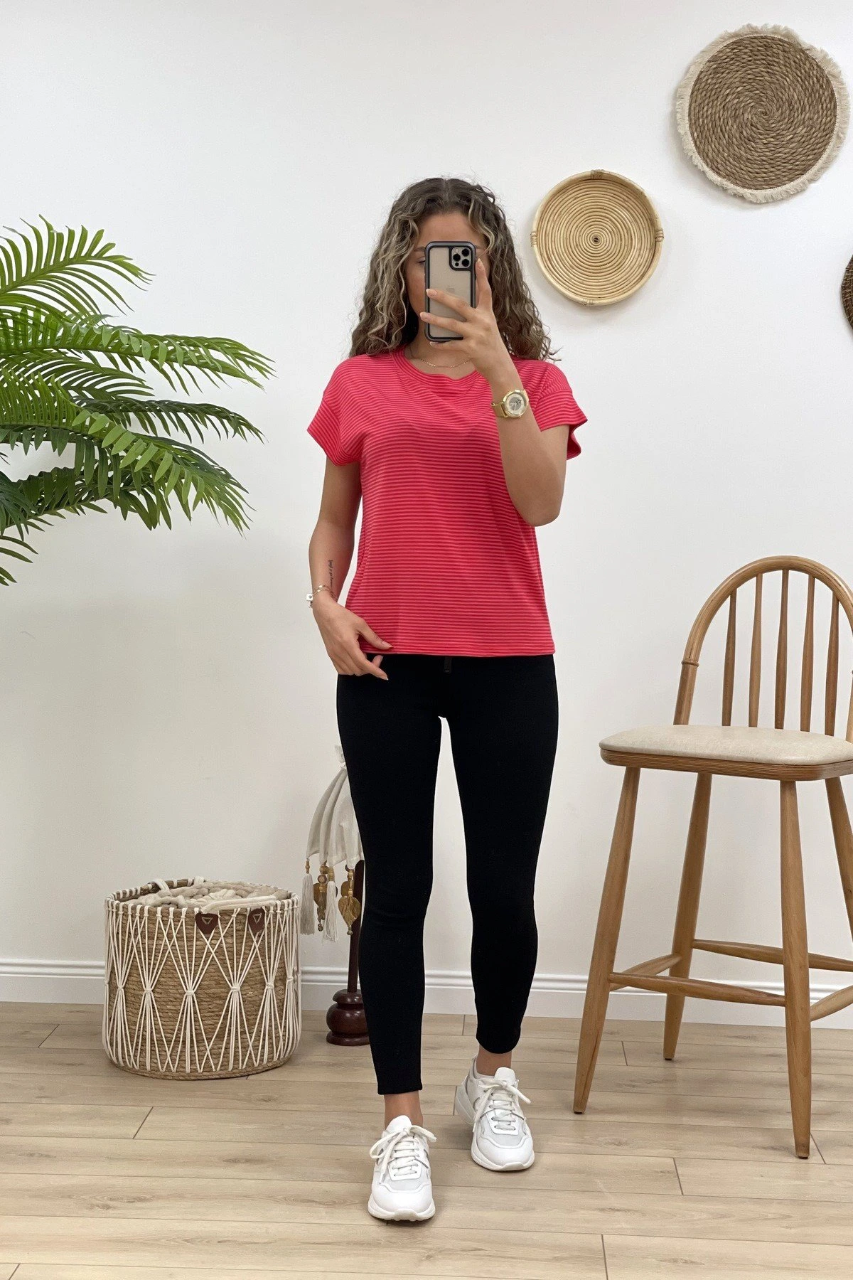 BİSİKLET YAKA JAPONE KOL ÇİZGİLİ TİŞÖRT – KIRMIZI