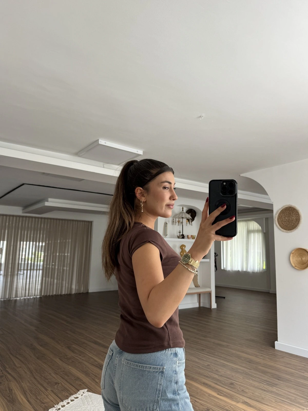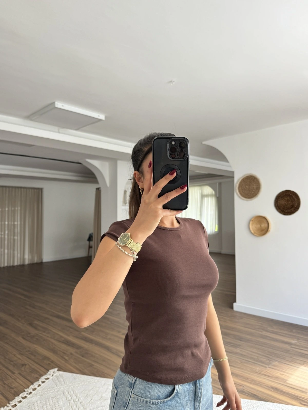 BİSİKLET YAKA KOL DİKİŞ DETAY PAMUK TİŞÖRT – AÇIK KAHVE
