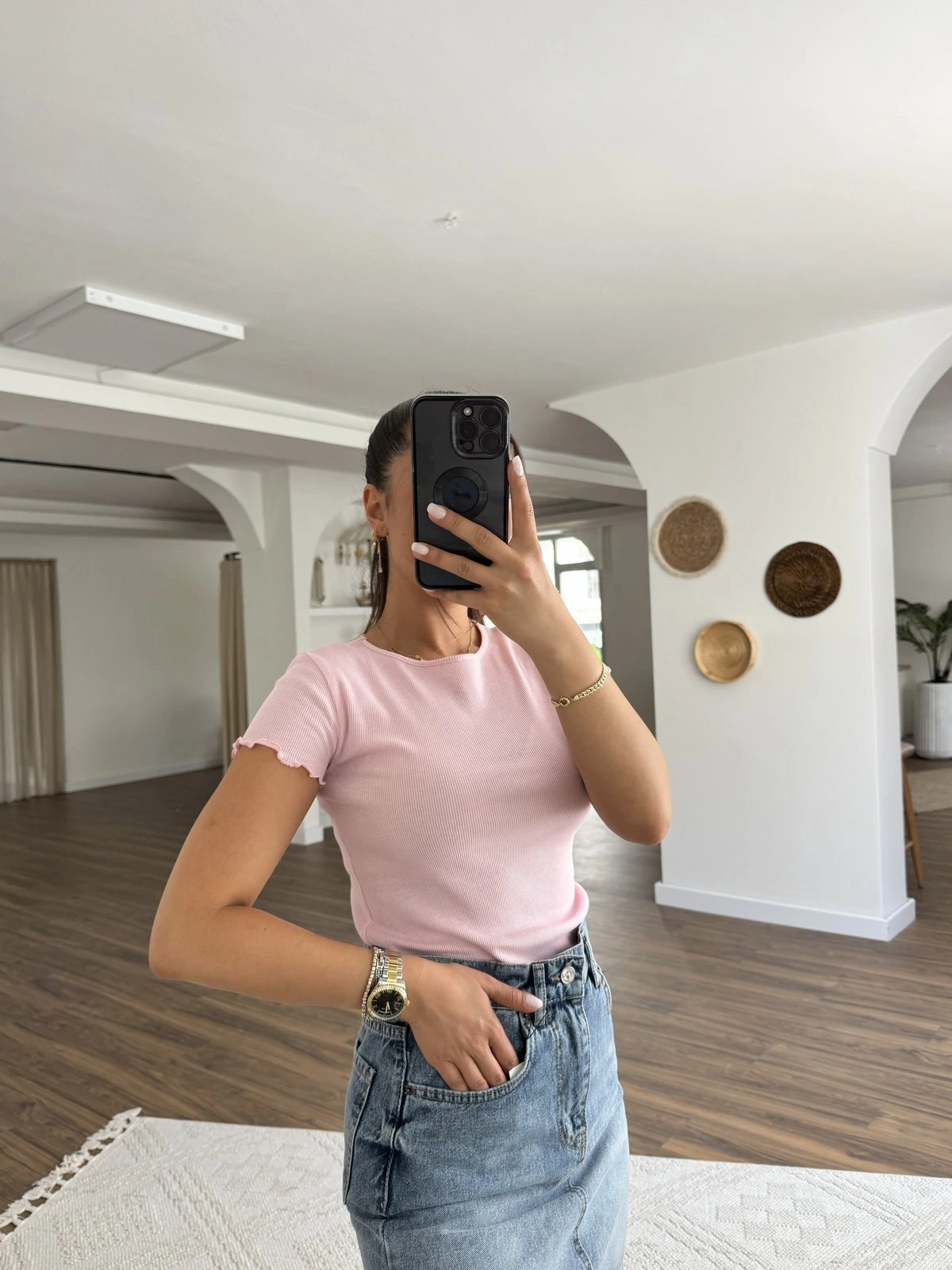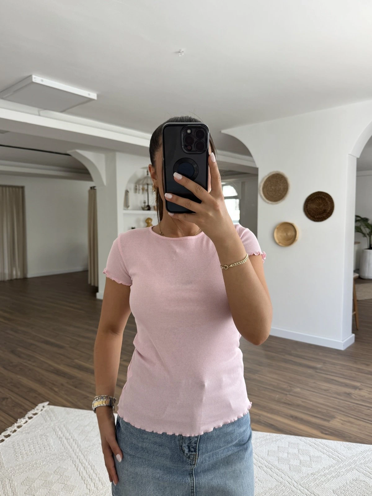 BİSİKLET YAKA KOL VE ETEK UCU FIRFIR PAMUK TİŞÖRT – TOZ PEMBE