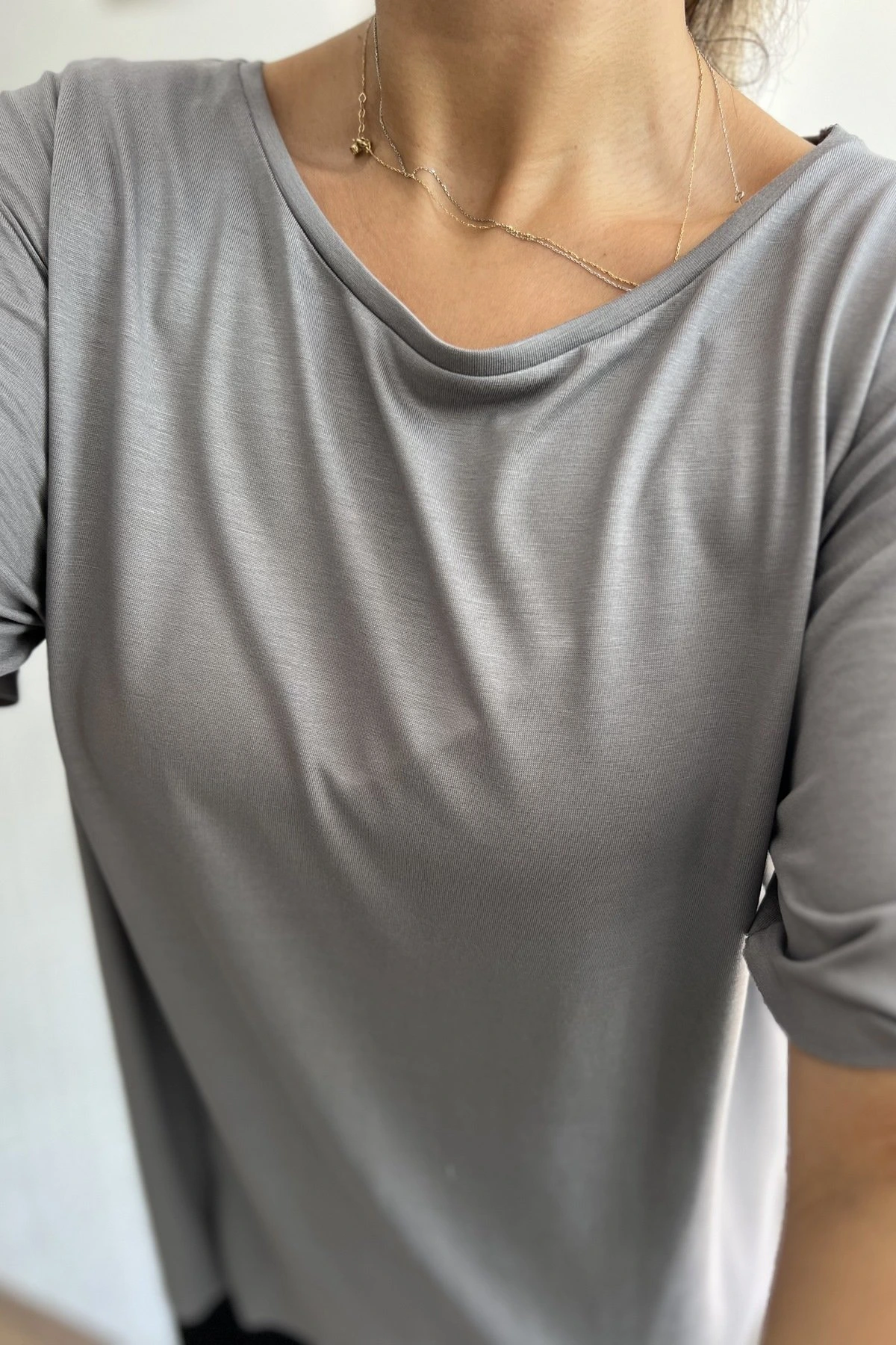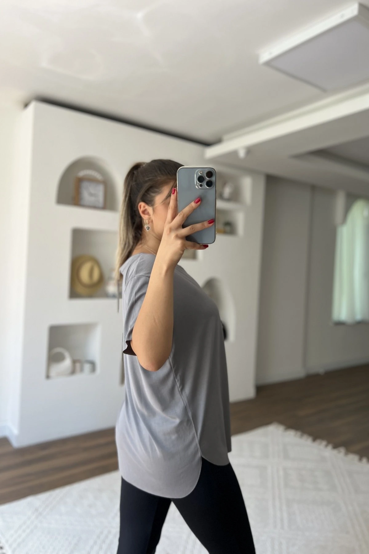 BİSİKLET YAKA LAZER KESİM LİKRALI MODAL TİŞÖRT – GRİ