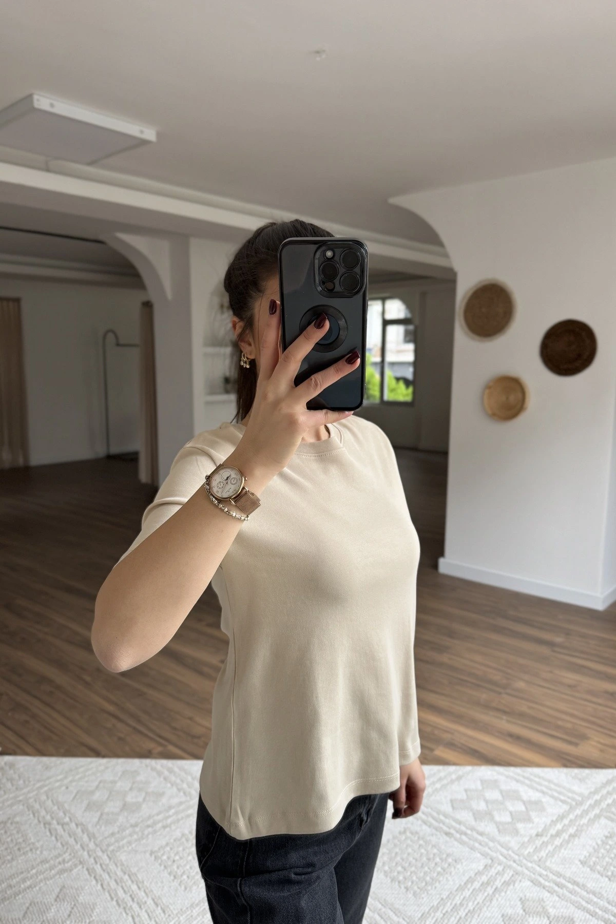 BİSİKLET YAKA PAMUK SALAŞ BASİC PAMUK TİŞÖRT – AÇIK BEJ