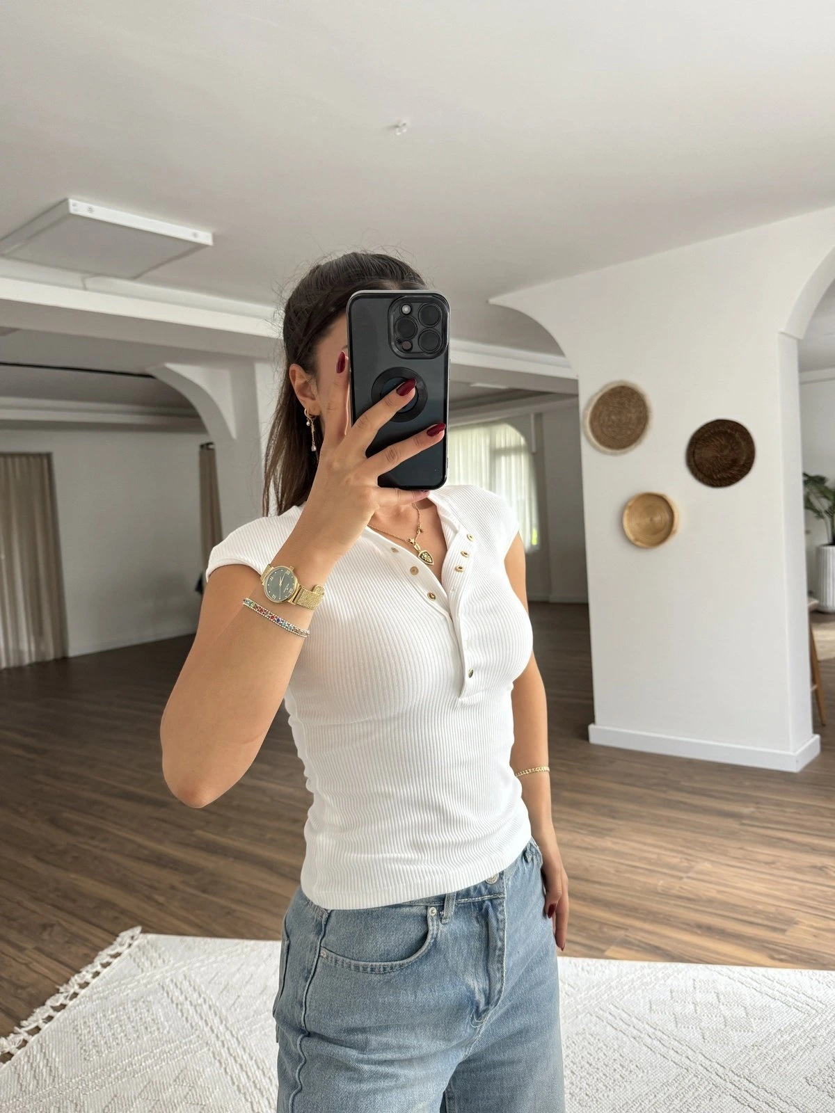 ÇITÇITLI DÜŞÜK KOL PAMUK LİKRA TİŞÖRT – BEYAZ