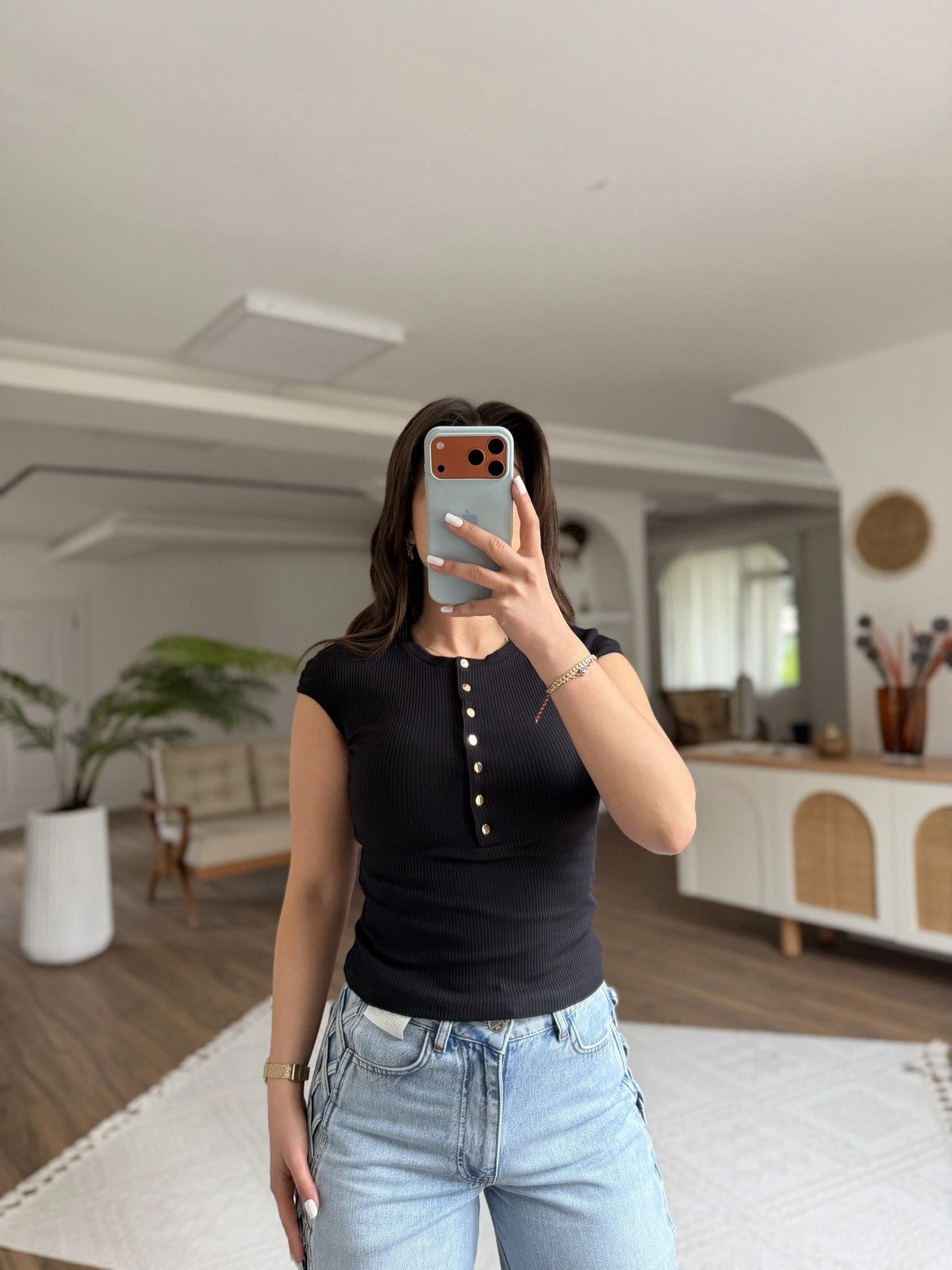 ÇITÇITLI DÜŞÜK KOL PAMUK LİKRA TİŞÖRT – SİYAH