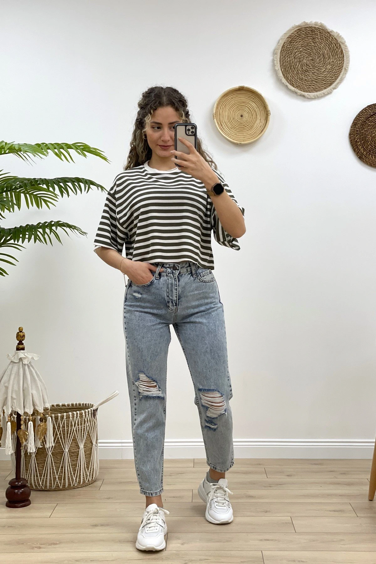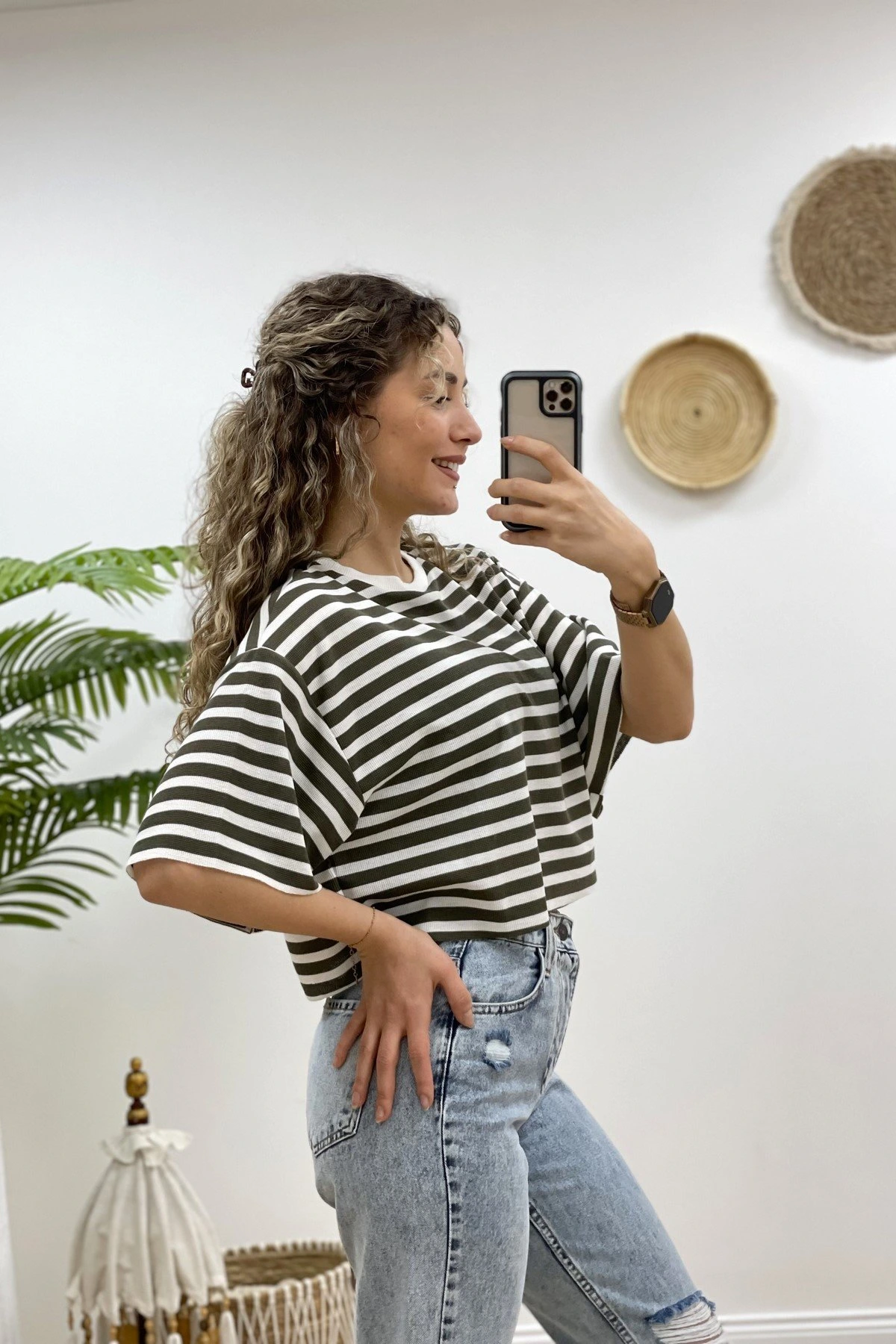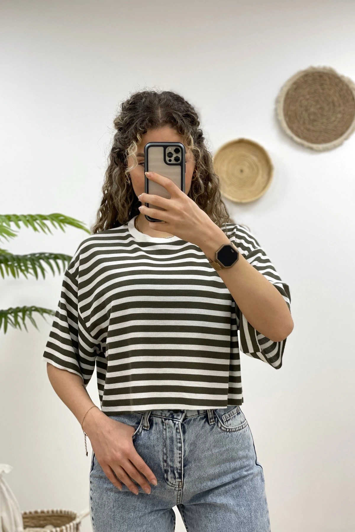 ÇİZGİLİ CROP TİŞÖRT – HAKİ