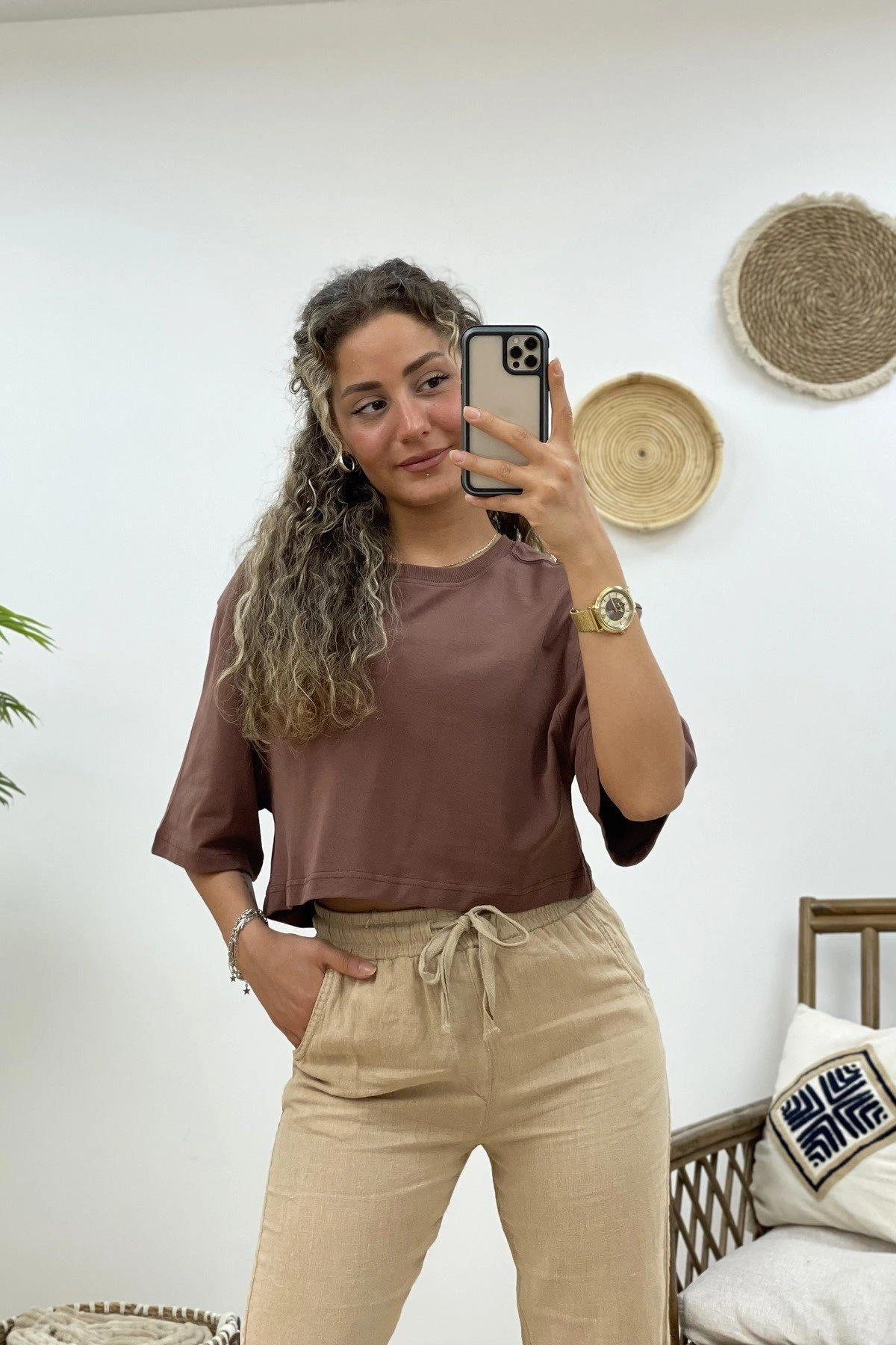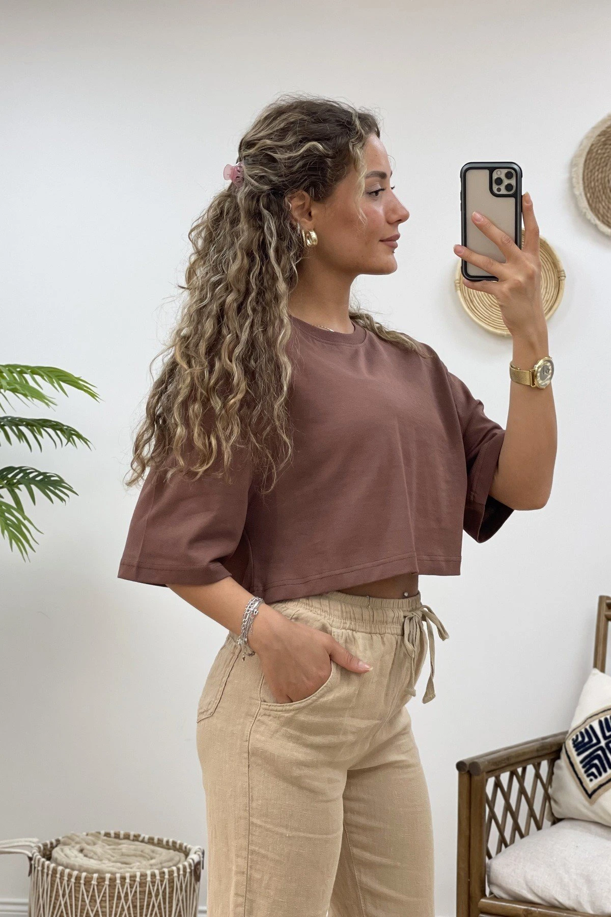 CROP BİSİKLET YAKA TİŞÖRT – KAHVE