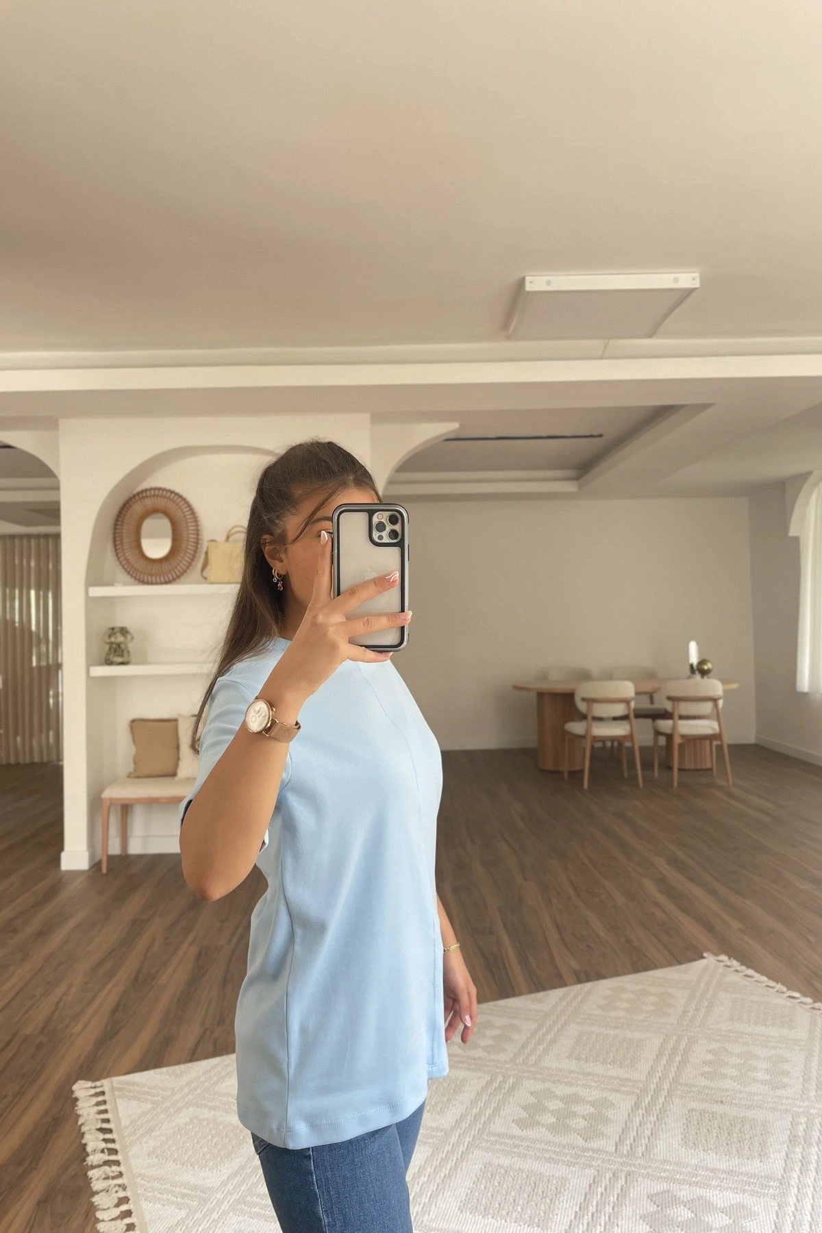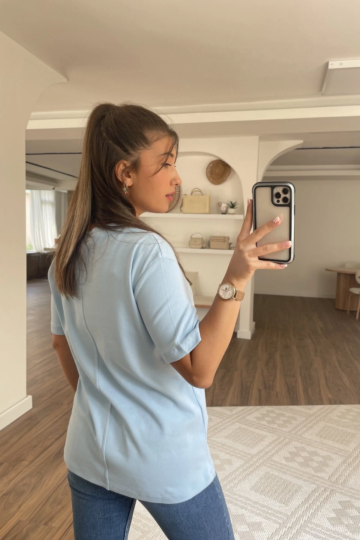 DİKİŞ DETAY SALAŞ PAMUK TİŞÖRT – MAVİ