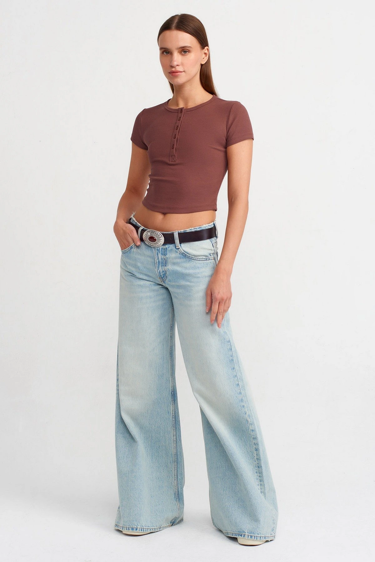 DÜĞMELİ FİTİLLİ LİKRALI CROP TİŞÖRT – KAHVE