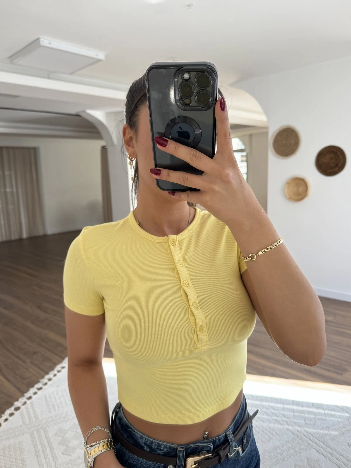 DÜĞMELİ VİSKON KISA LİKRALI CROP TİŞÖRT – SARI