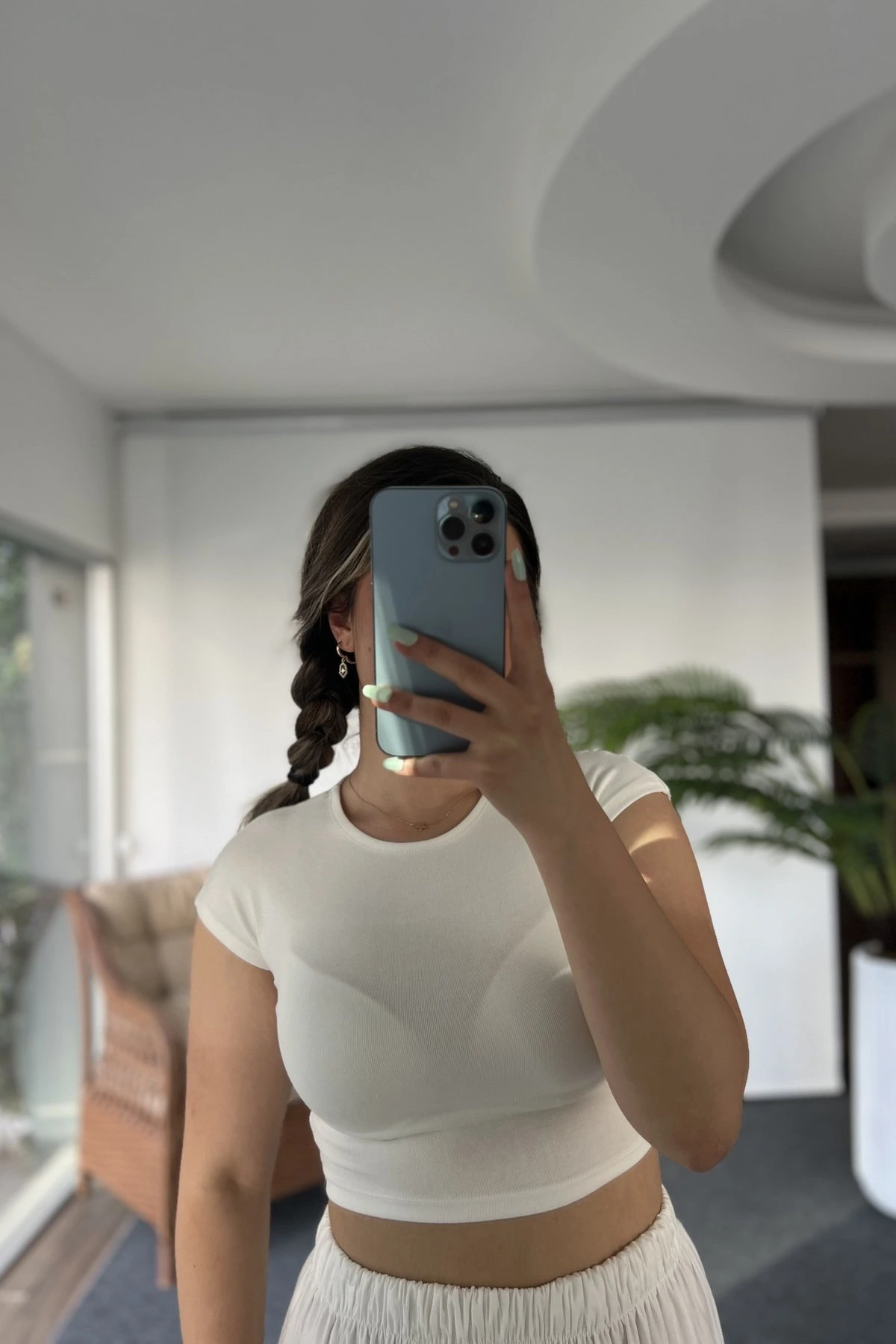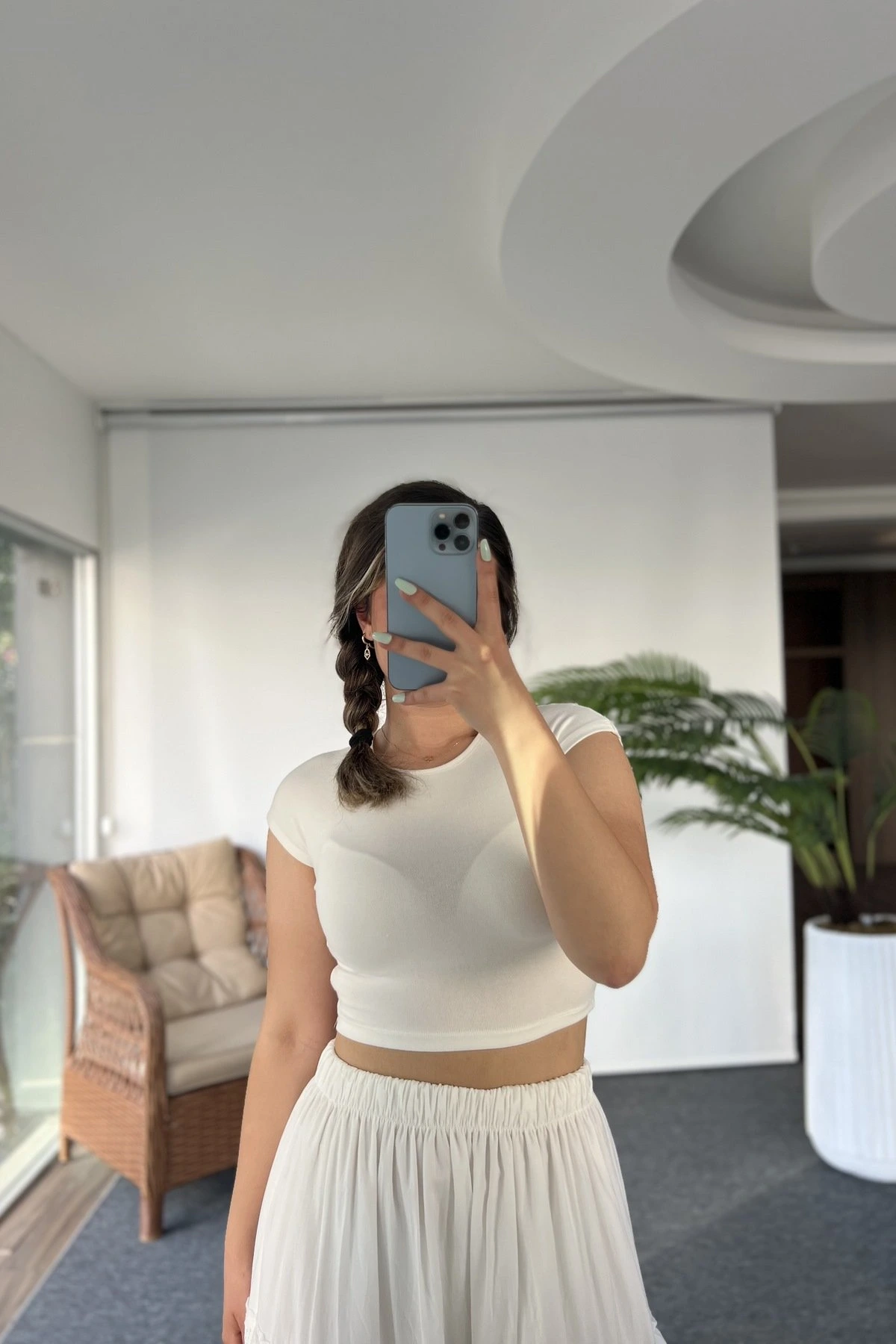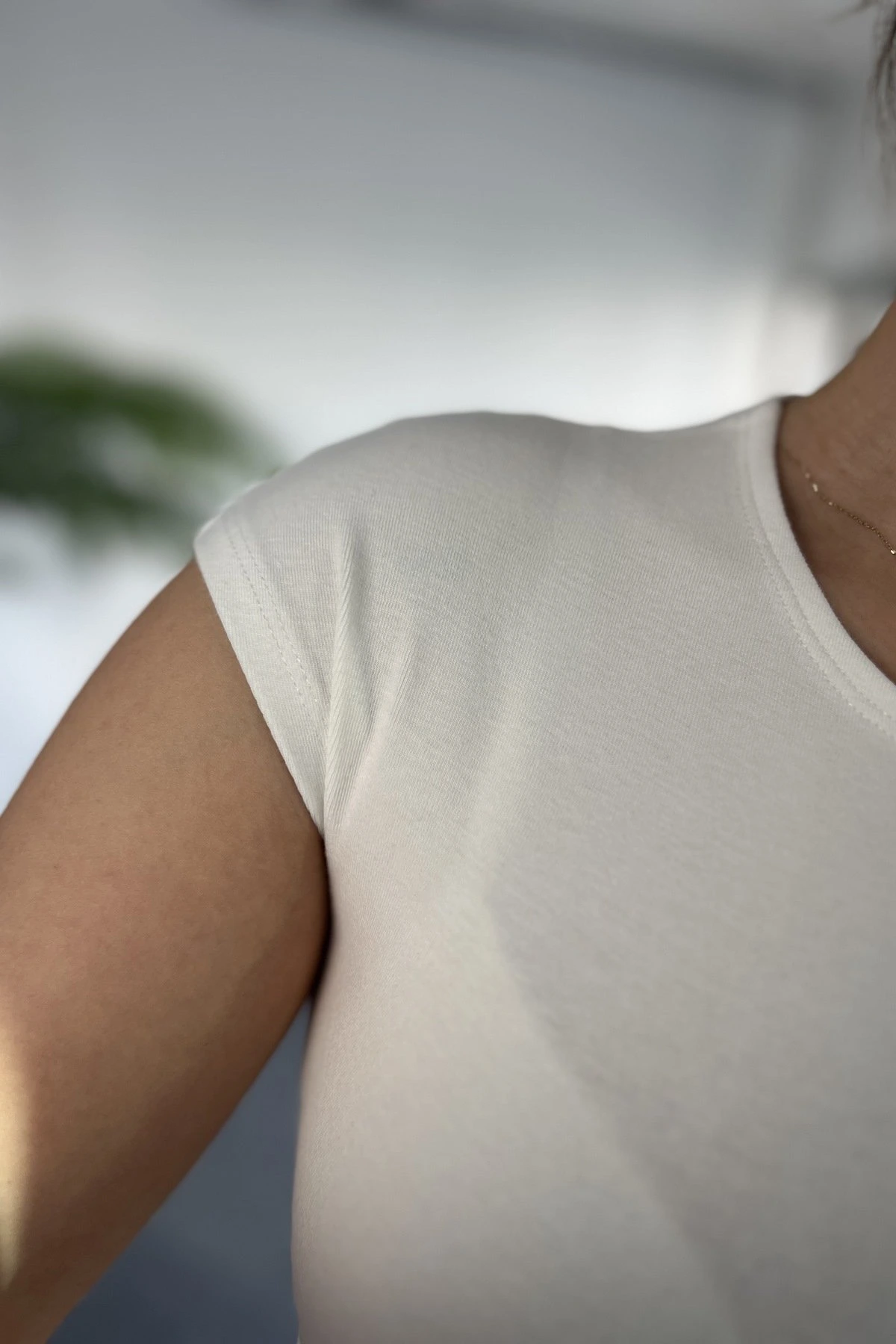 DÜŞÜK KOL MODAL PAMUK CROP TİŞÖRT – EKRU