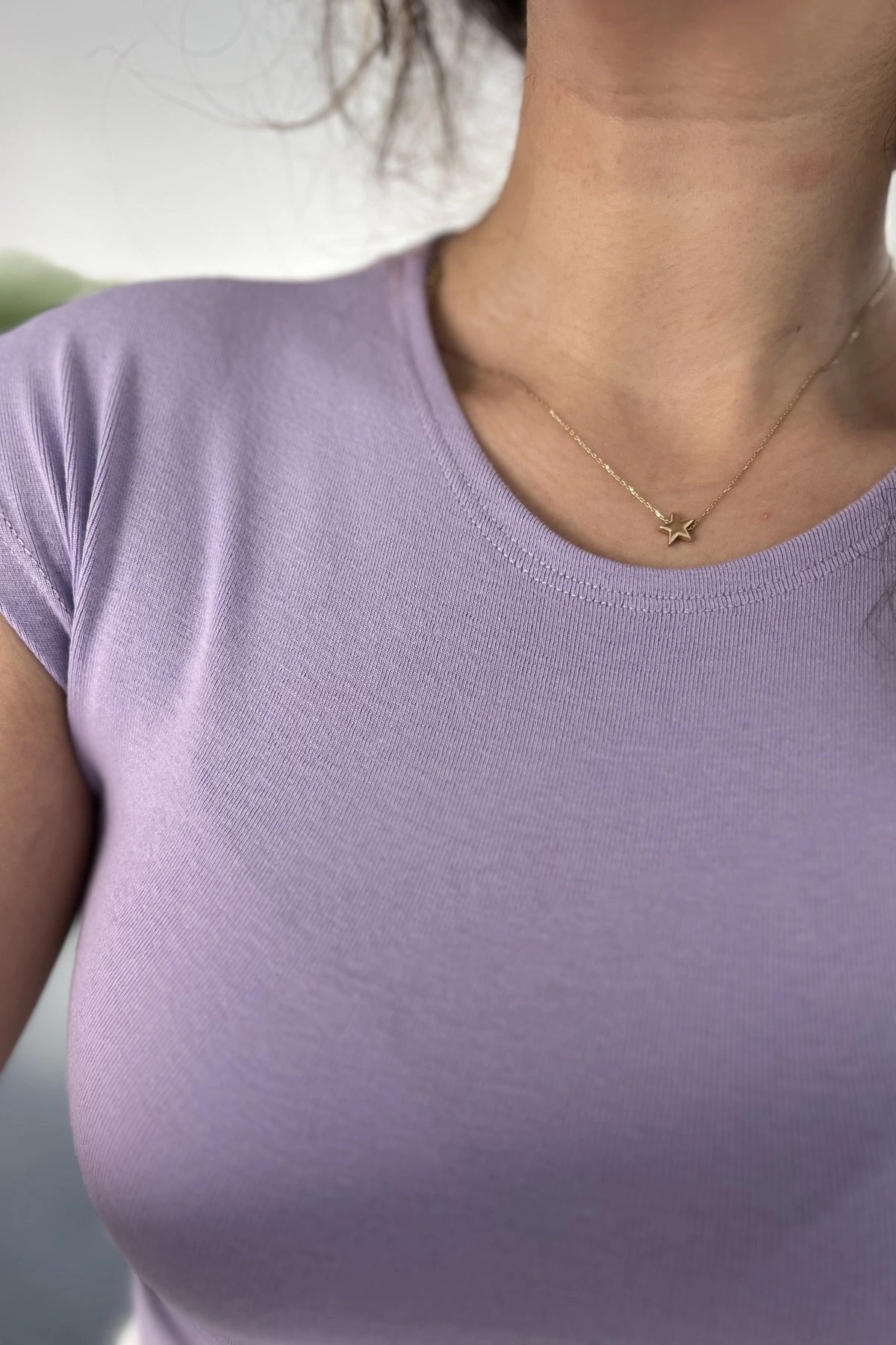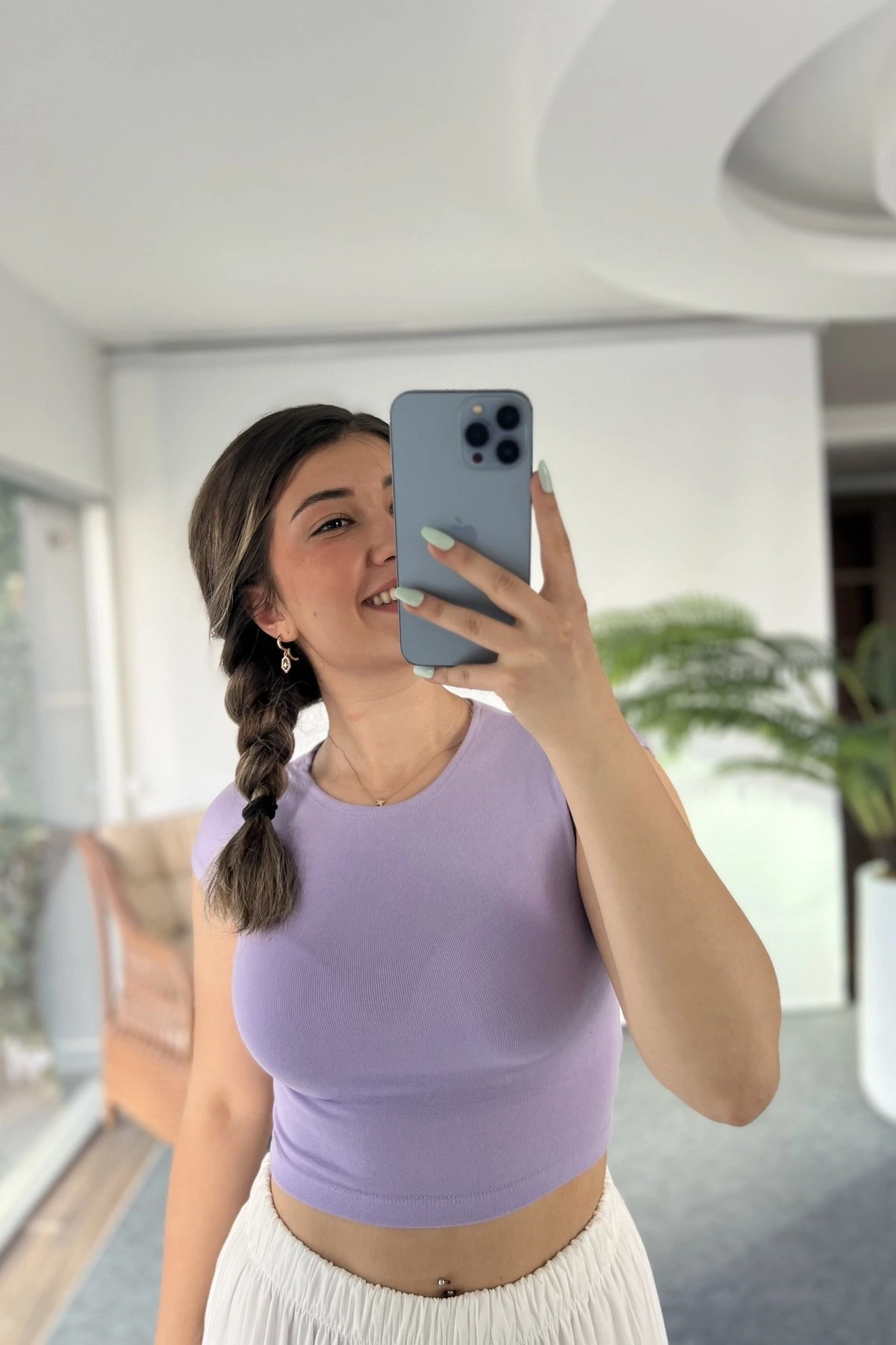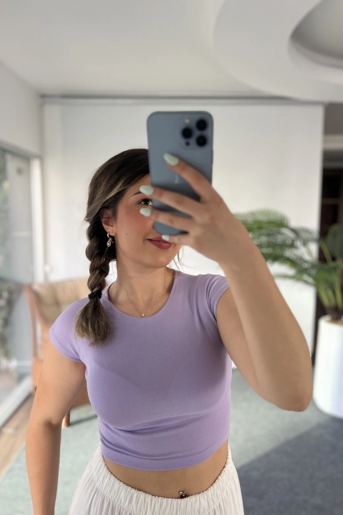 DÜŞÜK KOL MODAL PAMUK CROP TİŞÖRT – LİLA