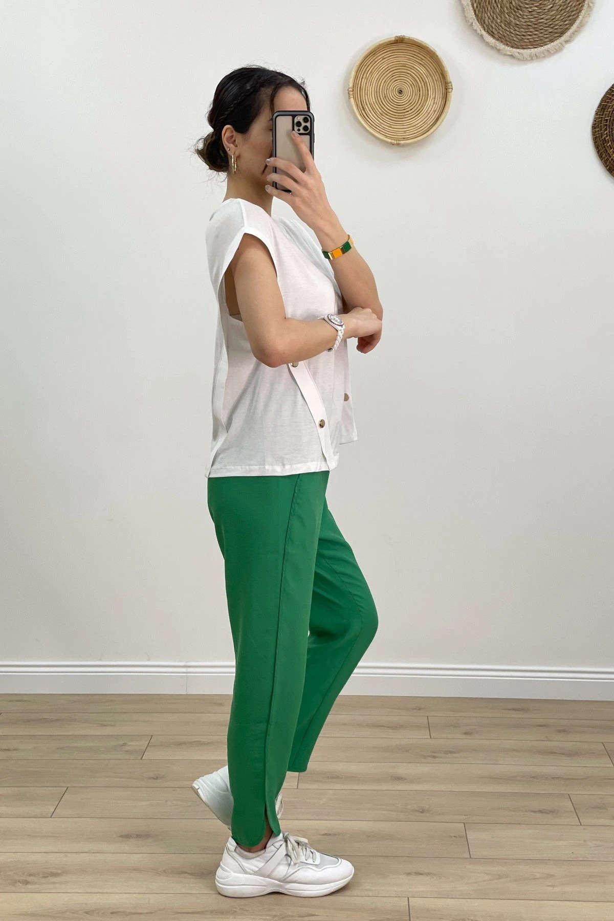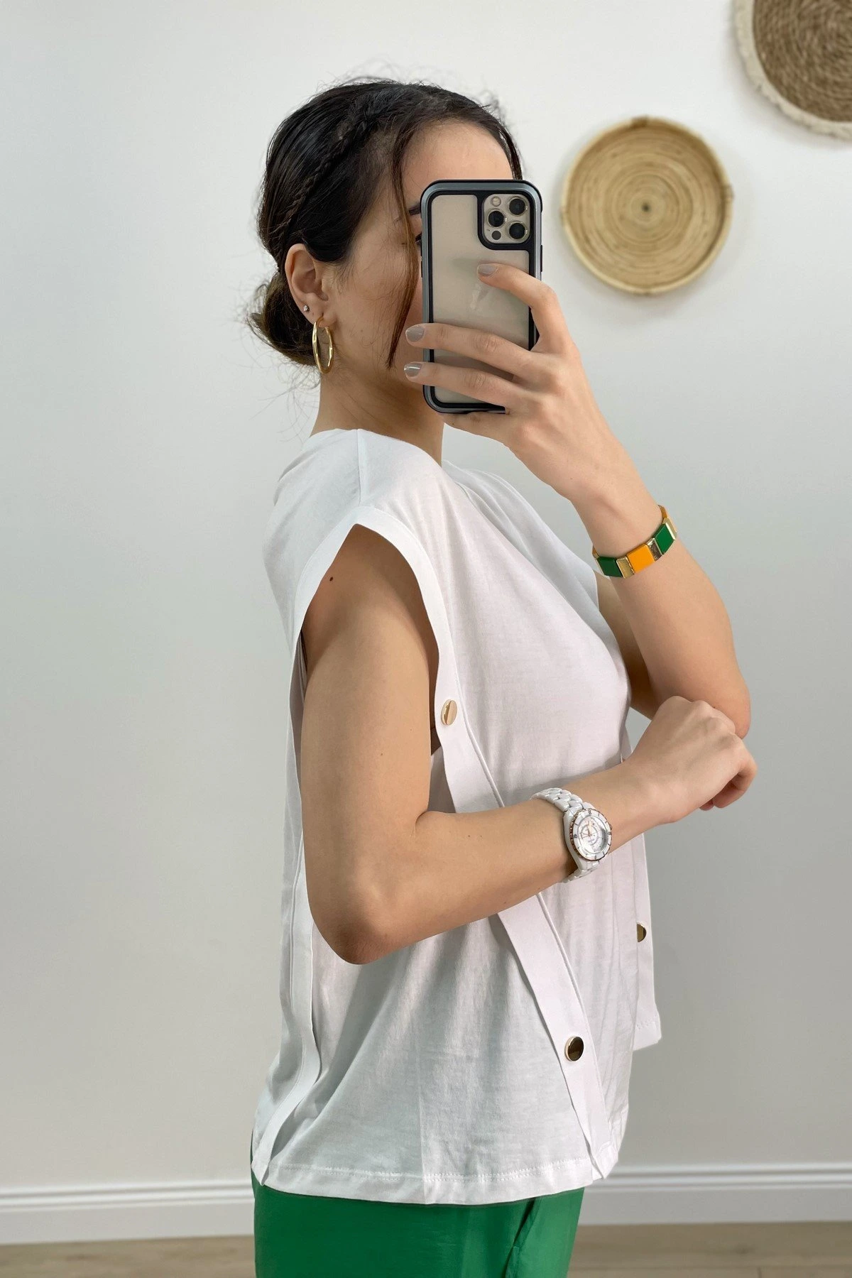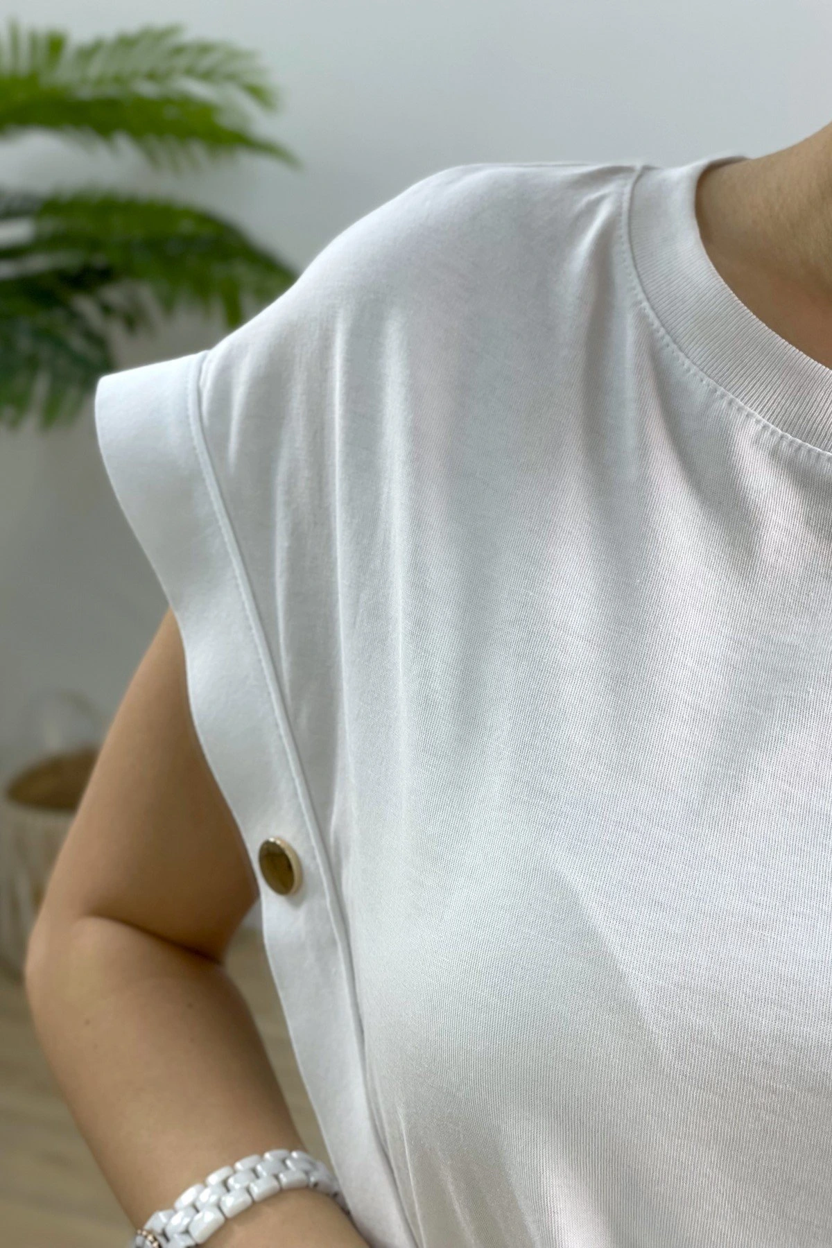 DÜŞÜK KOL YAN DÜĞMELİ TİŞÖRT – BEYAZ