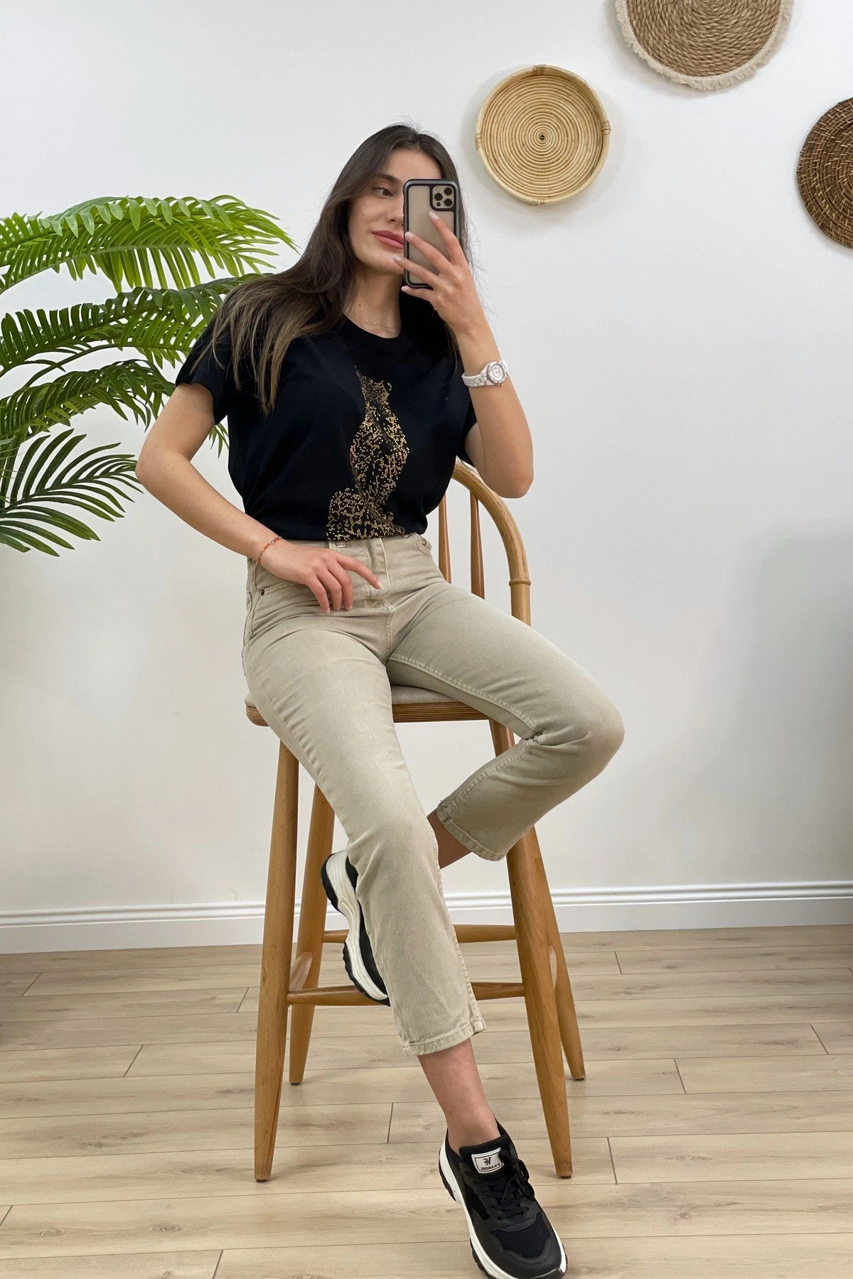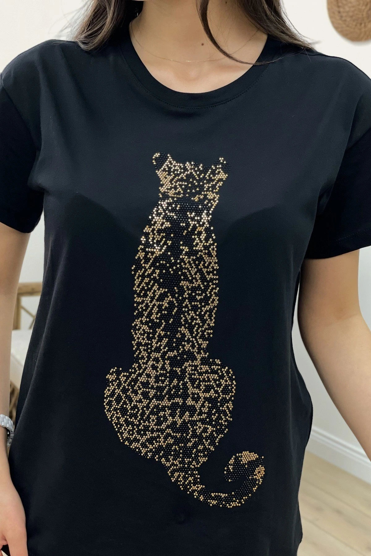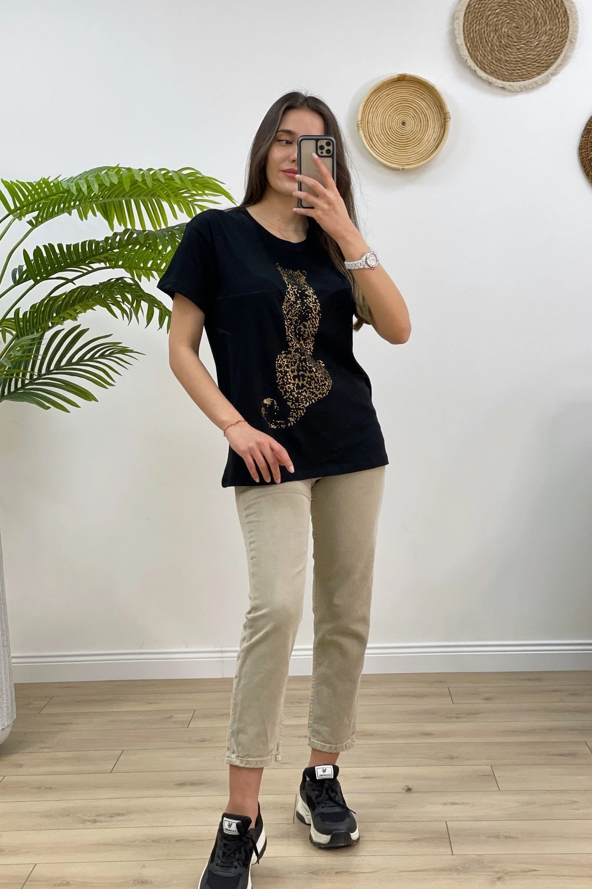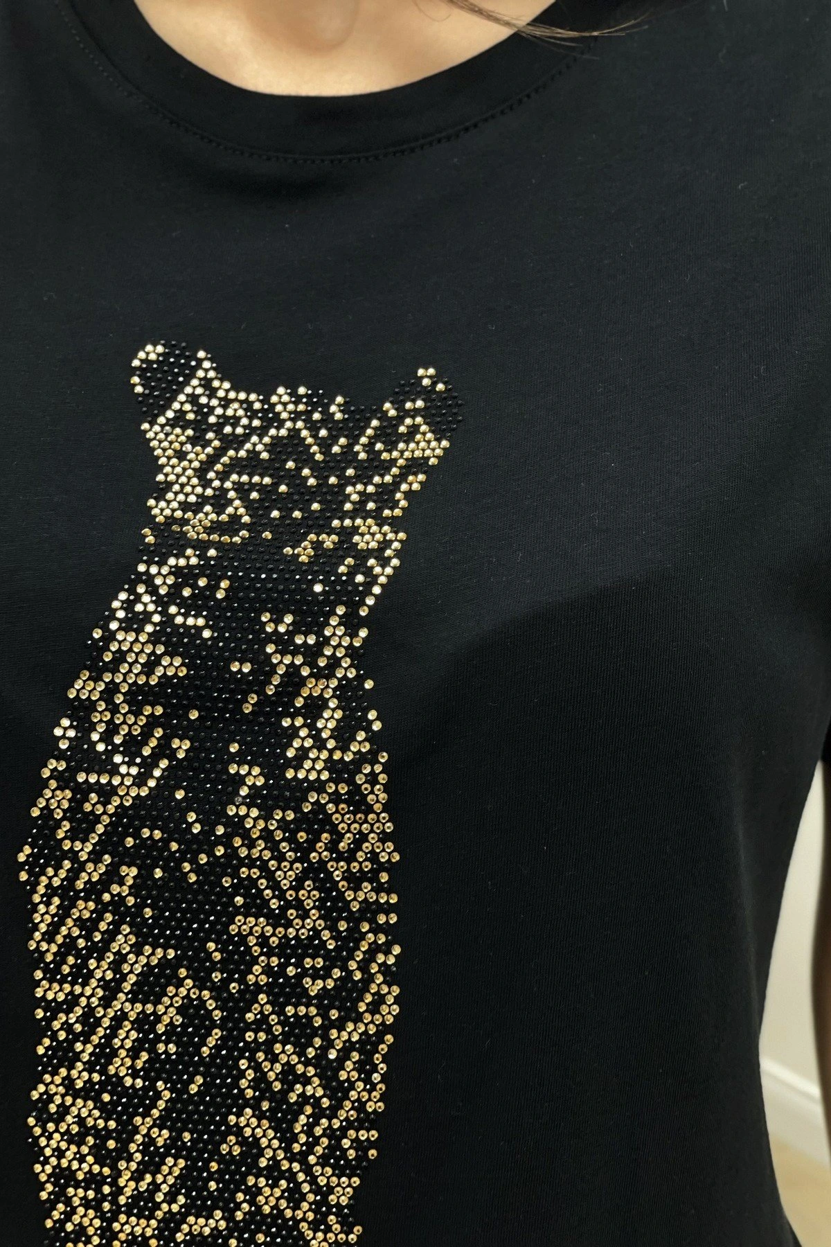 FİGÜR LEOPAR DESEN TAŞLI TİŞÖRT – SİYAH