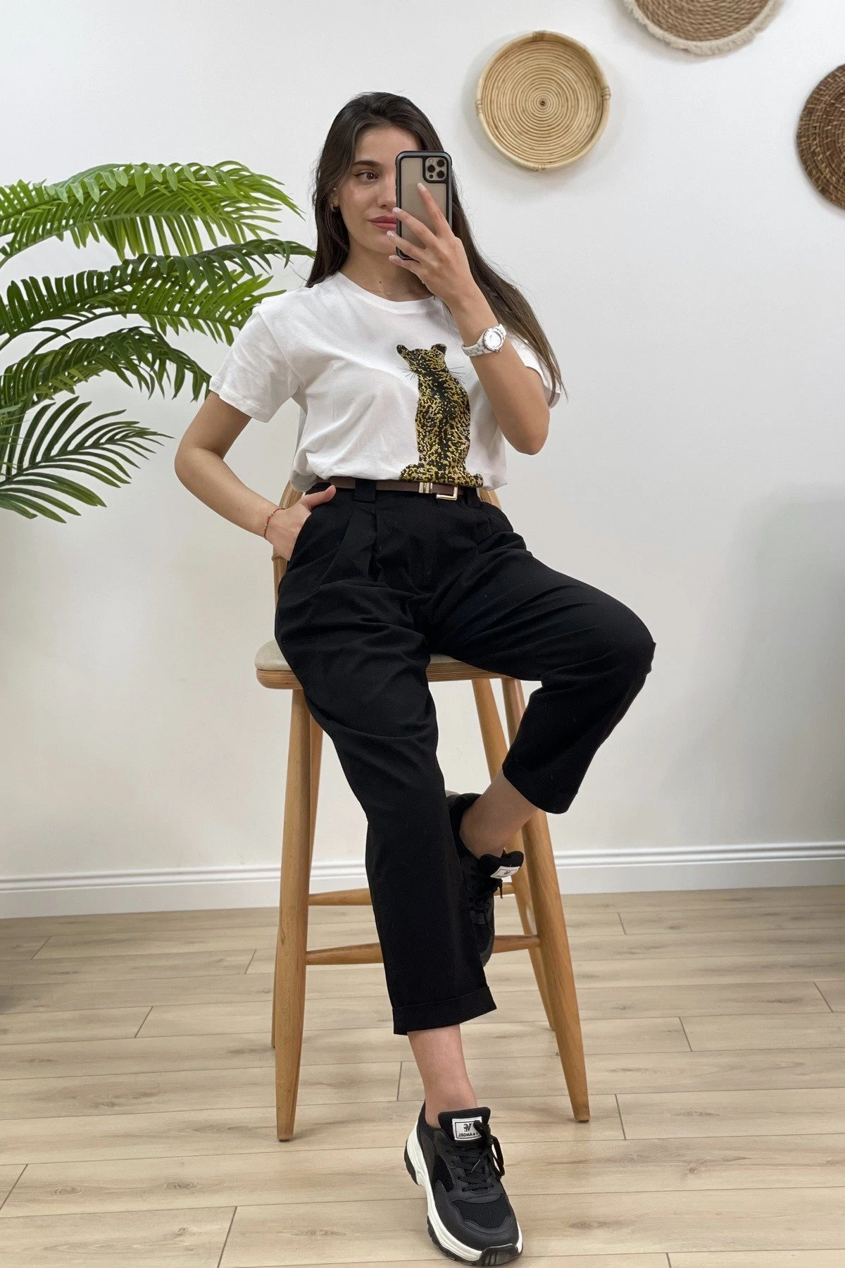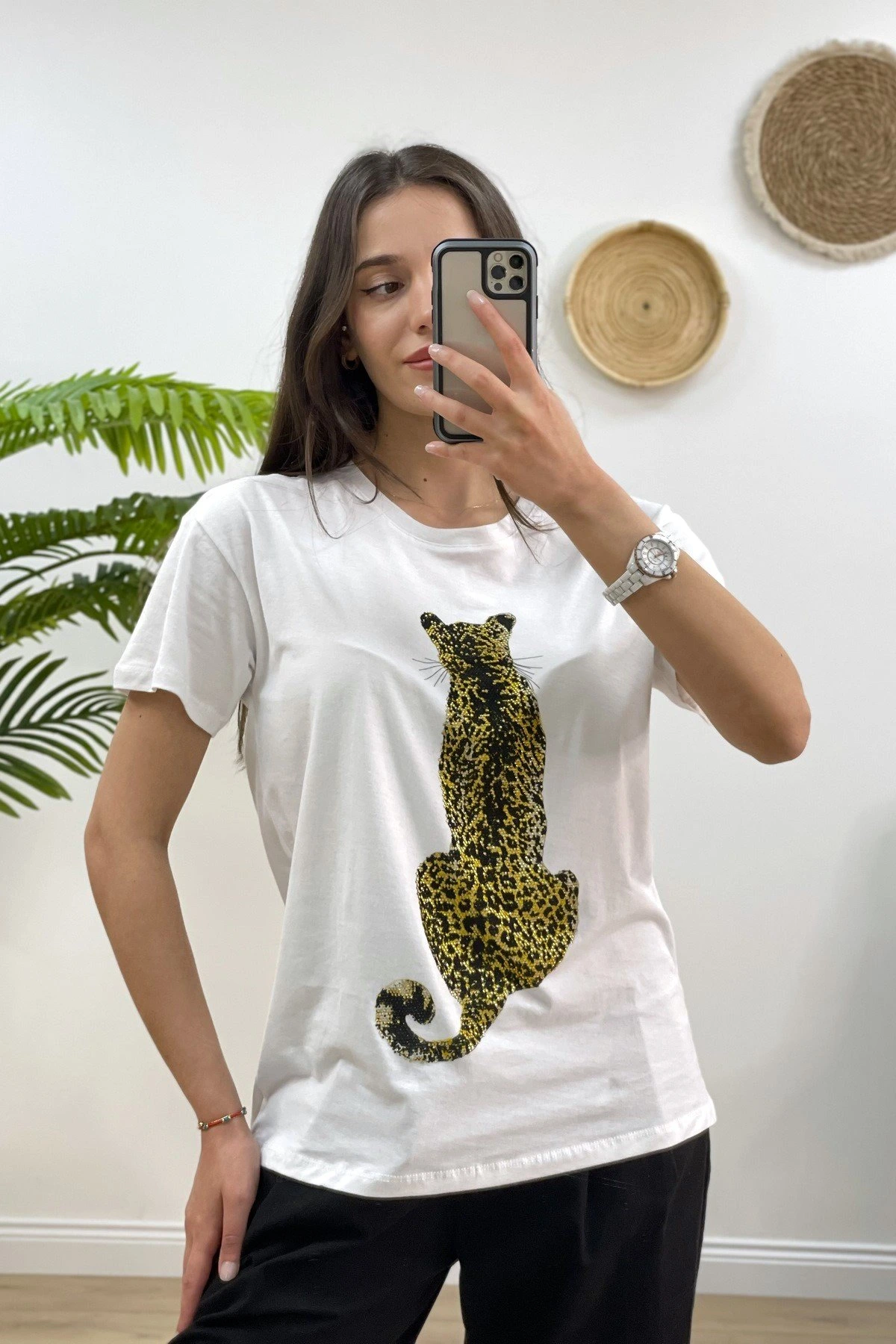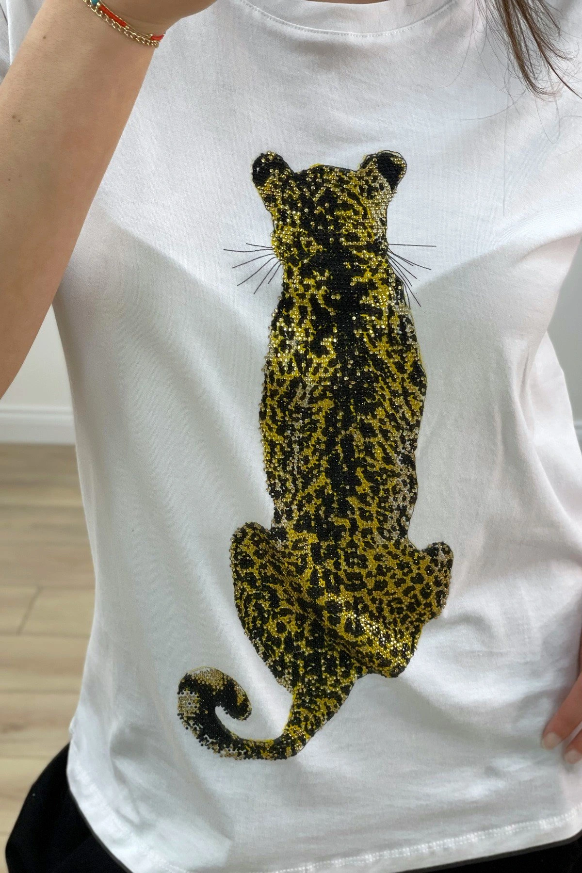 FİGÜR LEOPAR TAŞ BASKI TİŞÖRT – BEYAZ