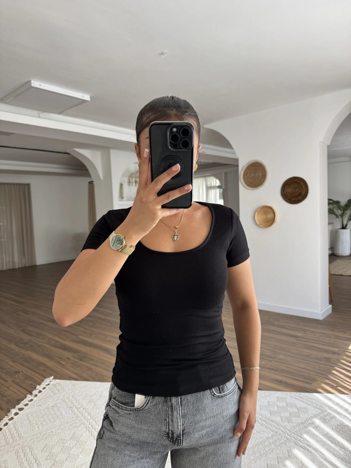 GENİŞ YAKA KISA KOL LİKRALI TİŞÖRT – SİYAH