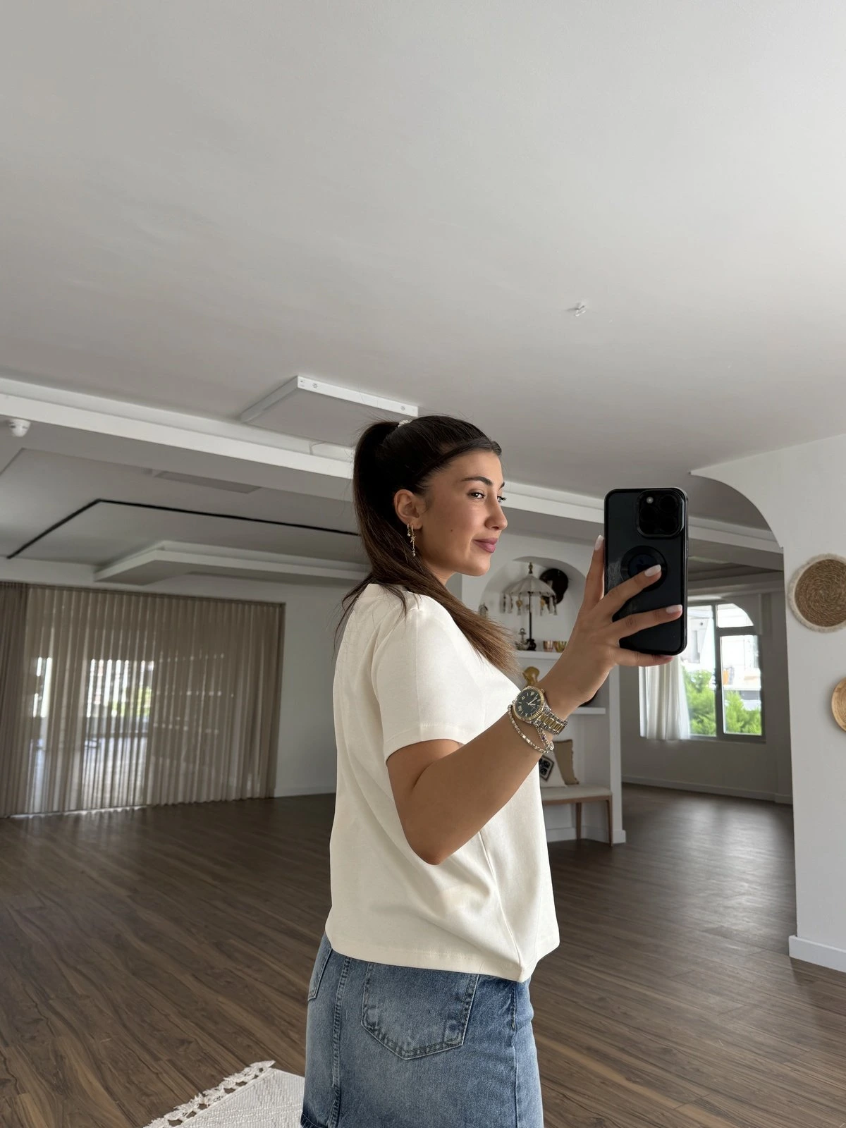KALP NAKIŞ DETAY BİSİKLET YAKA PAMUK TİŞÖRT – KEMİK