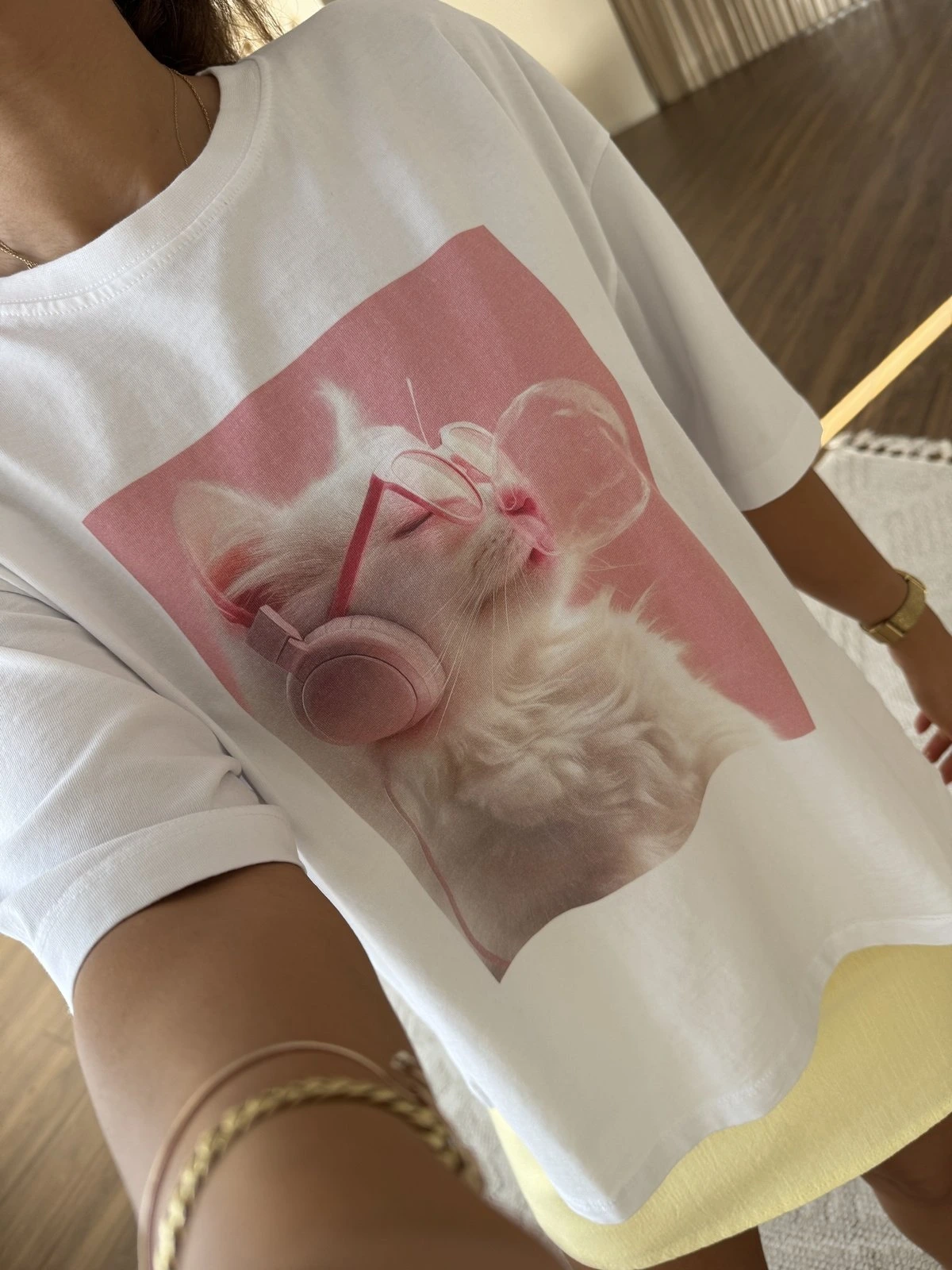 KEDİ BASKI SALAŞ PAMUK TİŞÖRT – BEYAZ