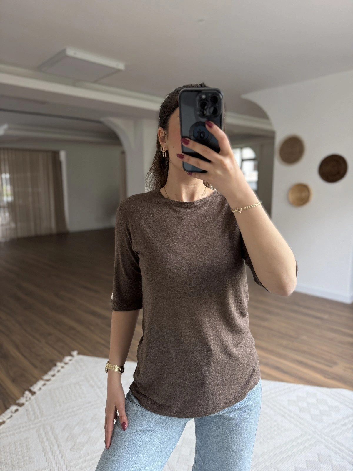 KOL ETİKET DETAY BİSİKLET YAKA DOKULU KETEN TİŞÖRT – VİZON