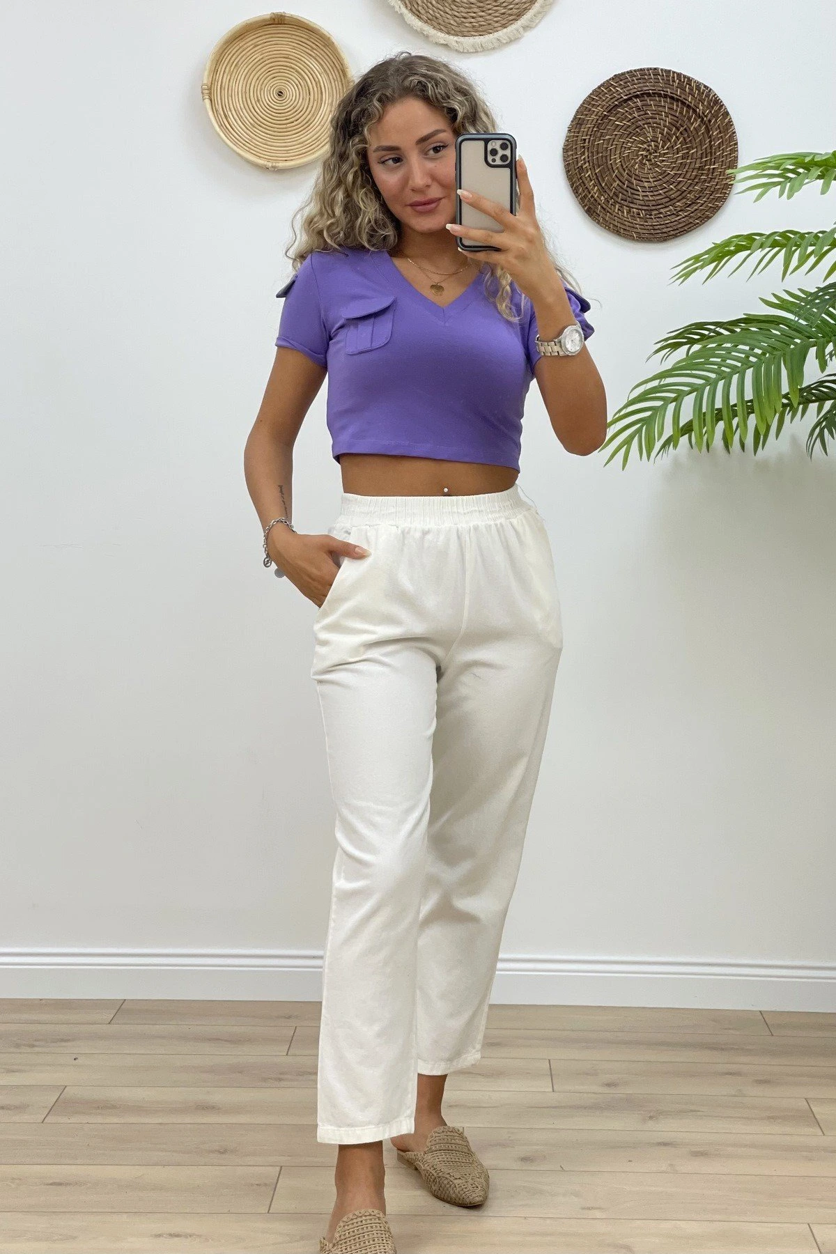 MİNİ CEP V YAKA CROP TİŞÖRT – MOR