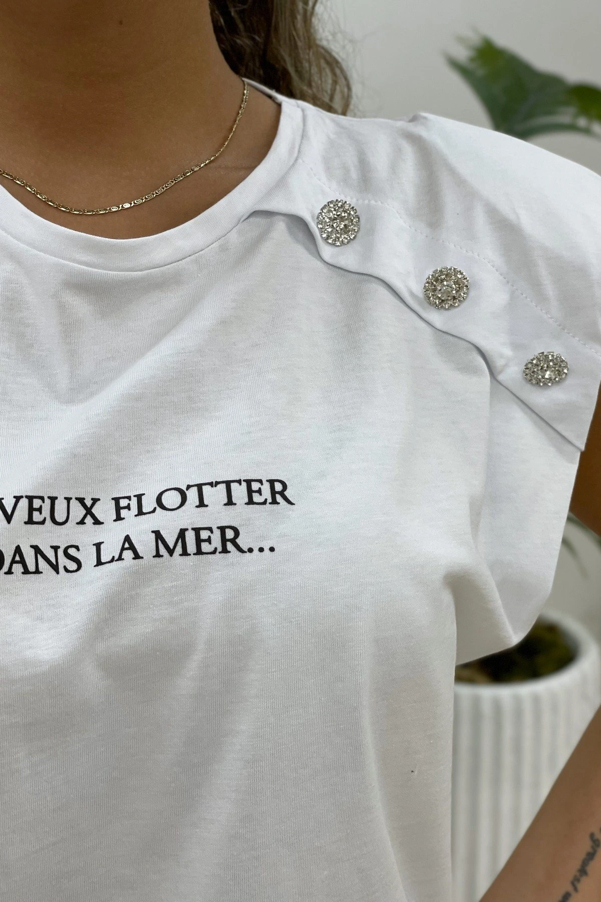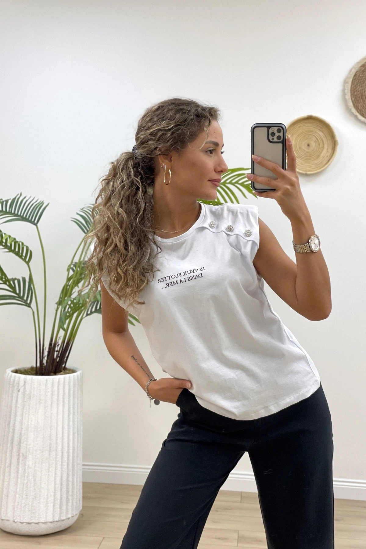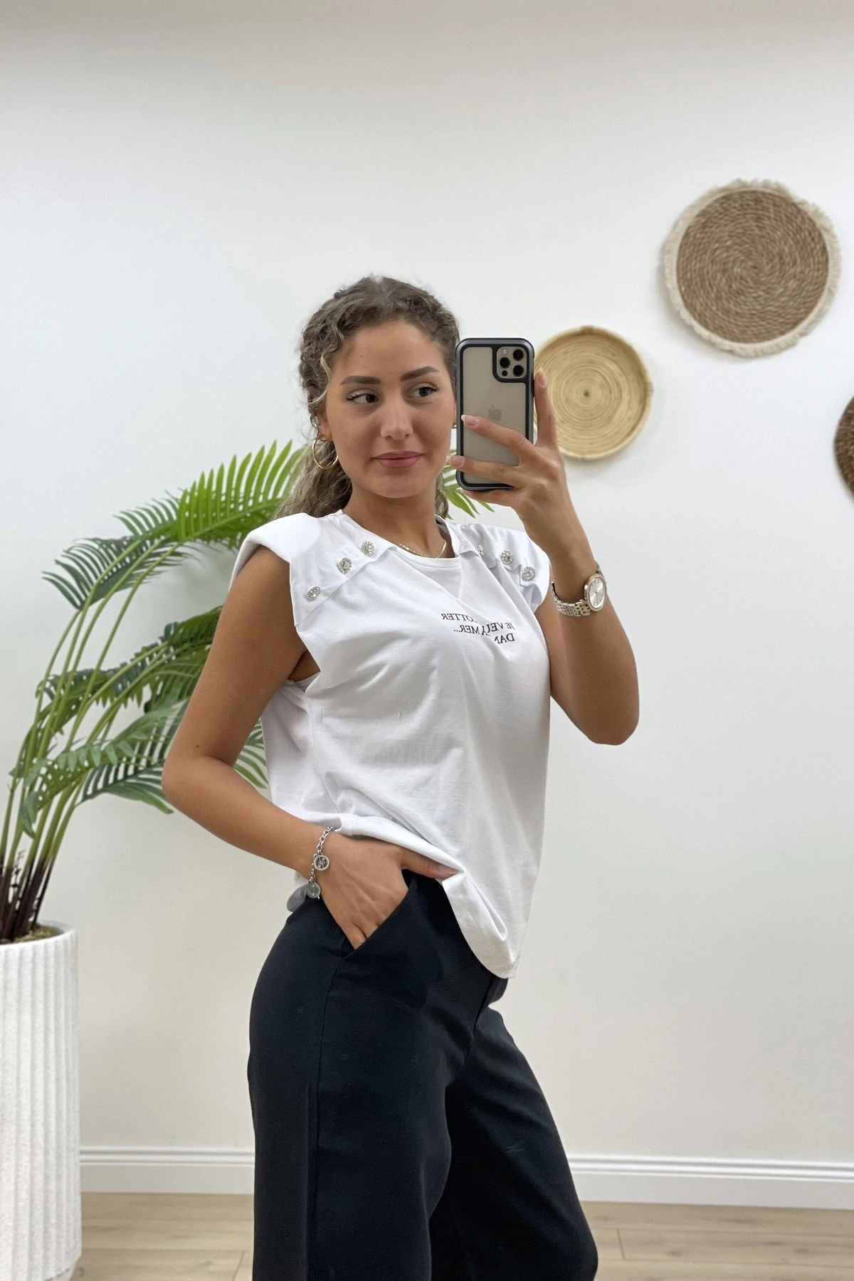 OMUZ TAŞ DÜĞME VATKALI TİŞÖRT – BEYAZ