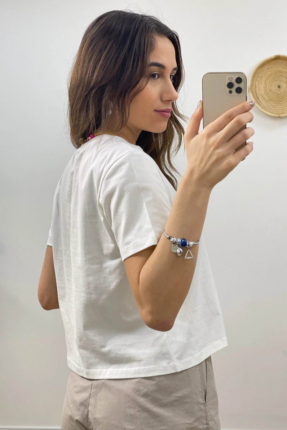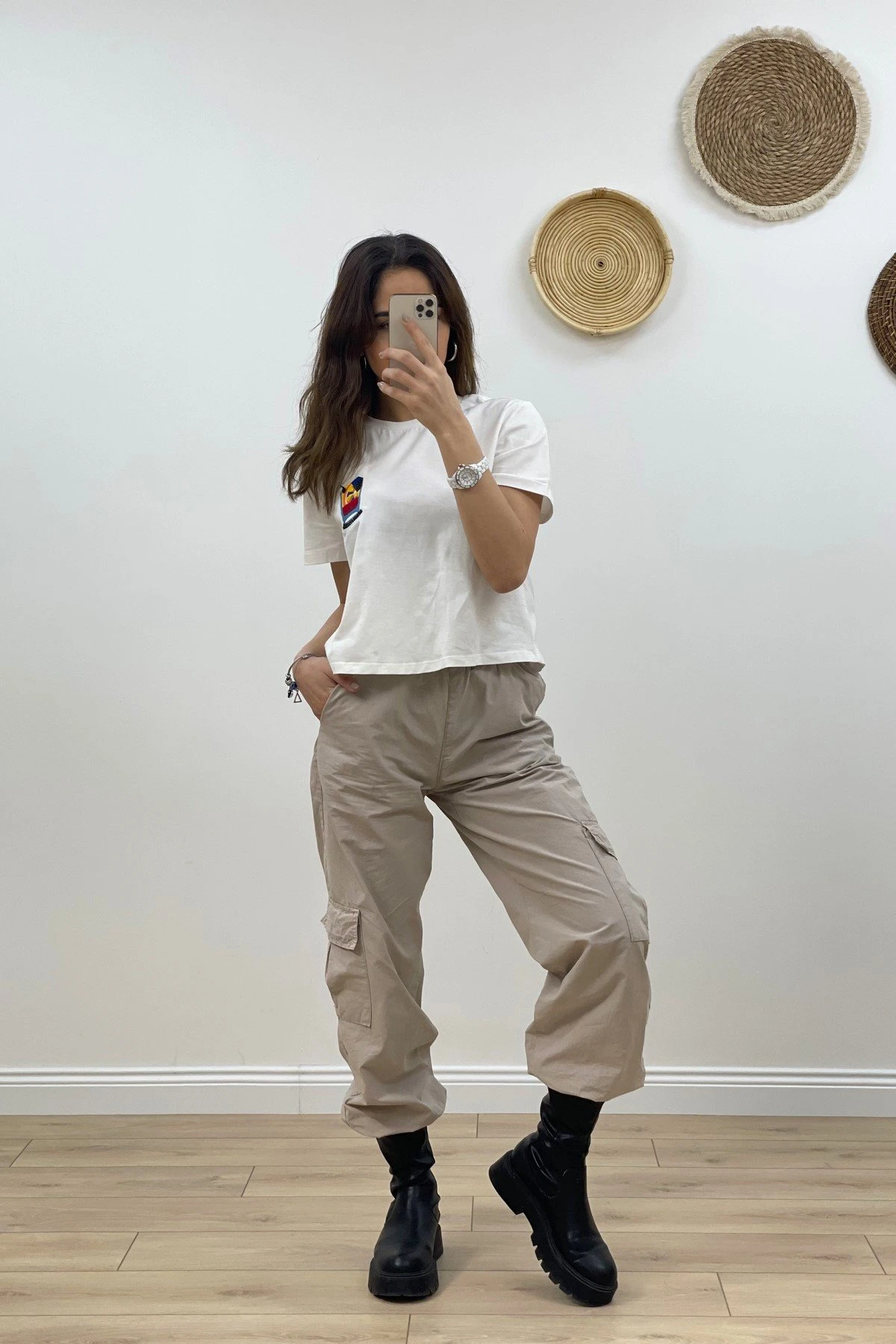 ÖN BONCUK VE NAKIŞLI KISA TİŞÖRT – EKRU